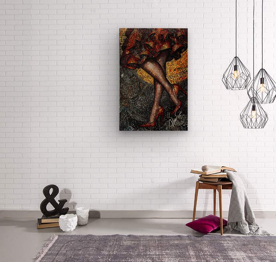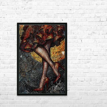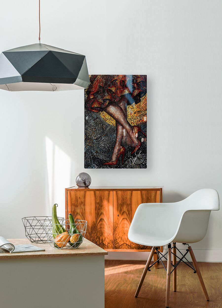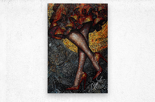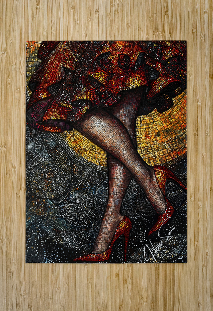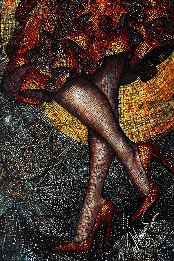 Midnight Tango is a captivating exploration of movement, color, and sensuality that merges high fashion with artistic flair. This mixed-media artwork captures the dramatic flair of a woman mid-step, her legs crossed elegantly in crimson high heels. The amber and dark silver hues blend seamlessly to create a stunning interplay of shadows and highlights, reminiscent of the dance floor under soft, intoxicating lights. Utilizing a pointillist approach, the piece features intricate dots and lines that draw the viewer into its optical illusion-like textures, with a crayon art feel that adds depth and dimension. The close-up focus showcases the rippling fabric of the mini-skirt, which cascades down like a fiery waterfall of reds and oranges. These intense colors seem to flicker like embers, surrounded by the darker, cosmic swirl of silver and black that evoke the feeling of a mysterious night. Every detail, from the glittering reflections to the texture of the hosiery, is meticulously crafted, creating a psychedelic patchwork effect that feels both tactile and dreamlike. This artwork combines the whimsy of crayon-like strokes with the precision of a pointillist’s eye, blending classic elegance with an urban twist. It’s a dance of textures and tones, a visual symphony that transports the viewer to a realm where fashion becomes art and movement tells a story.