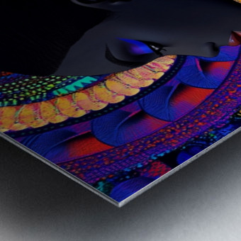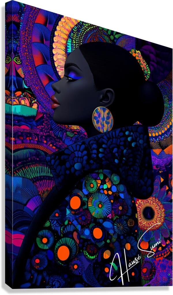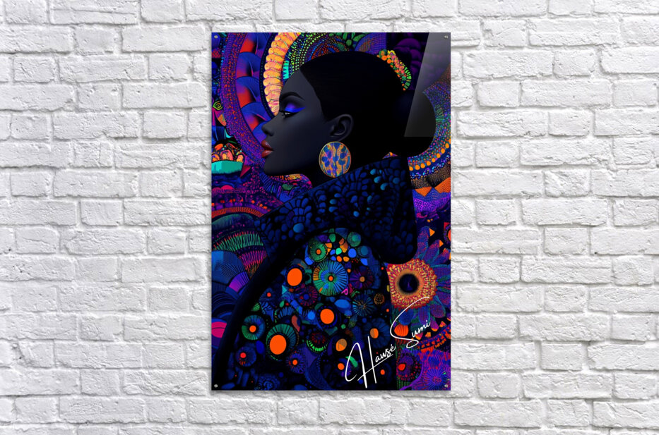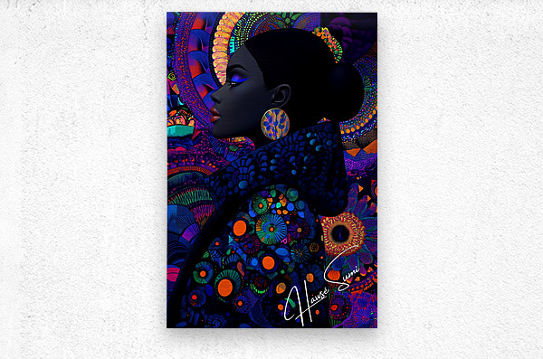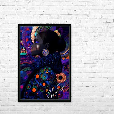 This piece features a side profile of a woman with radiant, cosmic-inspired motifs surrounding her. The intricate textures and vibrant colors blend in swirling, floral patterns, evoking a sense of otherworldly beauty and empowerment. Color Palette: Deep midnight blue, electric oranges, neon greens, and subtle shades of violet. Texture & Style: Smooth digital textures with layered, mosaic-like details; a blend of abstract and Afro-futuristic aesthetics.