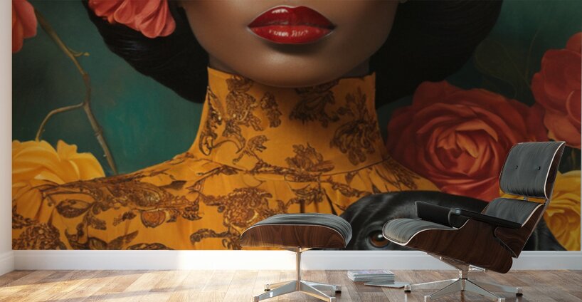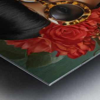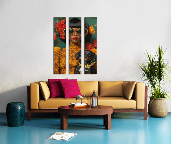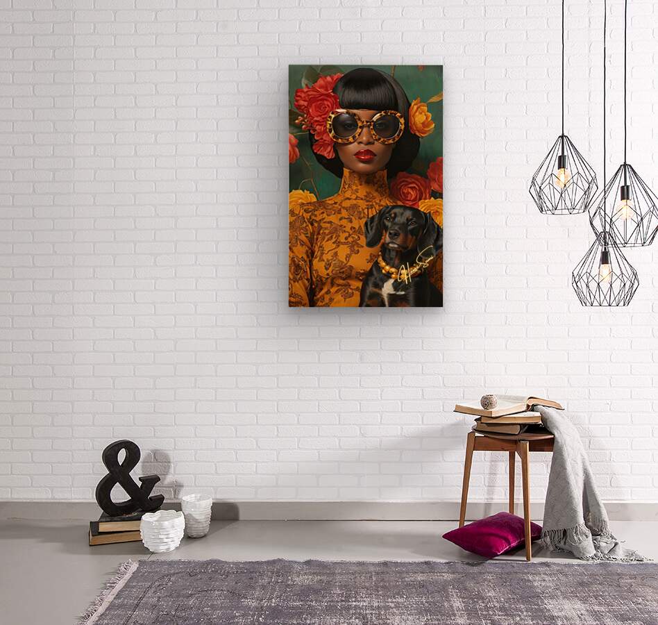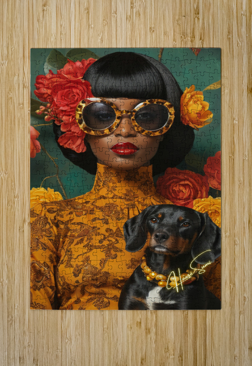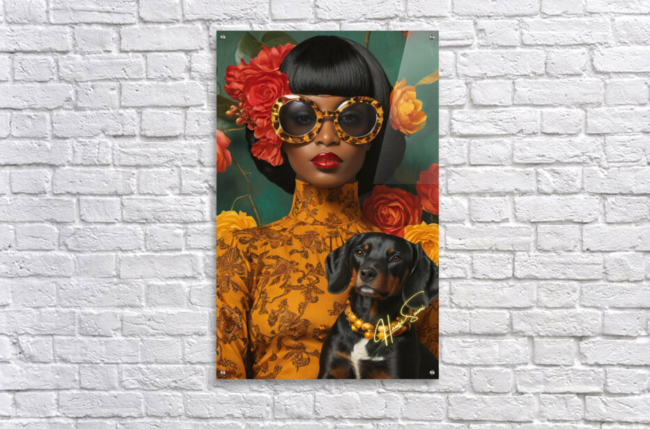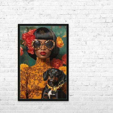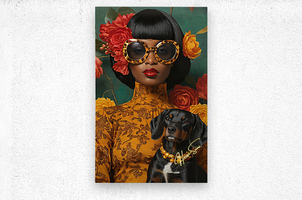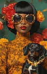A vision of bold femininity, she commands attention with oversized leopard-print sunglasses and a high-neck golden dress adorned with intricate floral patterns. Her dog, dressed in matching pearls, is more than a pet—it’s a symbol of shared refinement, loyalty, and quiet strength. Against the lush green and warm reds, she is both art and artist, a muse of her own making.