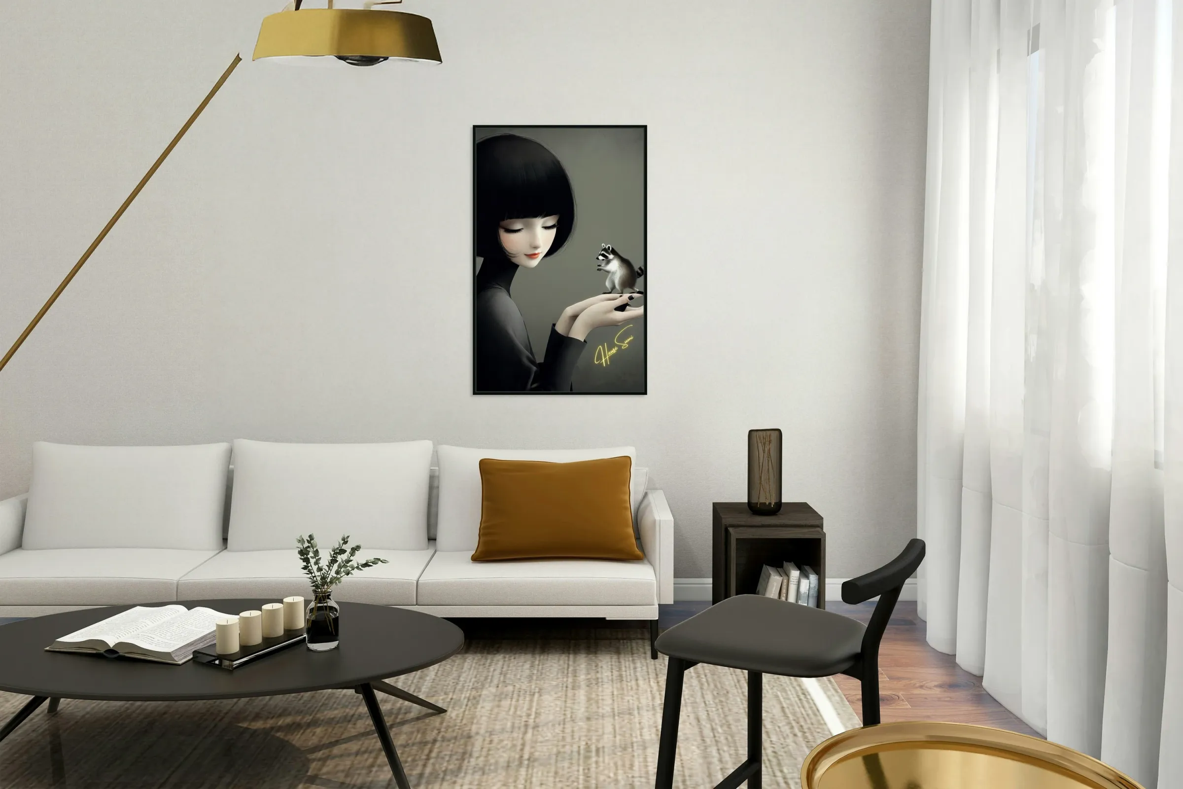 In a quiet, intimate moment, a delicate woman holds a tiny raccoon in her hands, an embodiment of trust and curiosity. The monochrome elegance of her presence contrasts the wild innocence of the creature, symbolizing the balance between nature and refinement, mystery and familiarity.