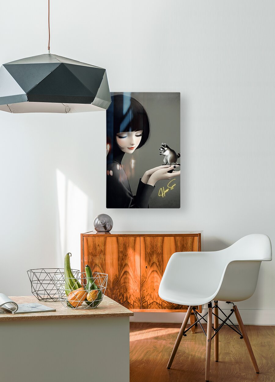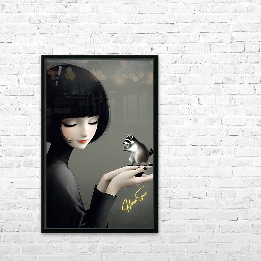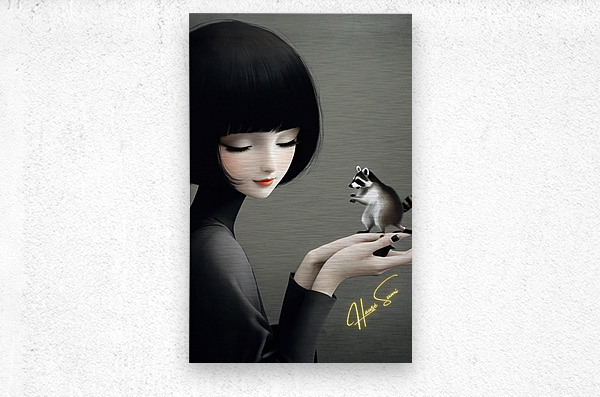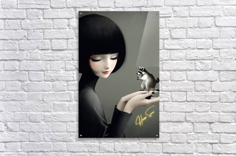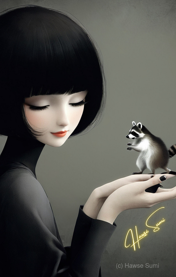 In a quiet, intimate moment, a delicate woman holds a tiny raccoon in her hands, an embodiment of trust and curiosity. The monochrome elegance of her ...[+]