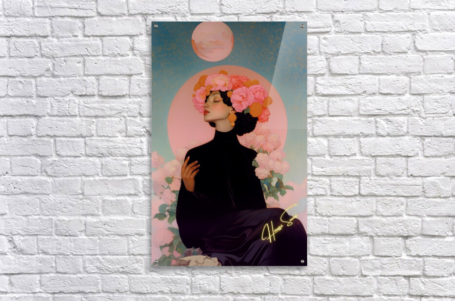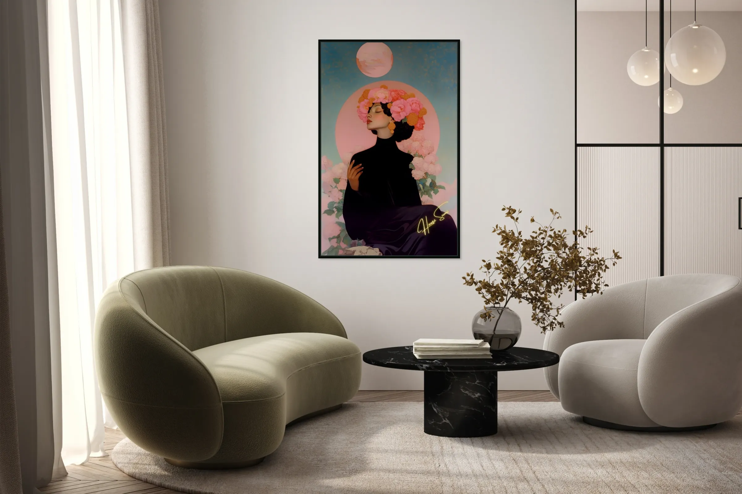 A celestial goddess bathed in soft pinks and gold, her presence radiates serenity and divine femininity. The floating moon mirrors her aura, as if she commands the universe with effortless grace. Flowers crown her like a queen of the cosmos, each petal whispering secrets of power, beauty, and transformation.