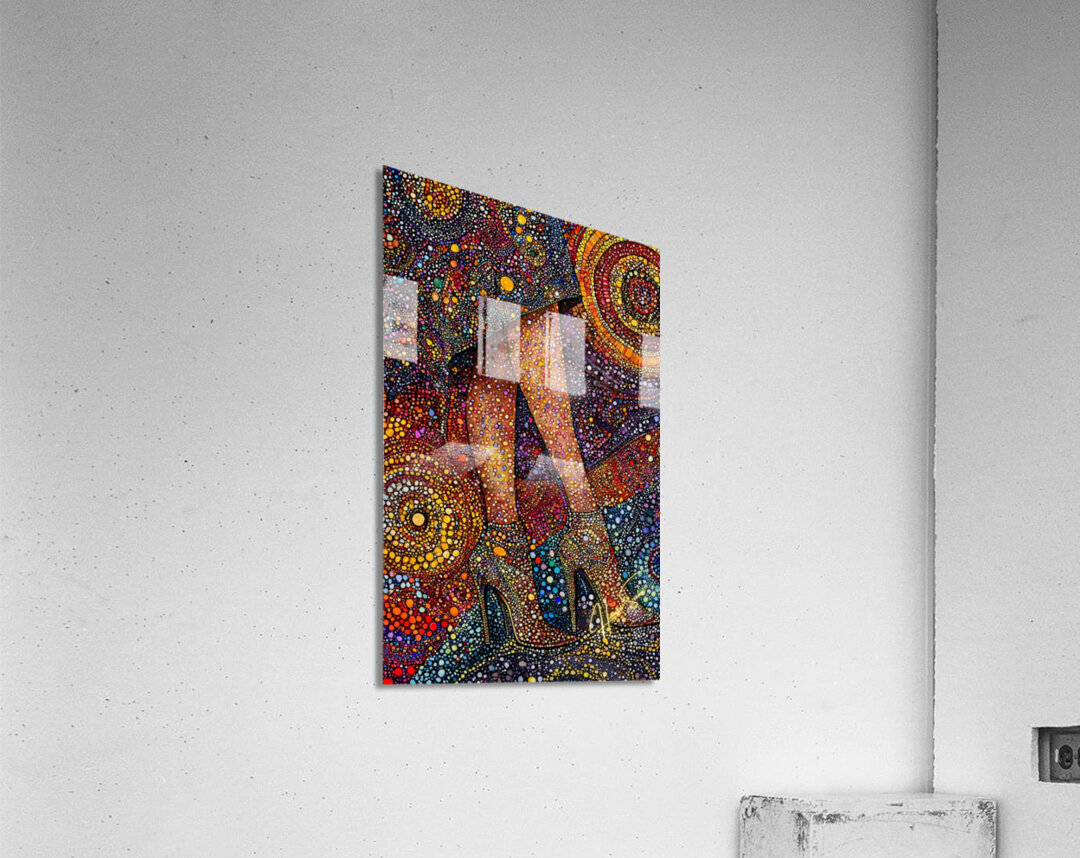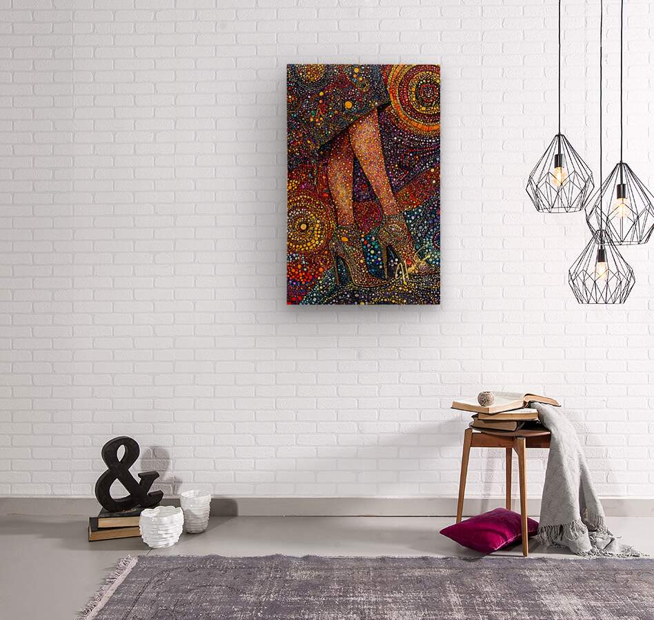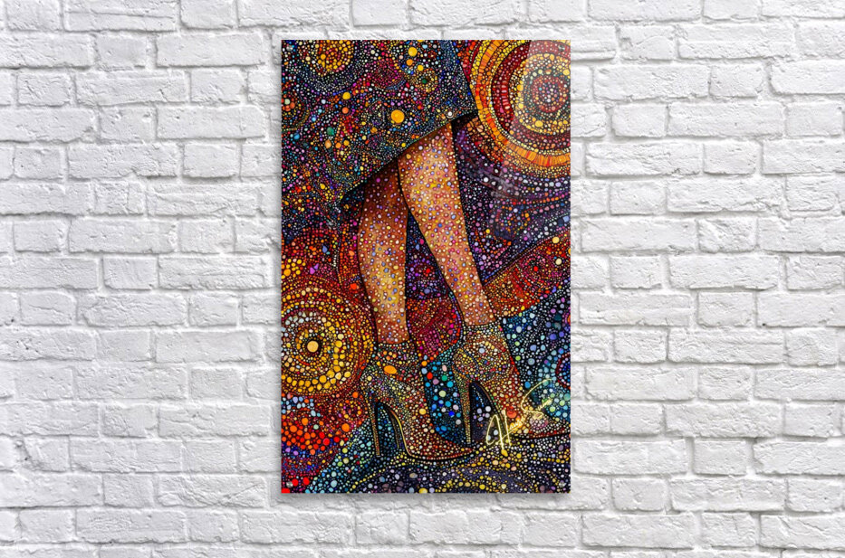 A woman’s poise captured in vibrant pointillist patterns, each dot a different shade of power, grace, and confidence. The golden heels become a statement—an anchor amidst the whirlpool of color that radiates boundless energy and charisma.