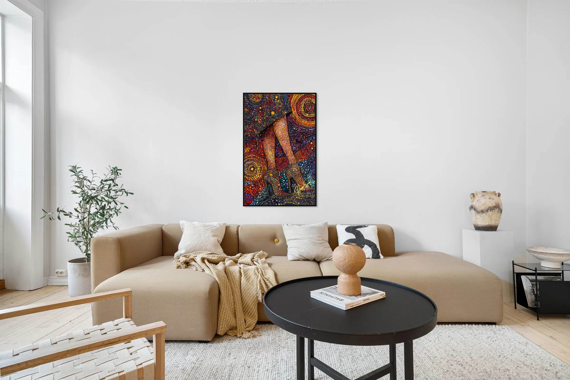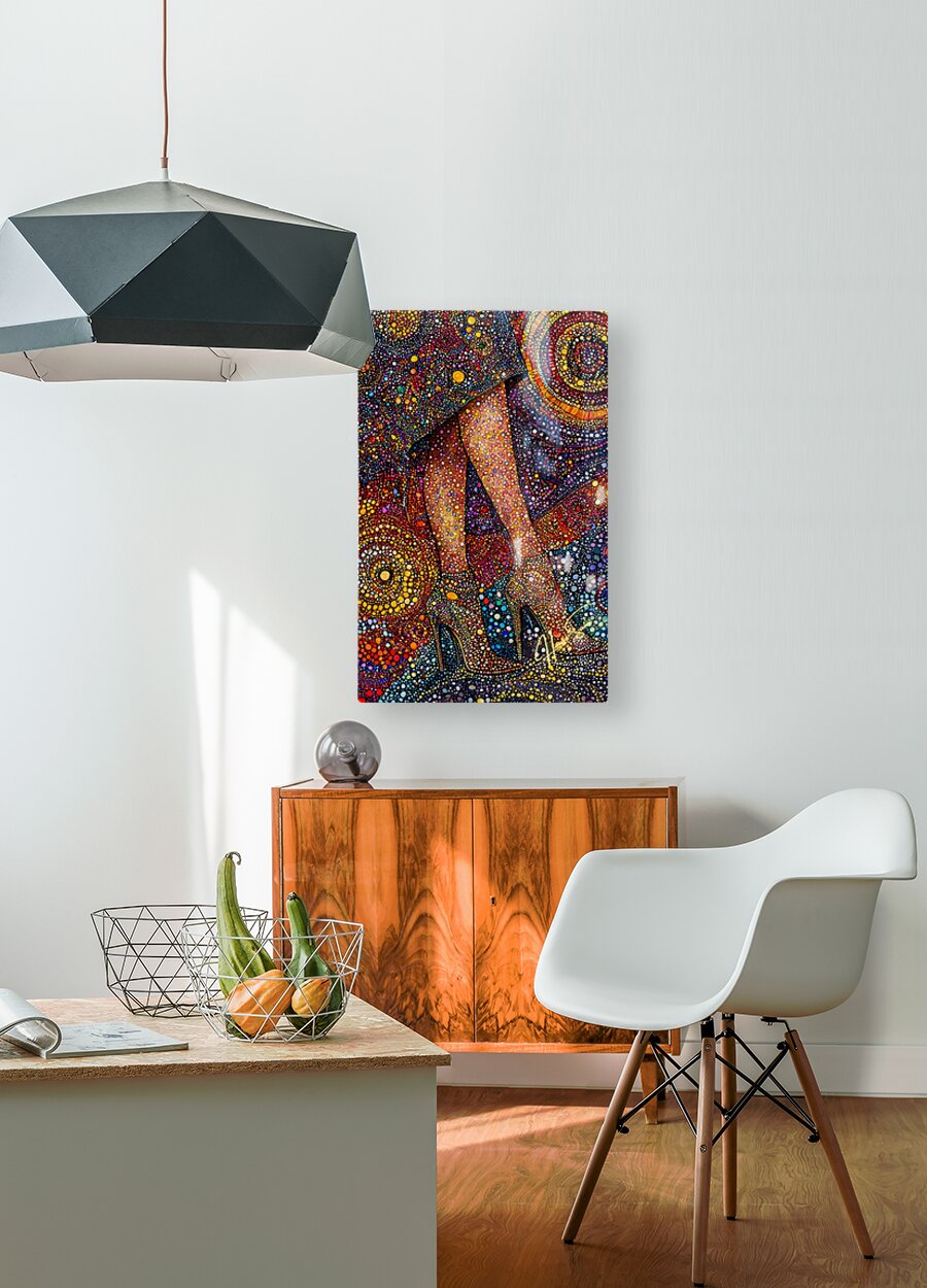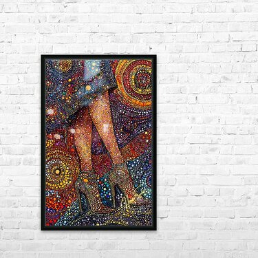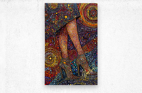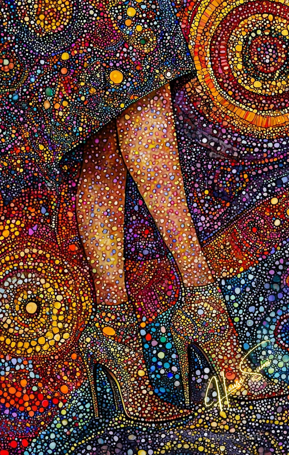 A woman’s poise captured in vibrant pointillist patterns, each dot a different shade of power, grace, and confidence. The golden heels become a stat...[+]