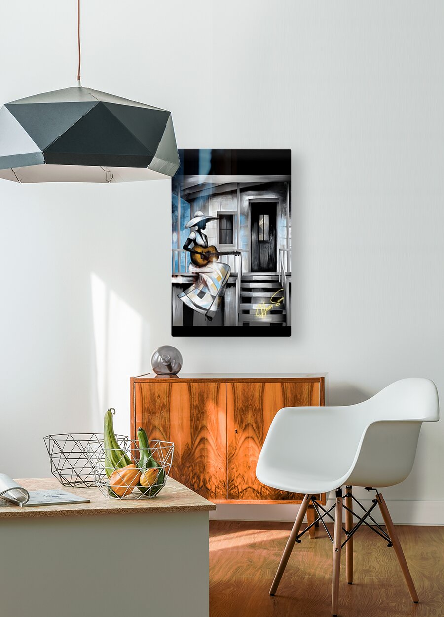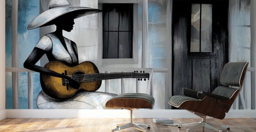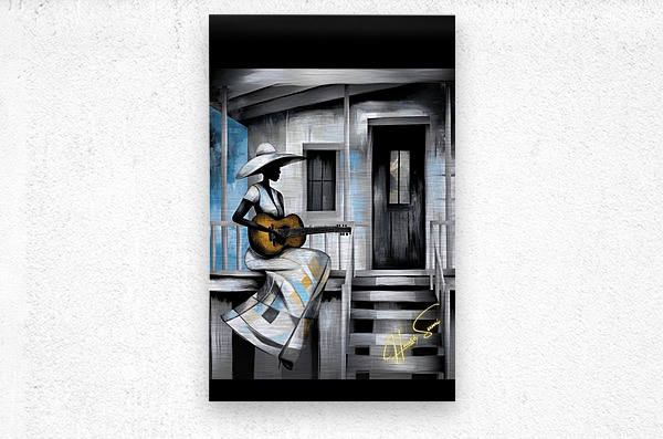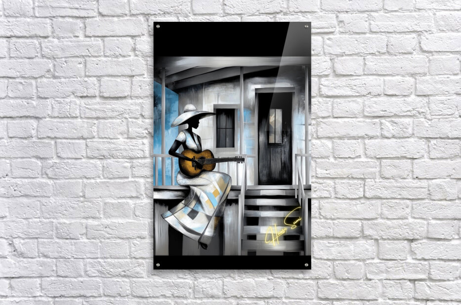 A woman sits on the steps of her weathered home, her guitar a companion to her thoughts. The blue and gray tones speak of nostalgia, resilience, and the silent strength of a storyteller. Each note she plays carries generations of voices that once lived in this very space.