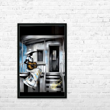 A woman sits on the steps of her weathered home, her guitar a companion to her thoughts. The blue and gray tones speak of nostalgia, resilience, and t...[+]