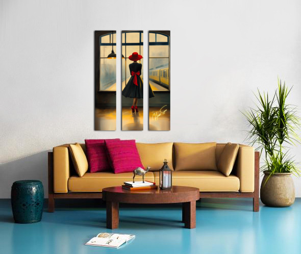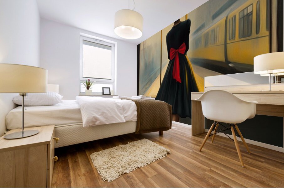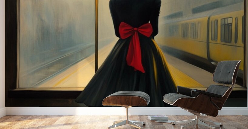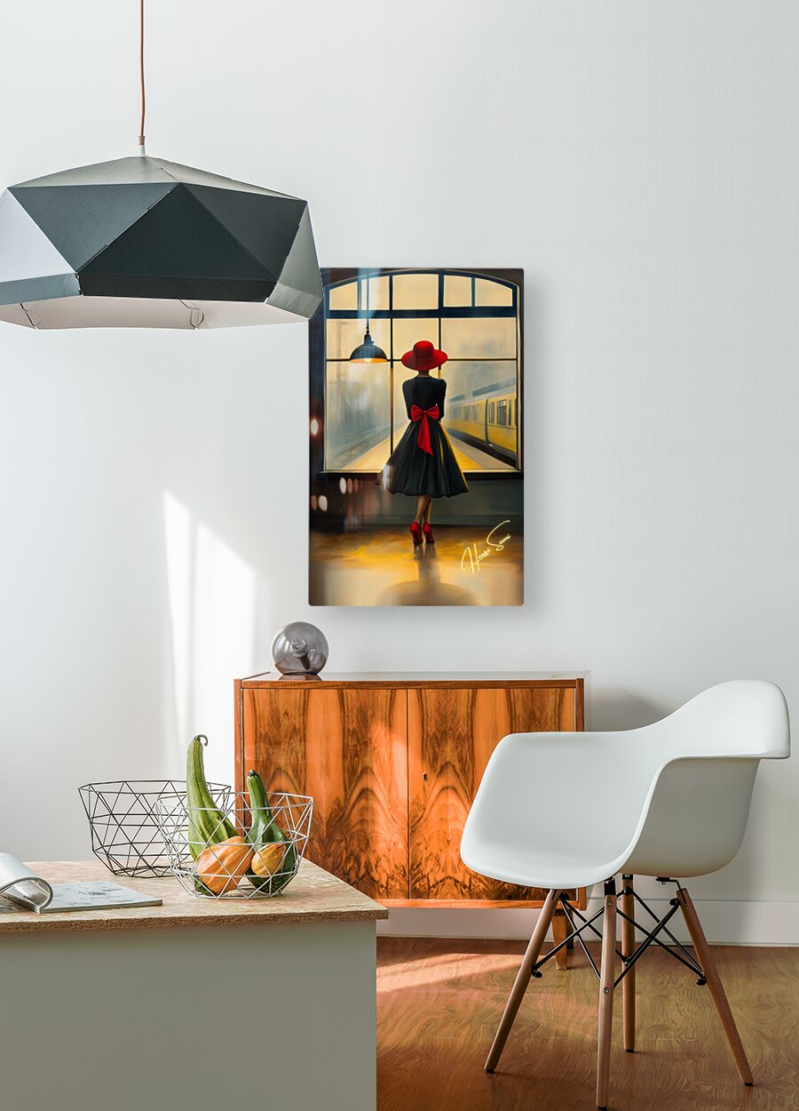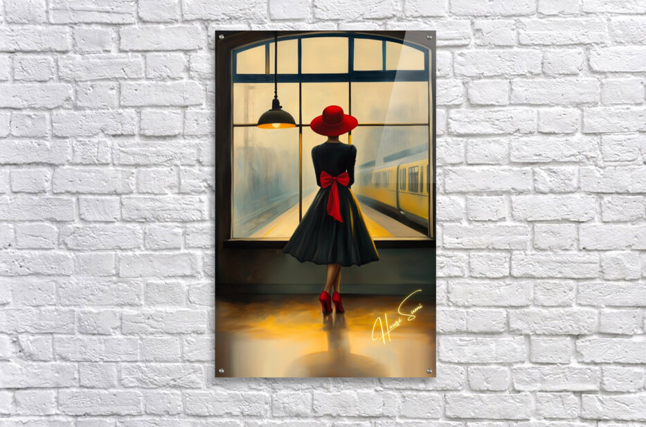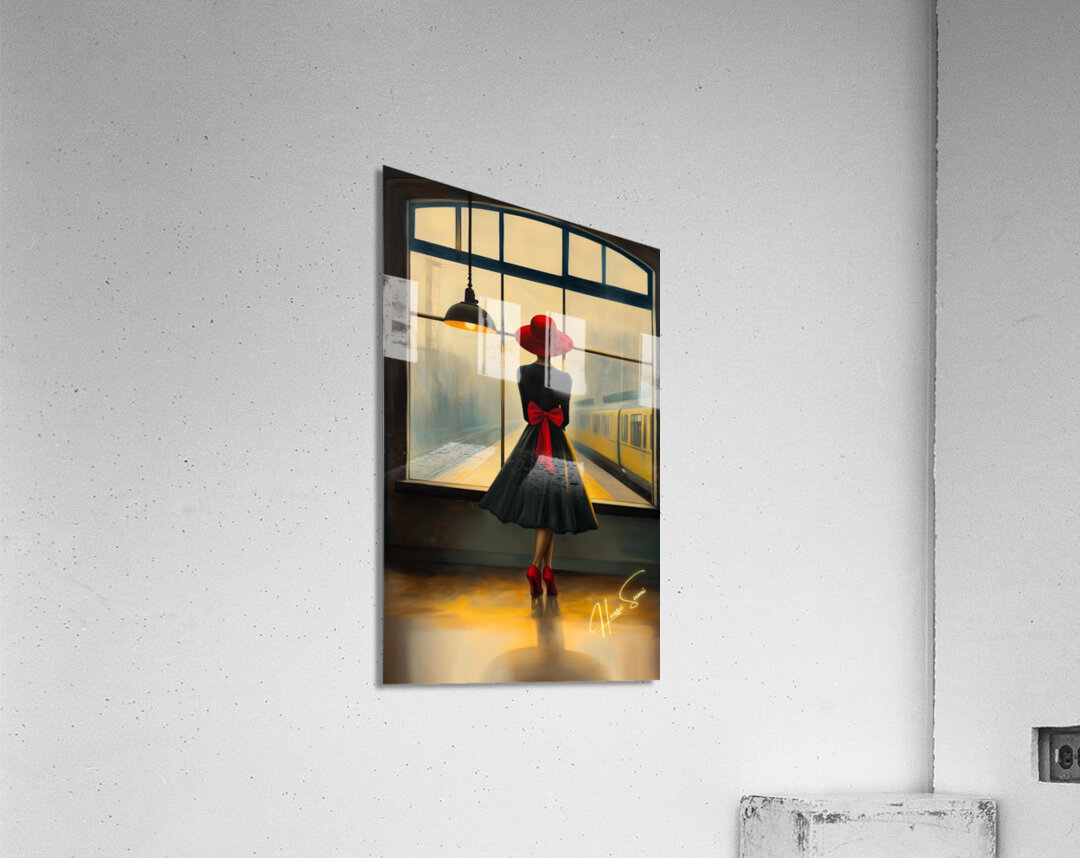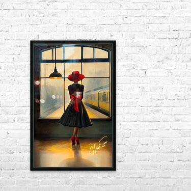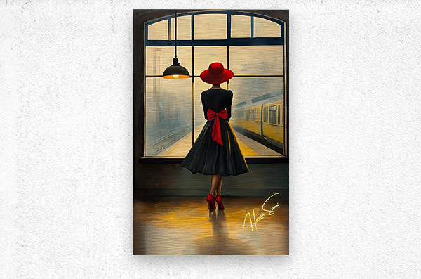 She stands at the station, waiting, reflecting. The golden light casts a warm farewell, but where is she going? A journey into the unknown, or a return home? The red hat and bow symbolize passion and purpose, a striking contrast against the muted tones of the station’s quiet hum.