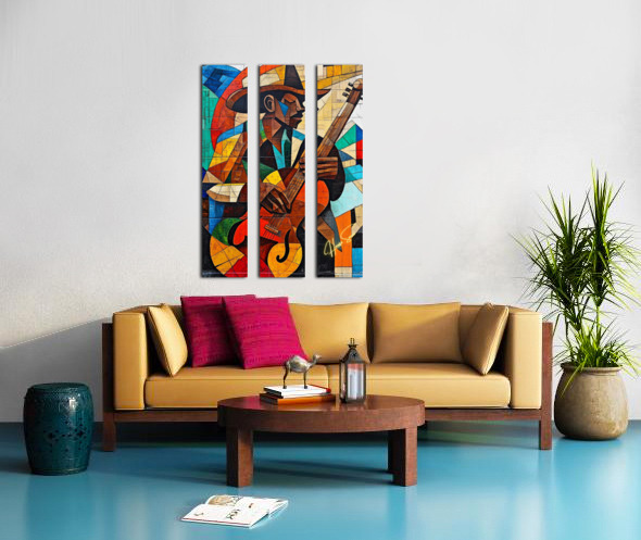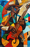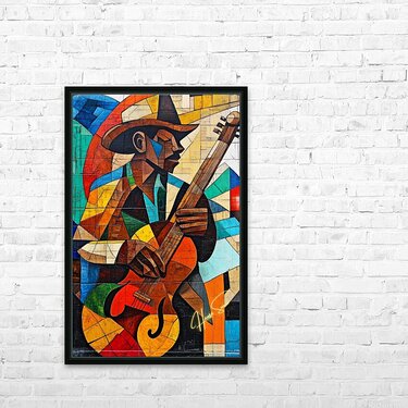 A soulful guitarist strums against a backdrop of cubist abstraction, where warm hues of sun meet the cool whispers of the blues. Every note, every bru...[+]