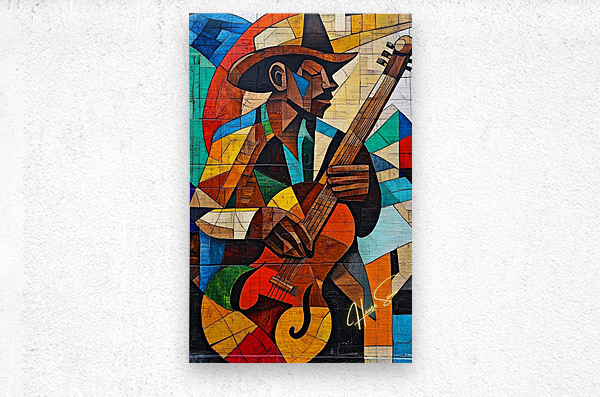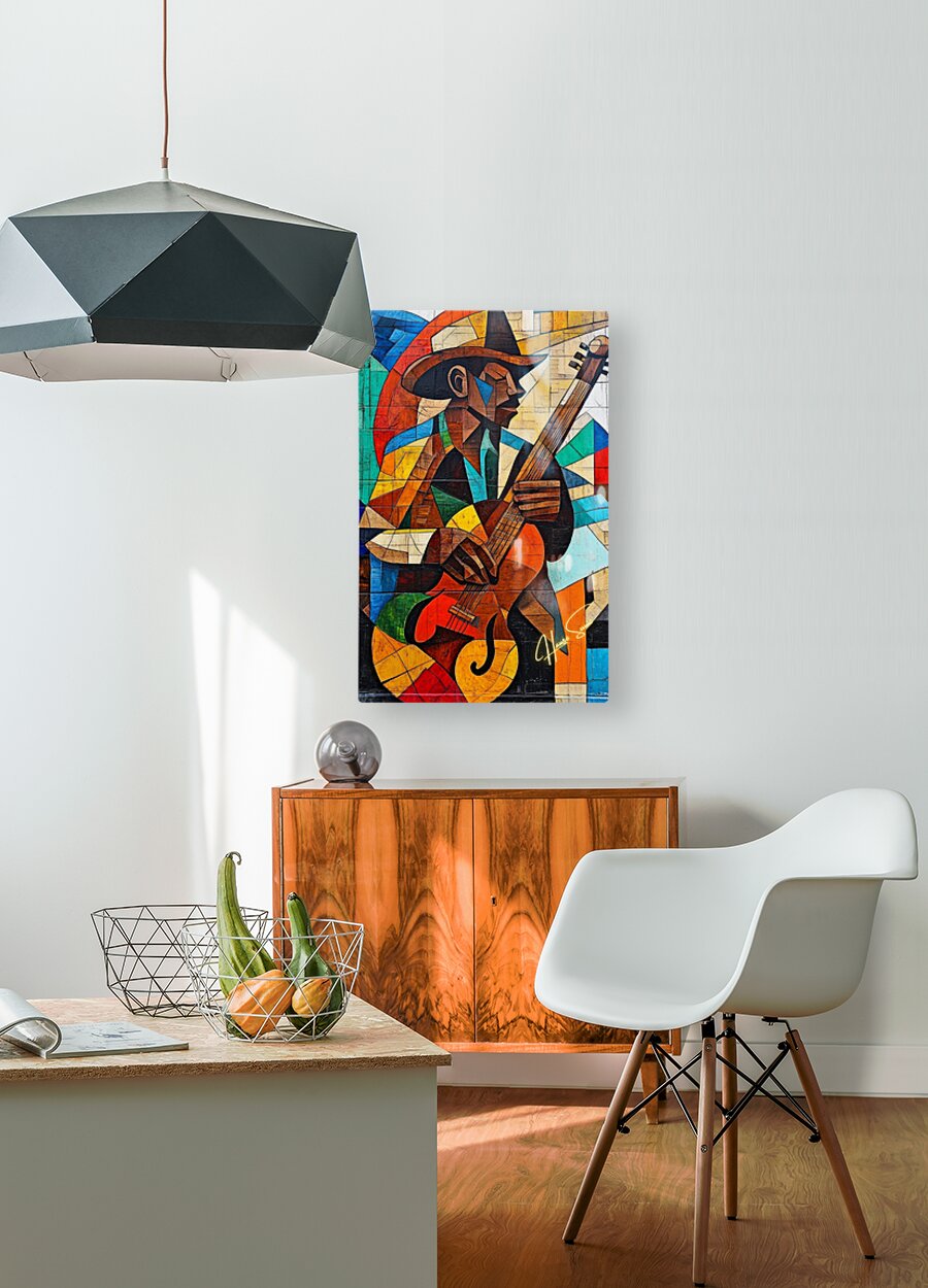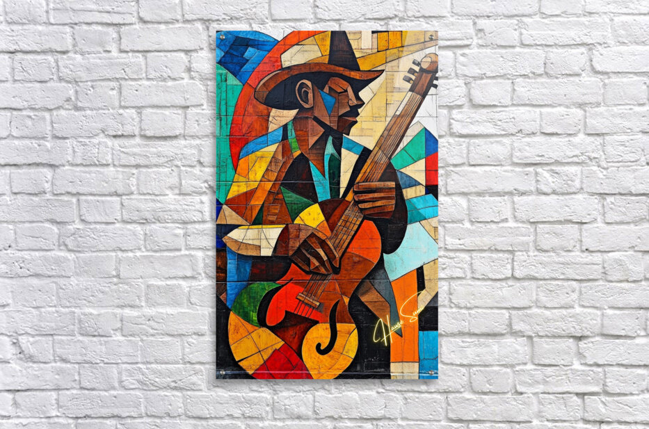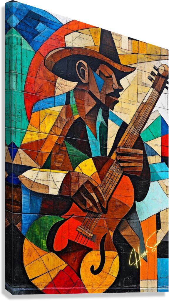 A soulful guitarist strums against a backdrop of cubist abstraction, where warm hues of sun meet the cool whispers of the blues. Every note, every brushstroke, sings of a journey long traveled and a song yet to be finished.