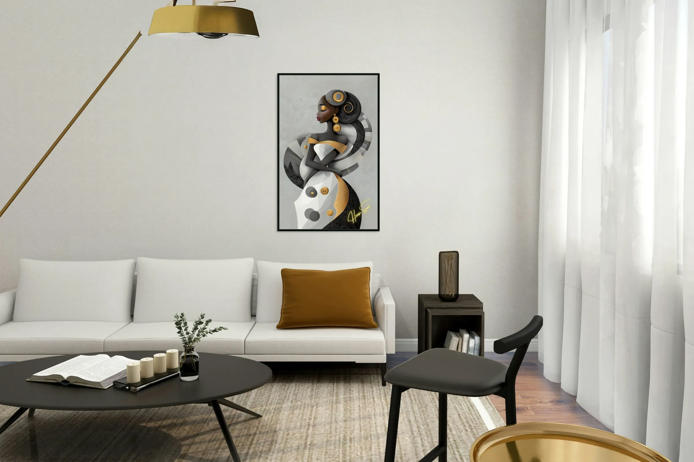 “Wrapped in Royal Geometry” celebrates the harmony of structure and soul. This queenly figure wears her crown in coils and orbits—where fashion meets Afrofuturism. Her bold red lips and golden accents nod to high glamour, while the swirling background honors the sacred shape of eternity and the rhythms of African artistry. Perfect for collectors of futuristic Black art or bold cultural expressions. Color Description: Rich charcoal black, soft pewter grey, and warm ivory, accented with sun-kissed gold, deep cherry red, and textured detailing that evokes a sense of movement and elegance.