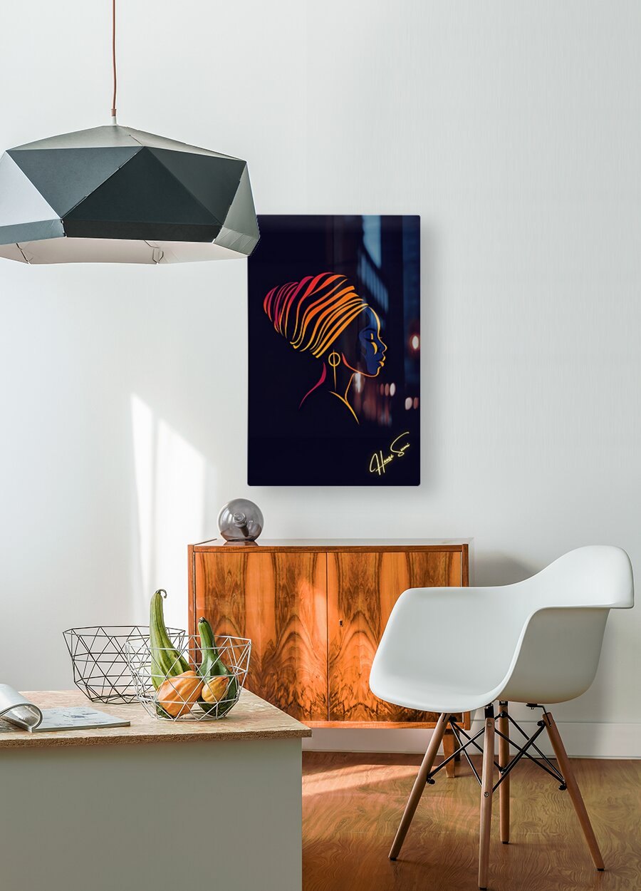 “Crowned in Color: The Grace of Her Silence” is a vibrant celebration of feminine strength, cultural pride, and the quiet wisdom carried through generations. This minimalist yet powerful digital artwork features the elegant silhouette of a Black woman adorned in a radiant headwrap, wrapped in hues of flame red, golden orange, and royal purple against a deep obsidian backdrop. Her profile speaks without words—a tribute to resilience, heritage, and sacred femininity. Every line and color evokes both modern style and ancestral strength, making this a timeless piece for collectors who understand the power of soft strength and visual storytelling. Perfect for art collectors, cultural spaces, fashion-forward interiors, and those who cherish the beauty of identity expressed through form and color. Color Profile: Bold sunset gradients of crimson, amber, and burnt orange, set against a midnight black background. Her face glows in tones of midnight blue and deep gold, adding regal contrast and depth.