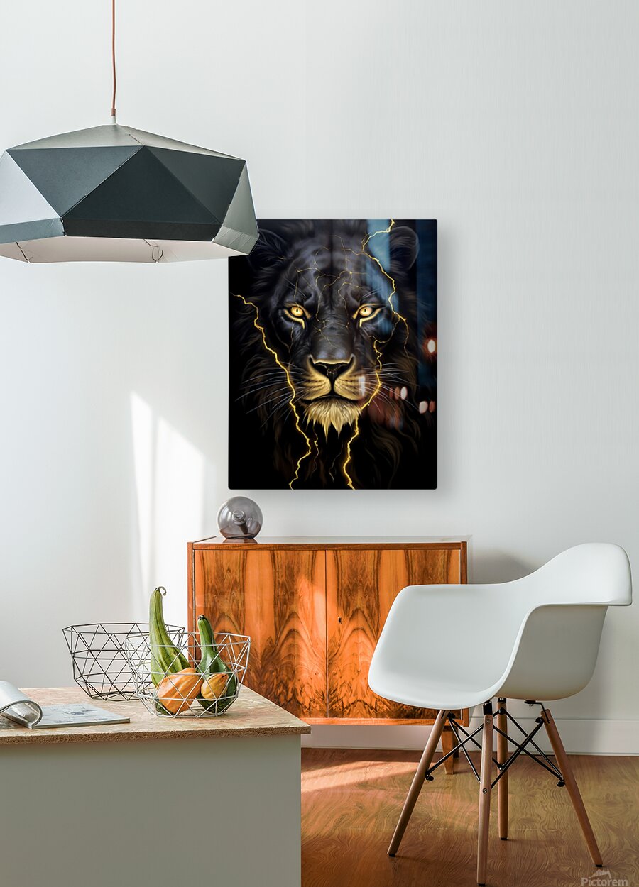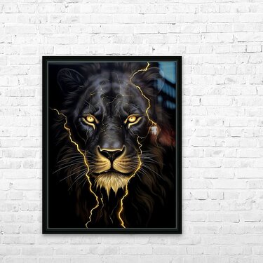 “Thunder Roars in Silence” captures the raw majesty and spiritual force of the black lion—a mythical guardian forged from midnight and lightning. This striking digital artwork fuses strength and serenity, with glowing fissures of gold electricity cracking through the lion’s obsidian fur like ancient kintsugi. The golden eyes pierce the soul, reminding viewers of inner resilience, divine rage, and the calm before a storm. This piece is not just art—it’s an awakening. Perfect for collectors who crave symbolism, power, and the balance between chaos and clarity. This gallery-quality piece radiates energy whether placed in a luxury office, modern den, or bold living room. Color Profile: Dominant hues of deep obsidian black, contrasted with molten gold lightning and metallic amber eyes. Subtle highlights of silver-white whiskers and tawny undertones in the mane add dimension and mystique.