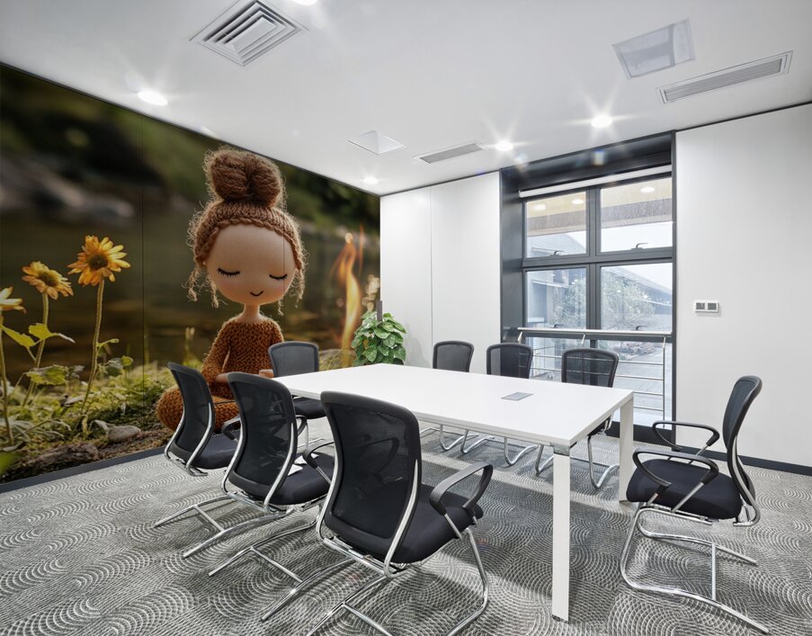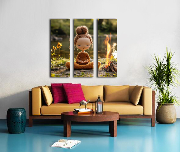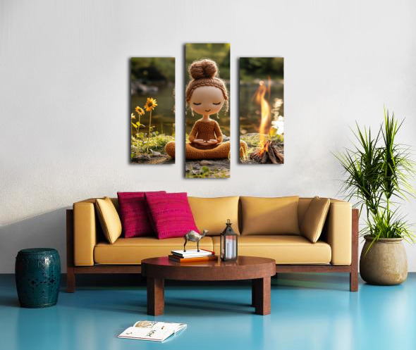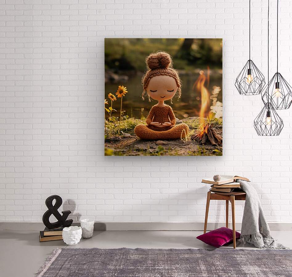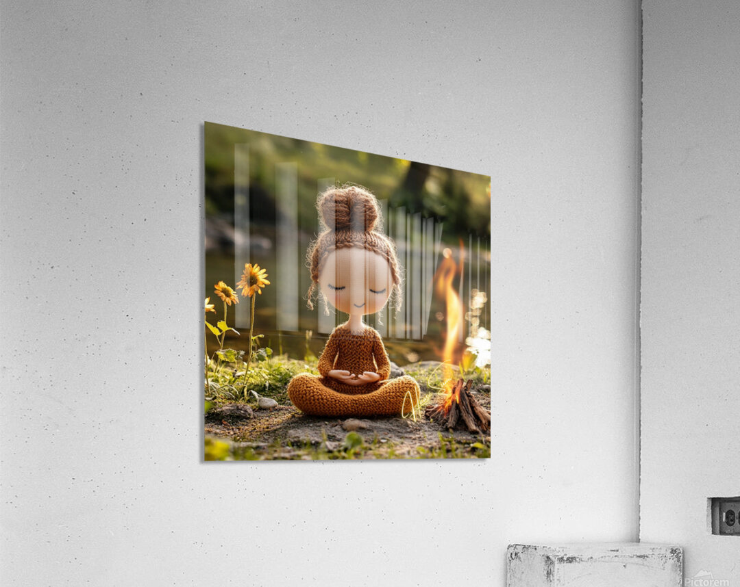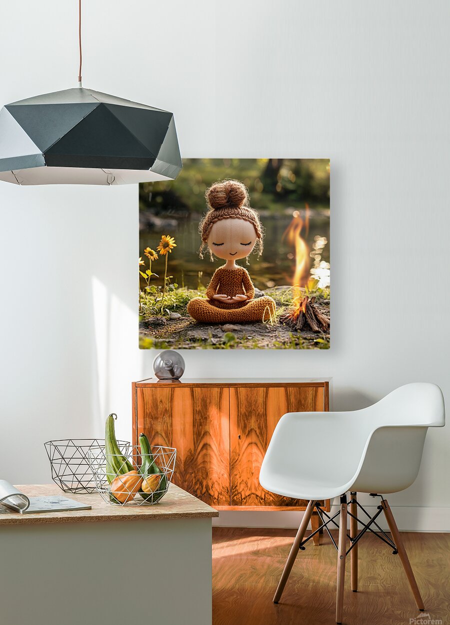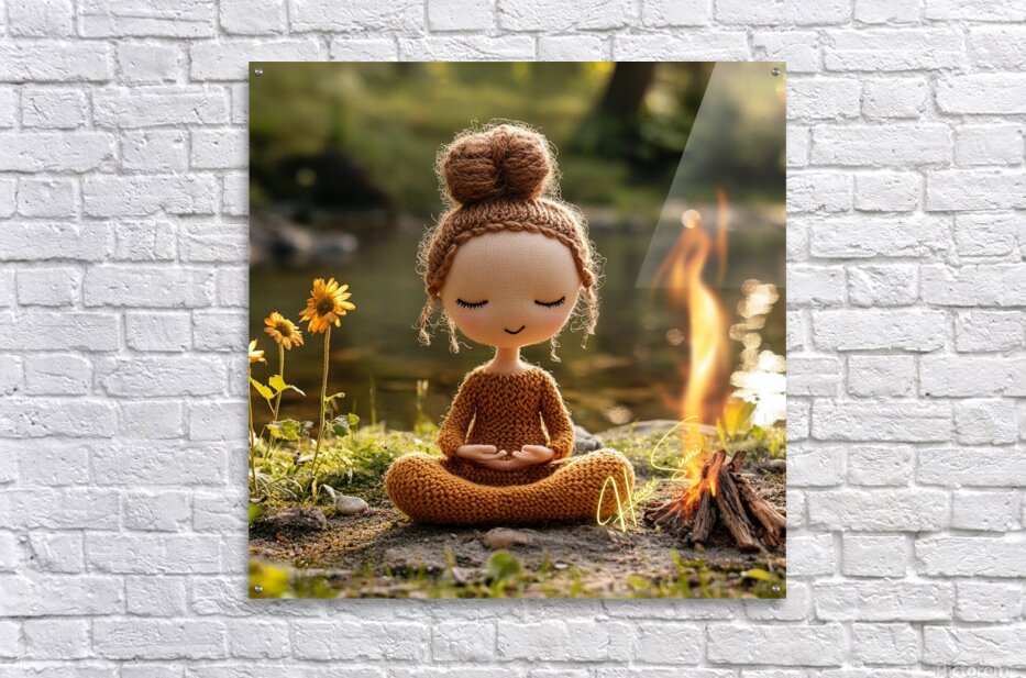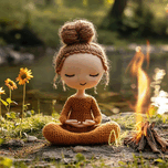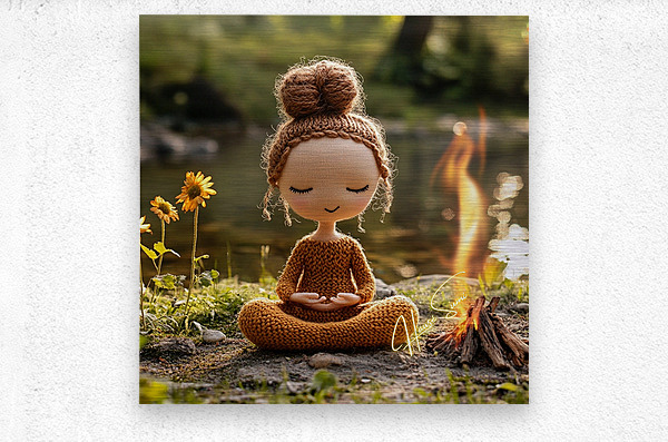 “Stillness by the Fire: The Knitted Soul” is a whimsical meditation on peace, presence, and warmth. This soft-spoken figure, hand-stitched in earthy tones, sits in perfect lotus pose beside a flickering campfire near a quiet riverbank. With closed eyes and a gentle smile, she embodies the spirit of mindfulness, reminding us that joy can be simple and still. Blending cozy textures with natural beauty, this piece brings together storytelling, serenity, and charm. It’s a heartwarming addition to meditation rooms, children’s spaces, or soulful nooks where quiet energy is needed. Perfect for collectors of soft sculpture art, spiritual minimalism, or playful mindfulness decor. Color Profile: Warm tones of honey brown, toasted amber, soft beige, and sunlit gold, set against a sage green and river stone backdrop. The small campfire adds a glow of orange and flame yellow, creating a cozy contrast.