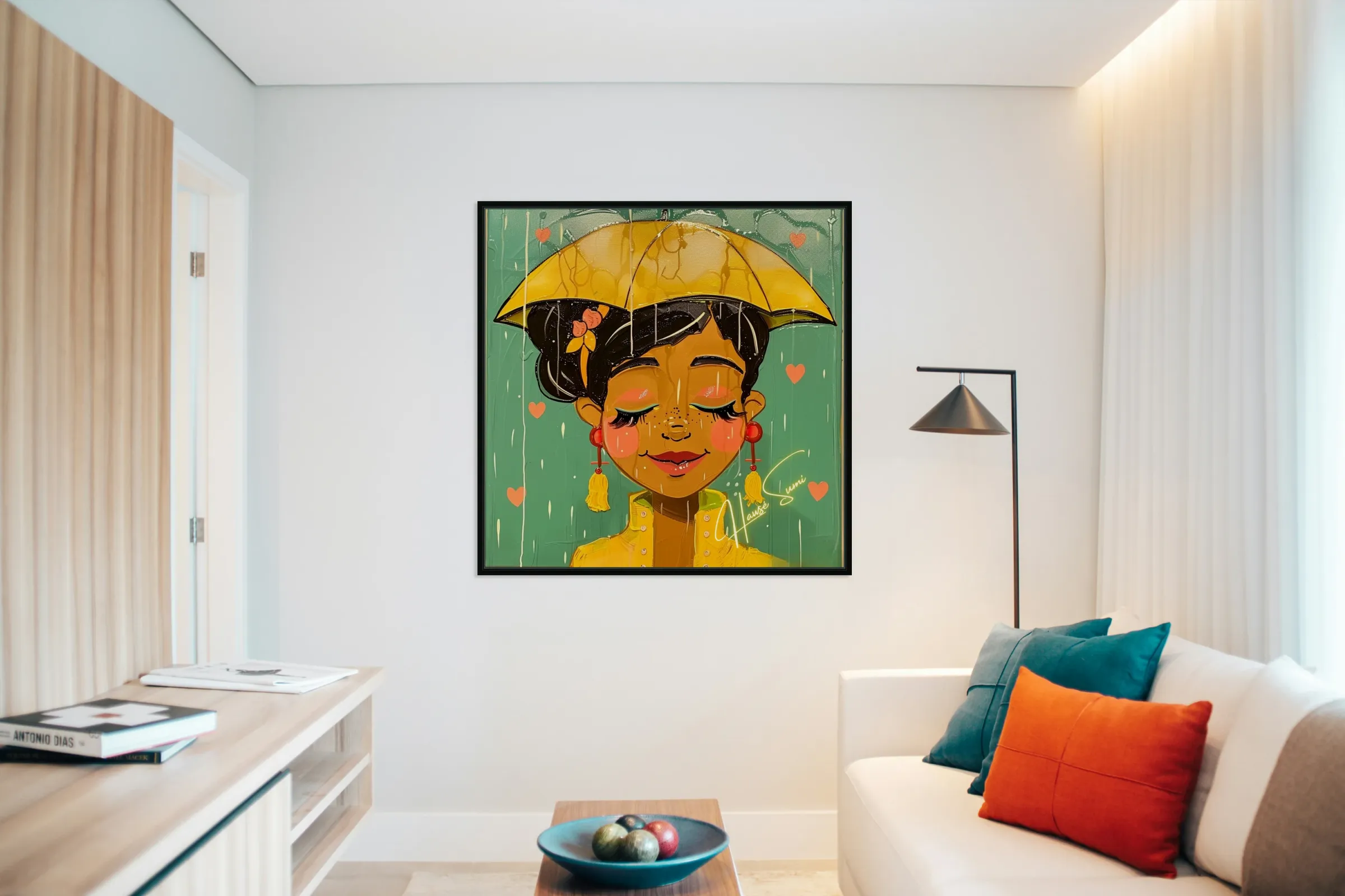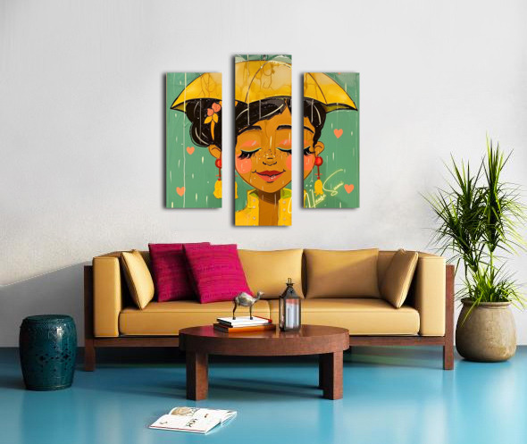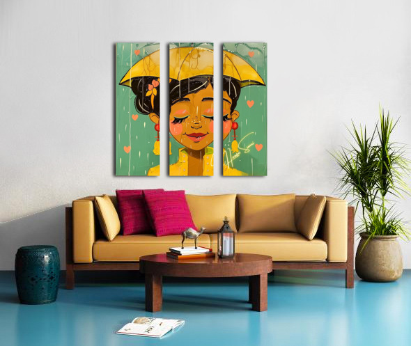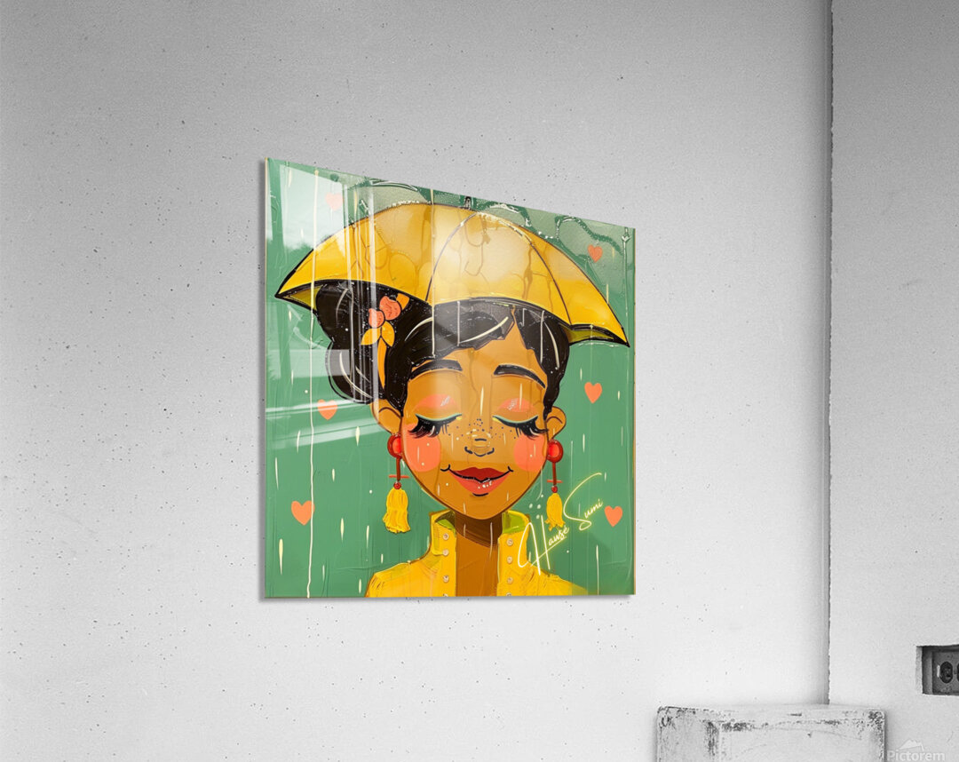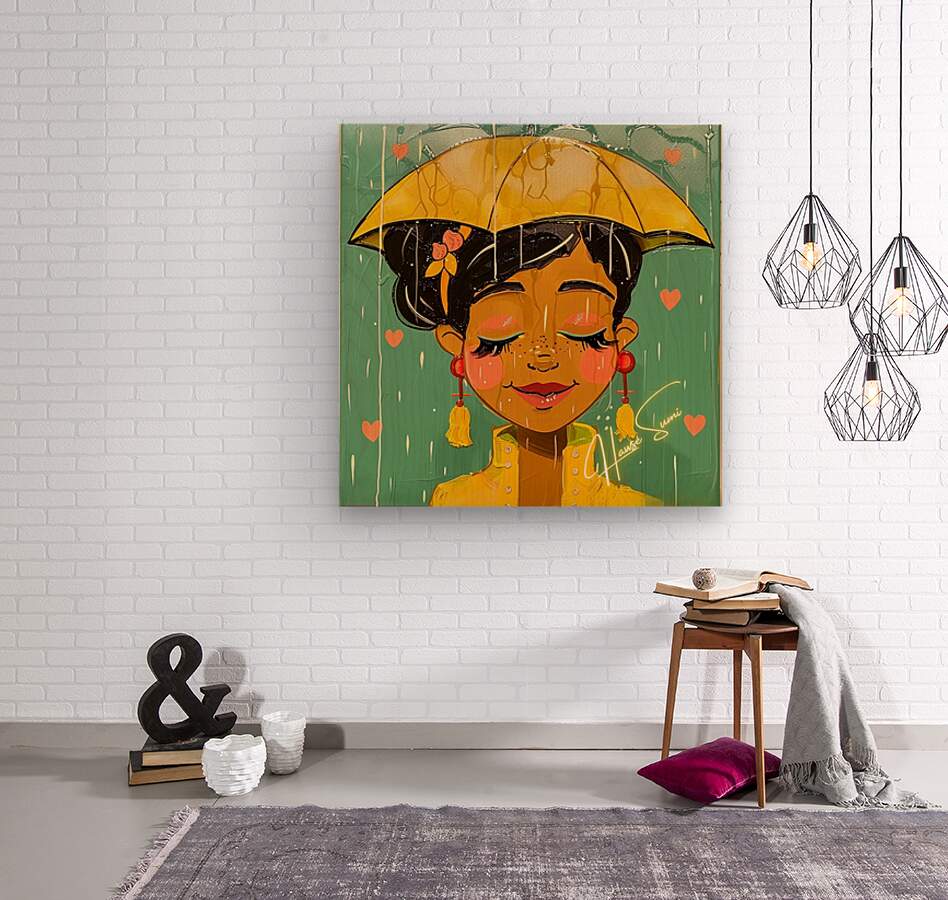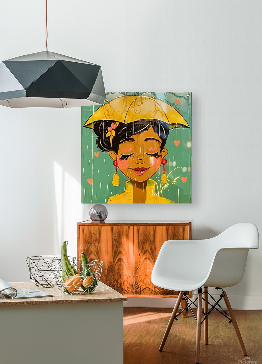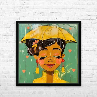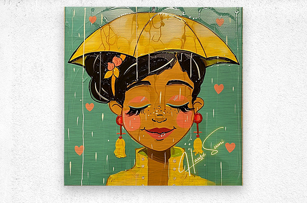 Under a golden umbrella, a joyful soul embraces the rain with closed eyes and a gentle smile. Her caramel skin glows against the teal sky while soft salmon-pink hearts and brushstrokes drip around her like poetry. Her warm yellow raincoat and cherry-red earrings pop with emotion, and the soft blush on her cheeks tells a story of peace within the storm.