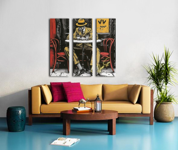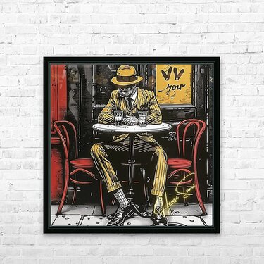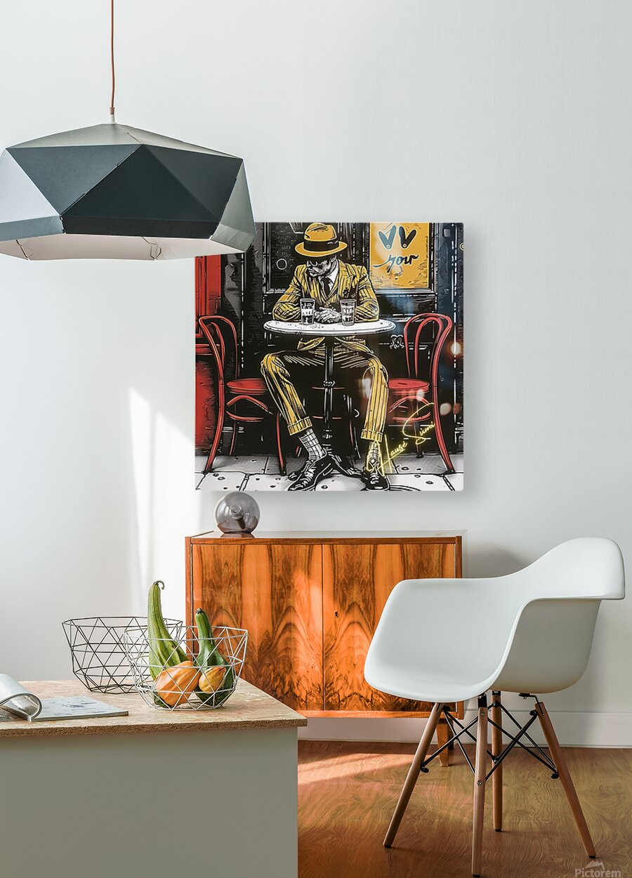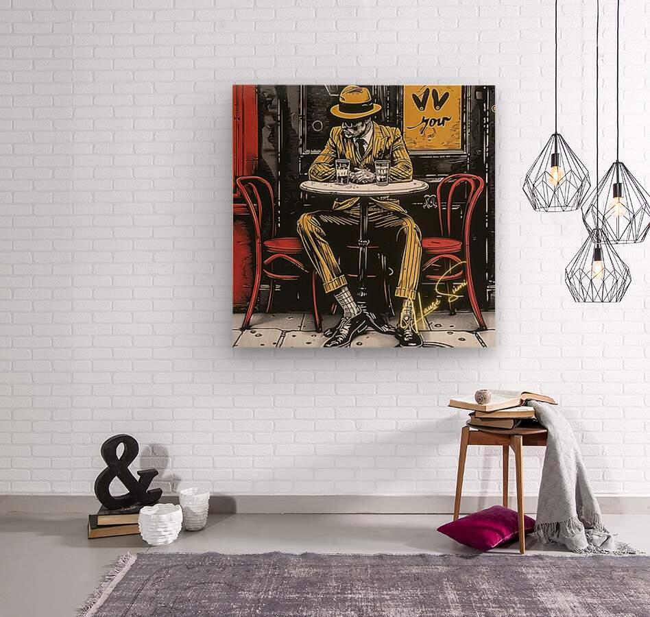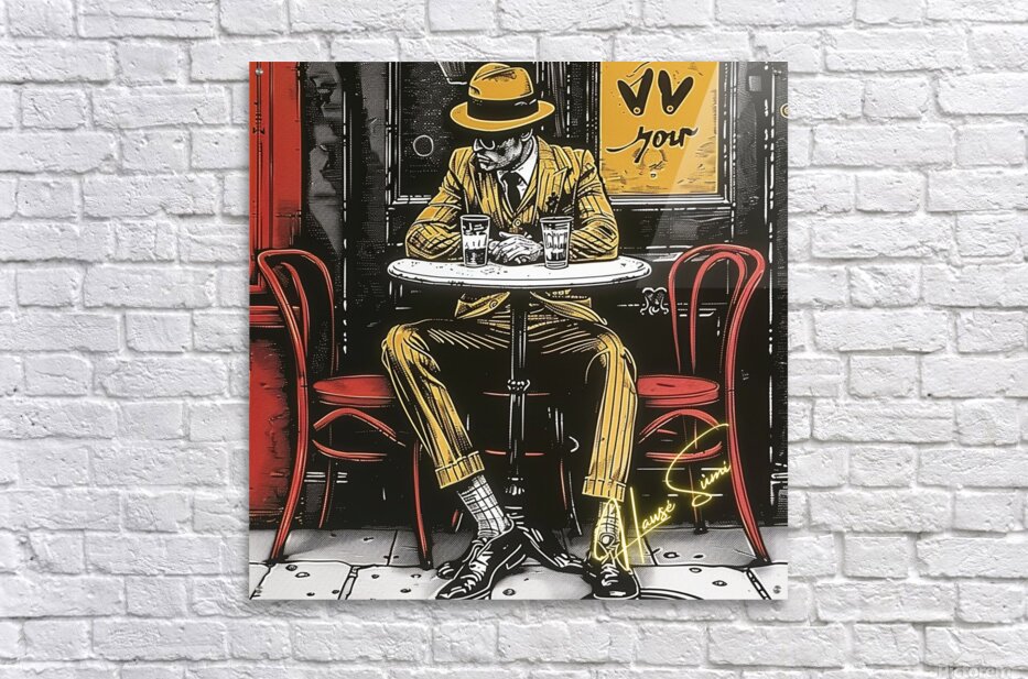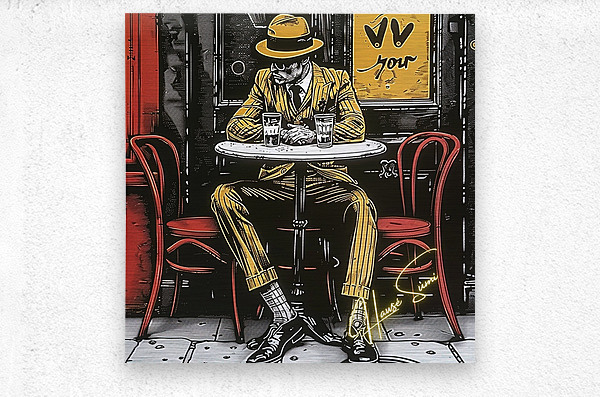 A sharply dressed gentleman in a mustard-yellow pinstripe suit sits alone at a Parisian café table, guarded yet stylish, his thoughts as deep as the espresso he hasn’t touched. The crimson chairs and monochrome background offer a film-noir contrast to his bright attire, creating a vintage-meets-modern energy under Hawsé Sumi’s signature flair.