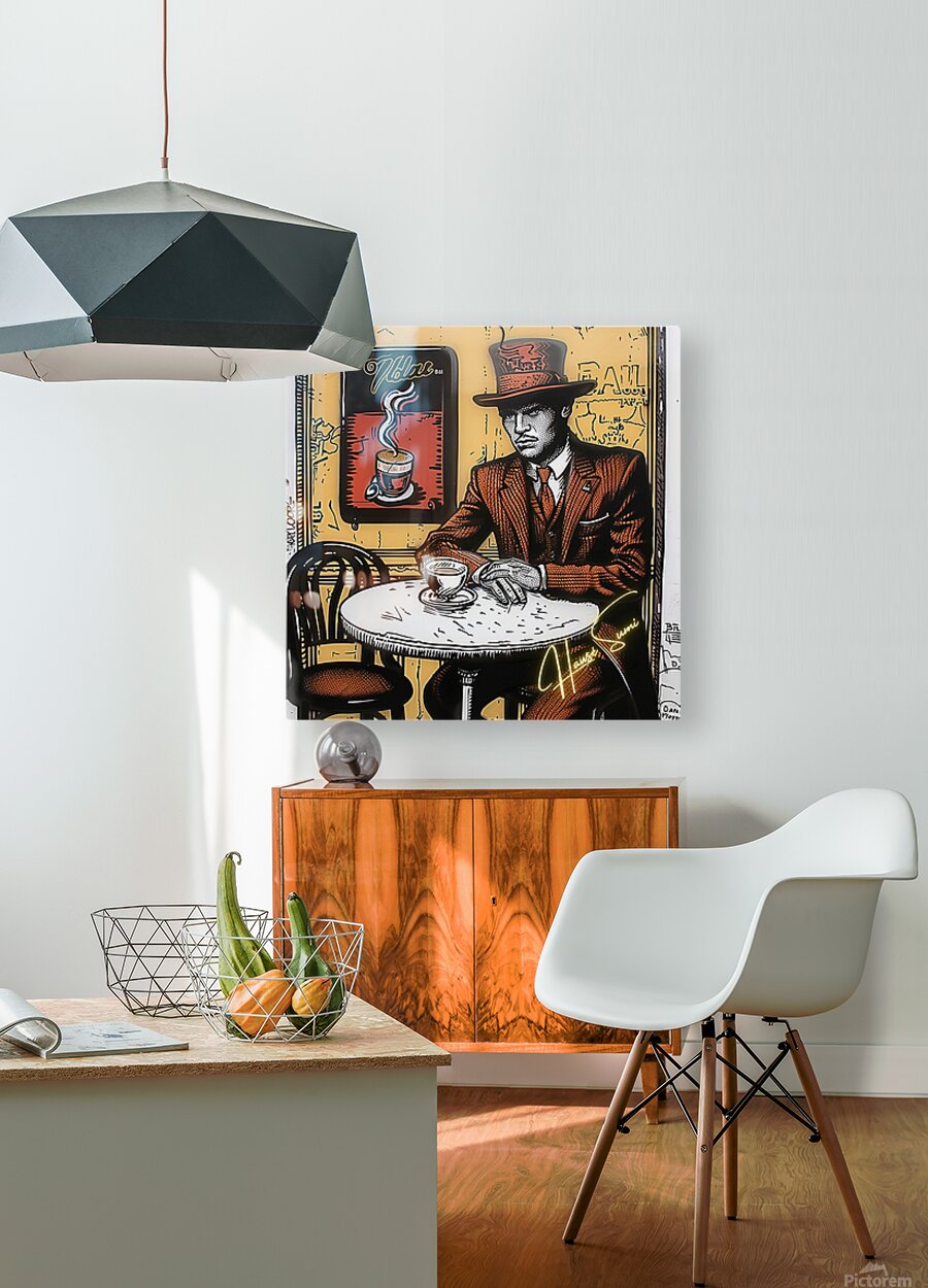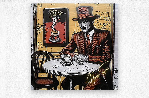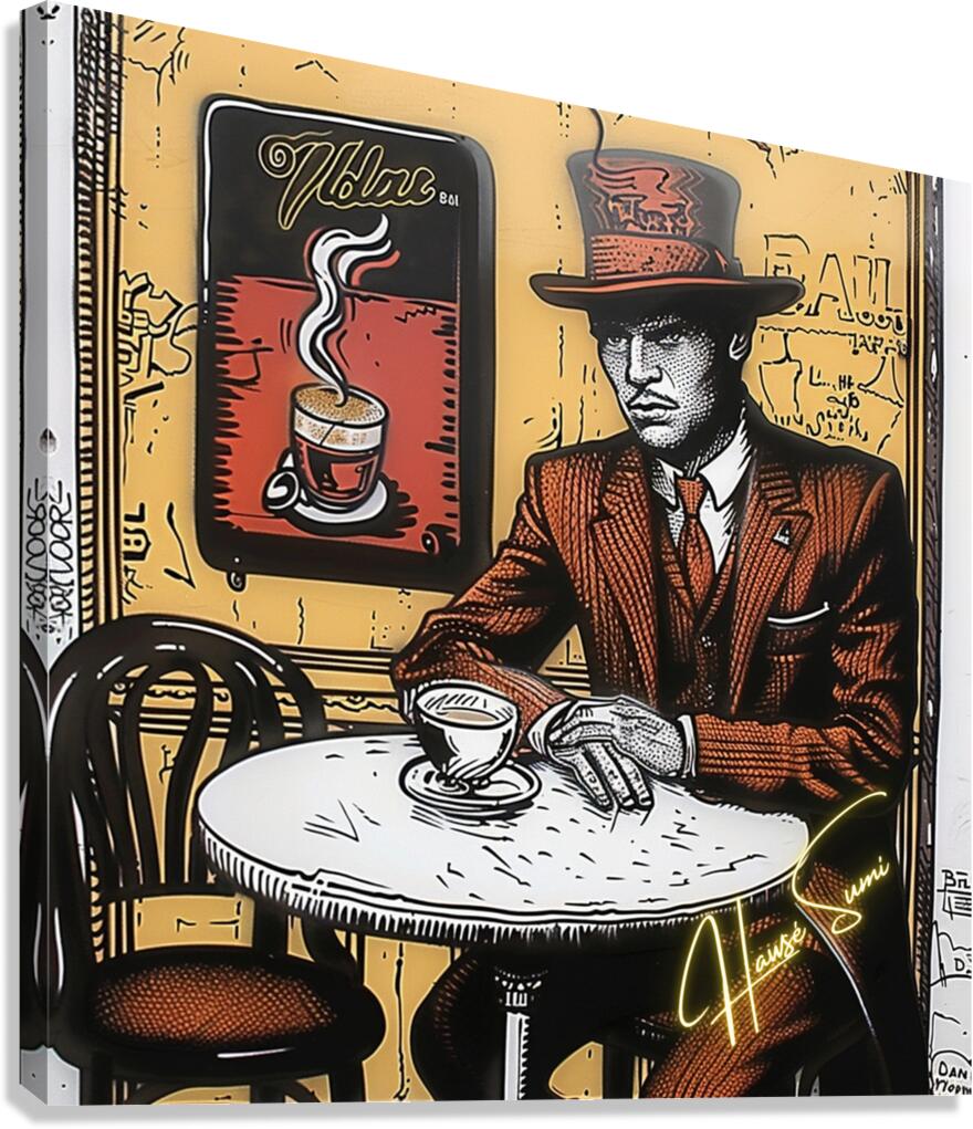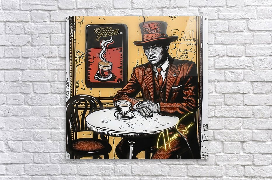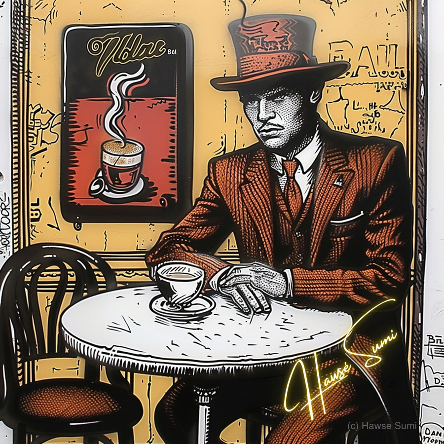 Wearing a rust-red suit and towering top hat, the man in this café corner appears more like a secret poet than a coffee drinker. With sepia walls and golden-orange hues swirling behind him, the steam from his cup rises like ideas forming—this is a piece for those who love mystery, masculinity, and mocha moods.