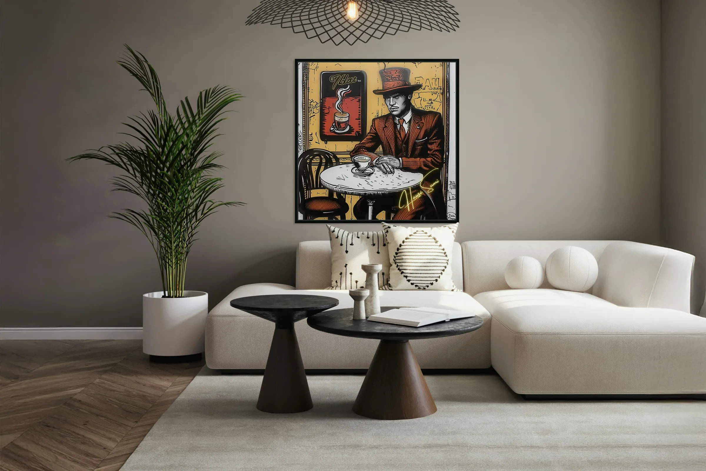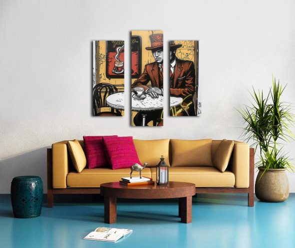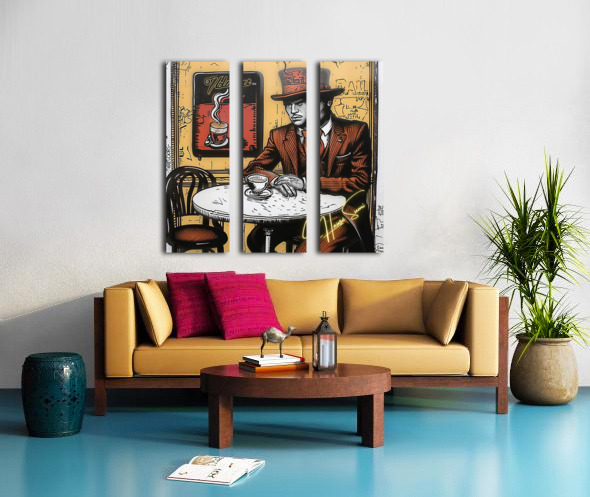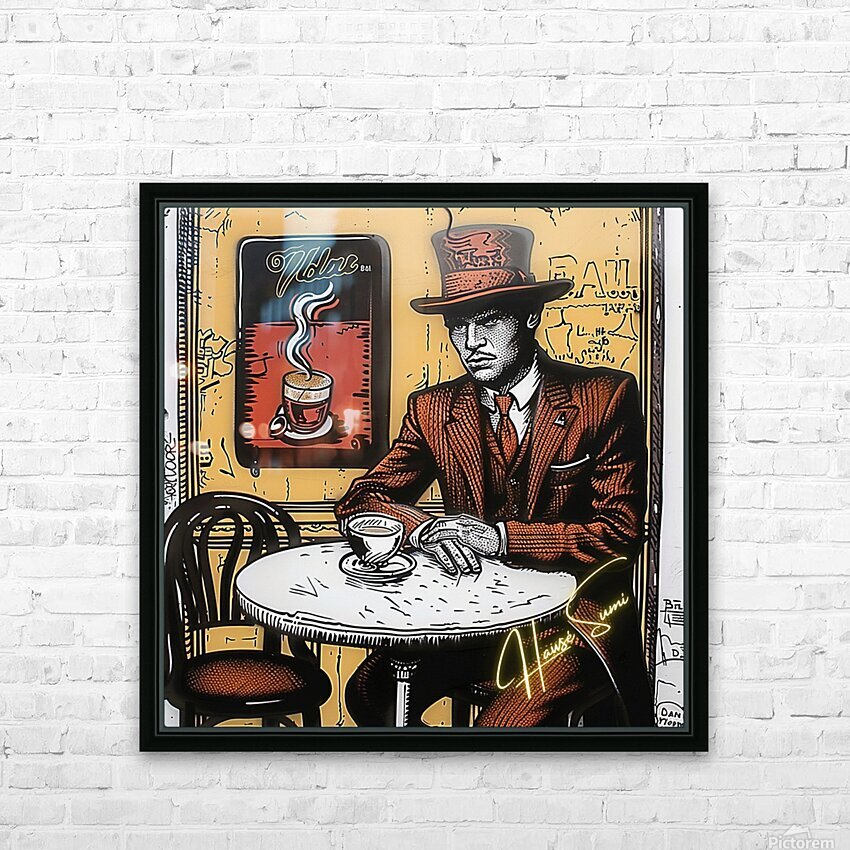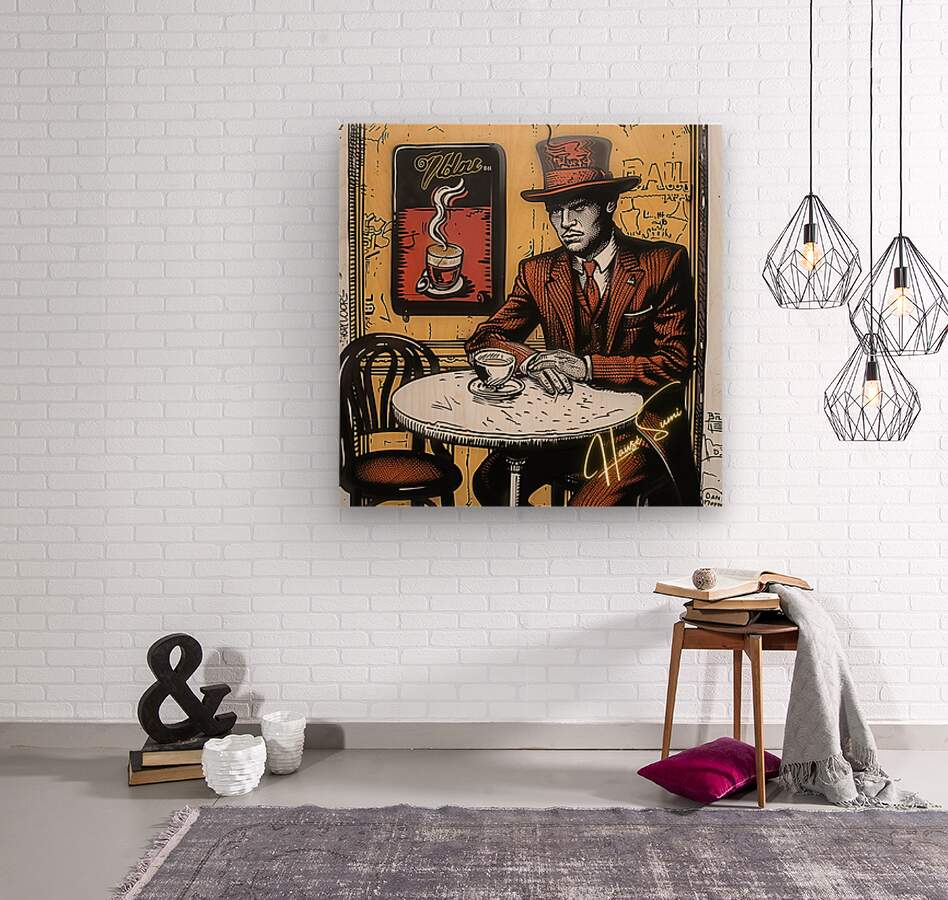 Wearing a rust-red suit and towering top hat, the man in this café corner appears more like a secret poet than a coffee drinker. With sepia walls and golden-orange hues swirling behind him, the steam from his cup rises like ideas forming—this is a piece for those who love mystery, masculinity, and mocha moods.