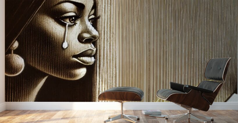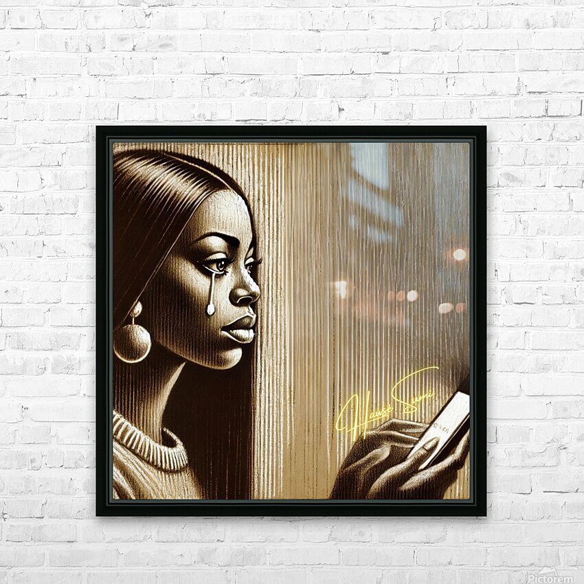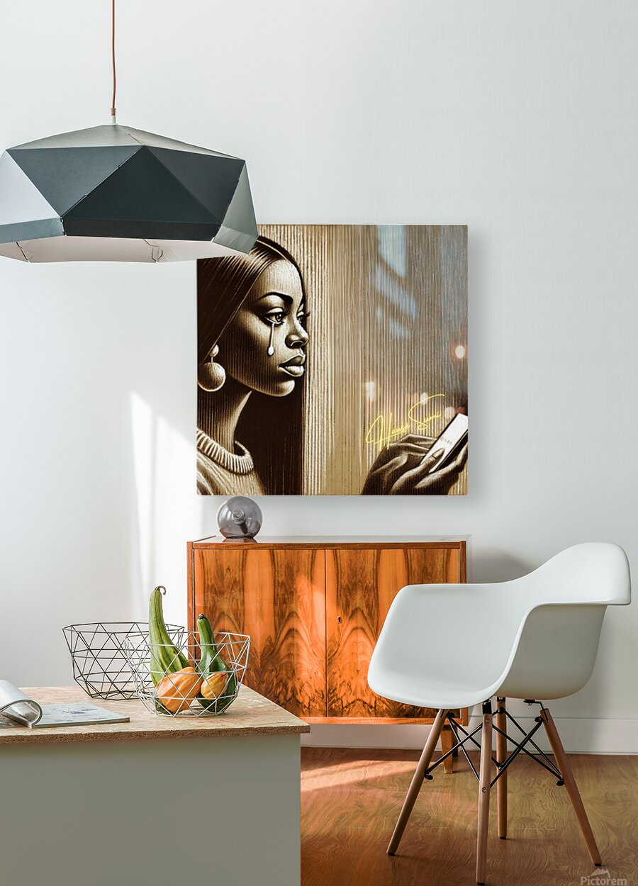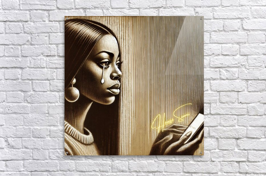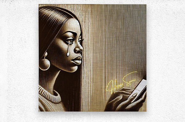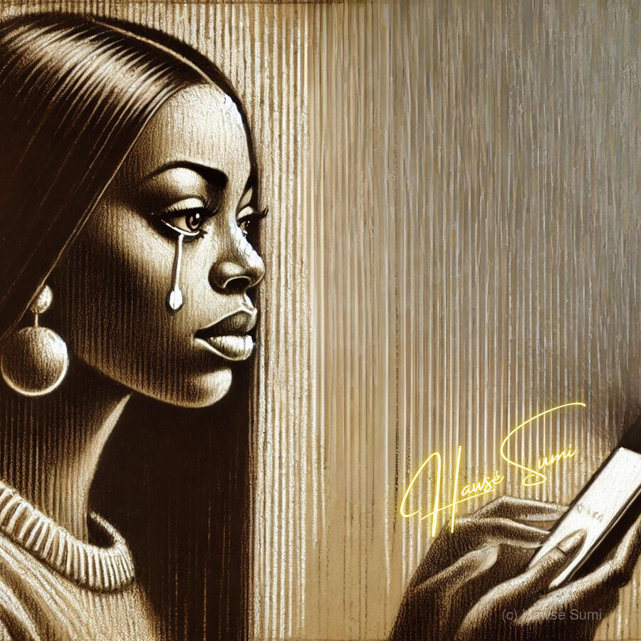 Bathed in golden-brown shadows and carved in streaks of sepia light, she gazes at her phone like it holds both the question and the answer. Her tear falls silently, thick and glistening—like truth sliding off a cheek too proud to call twice. The background lines—vertical and faded—create a sense of emotional stillness, like time stretching between a sent message and the silence that follows. Her round earrings and sleek hair give her a quiet power, but her expression tells the truth: being left on seen hits different when you gave your all.