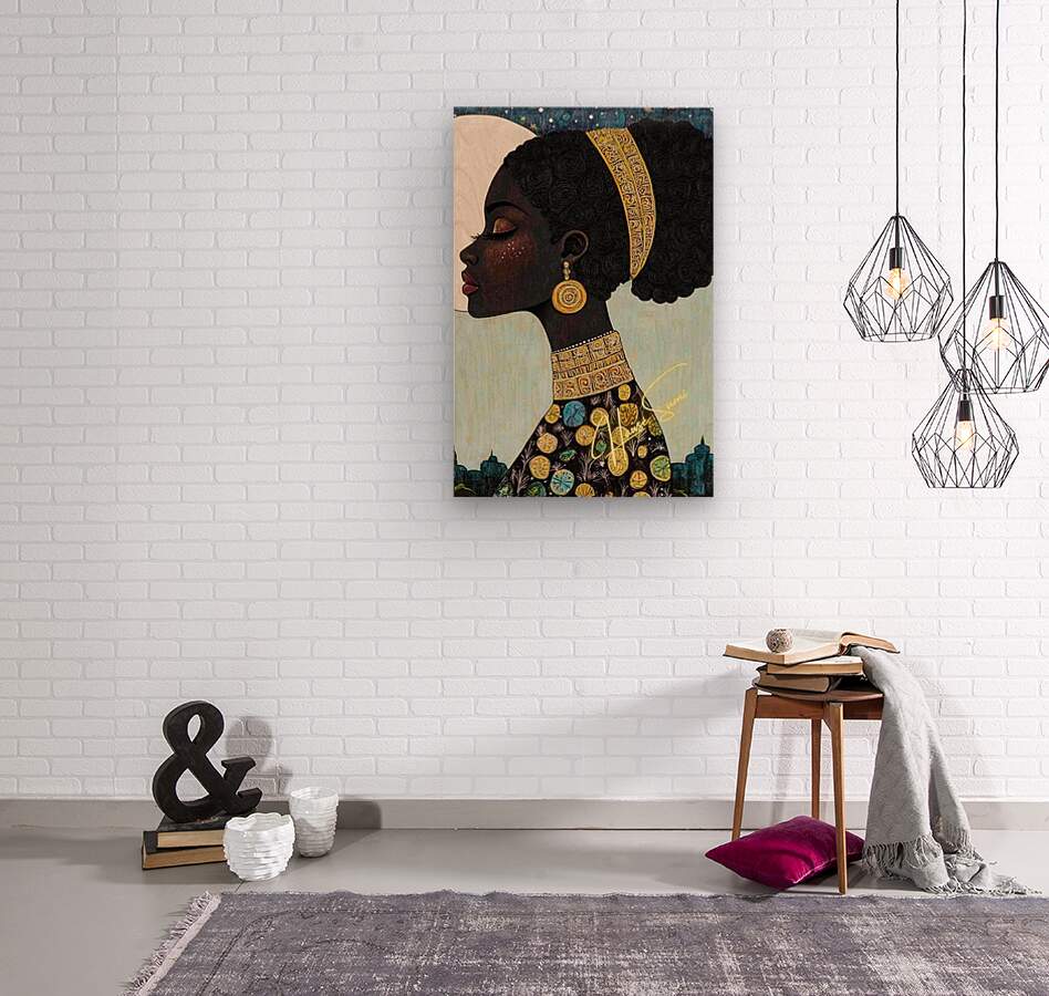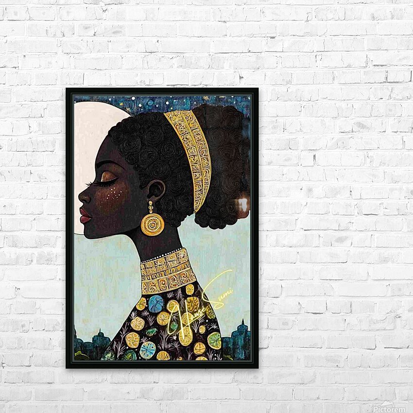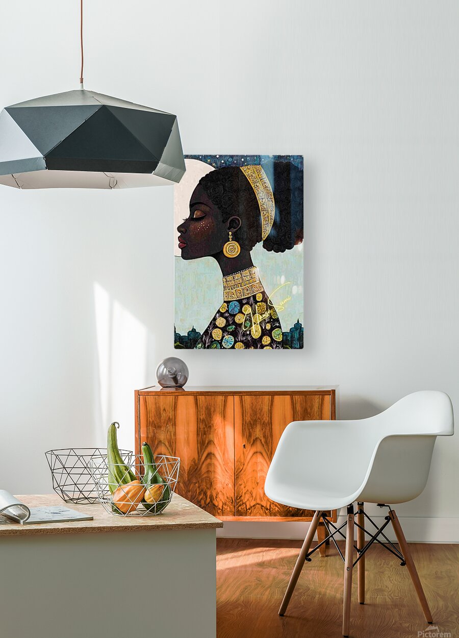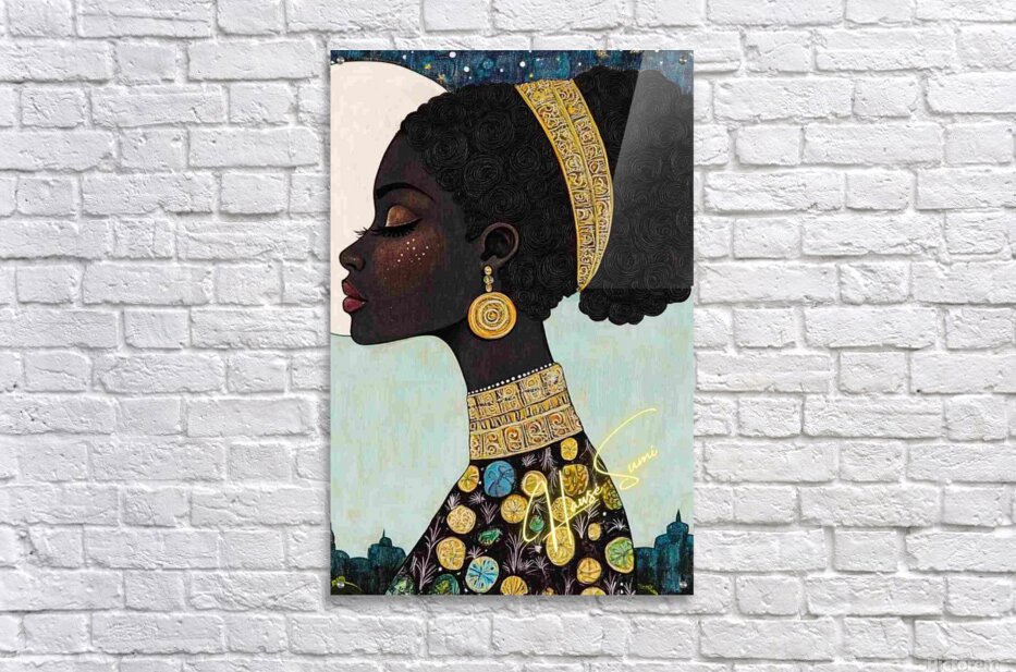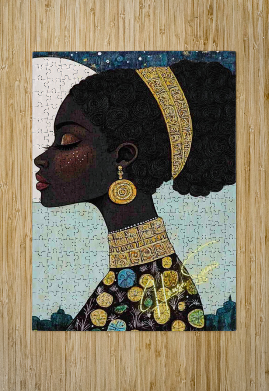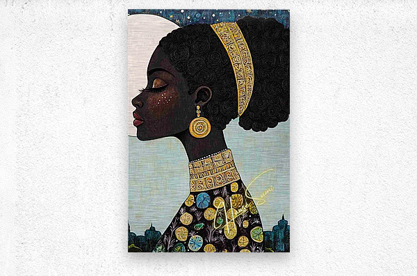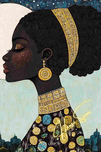 Under a luminous full moon and a twilight-dappled sky, she reigns in regal stillness. Her skin is deep mahogany, adorned with golden embellishments th...[+]