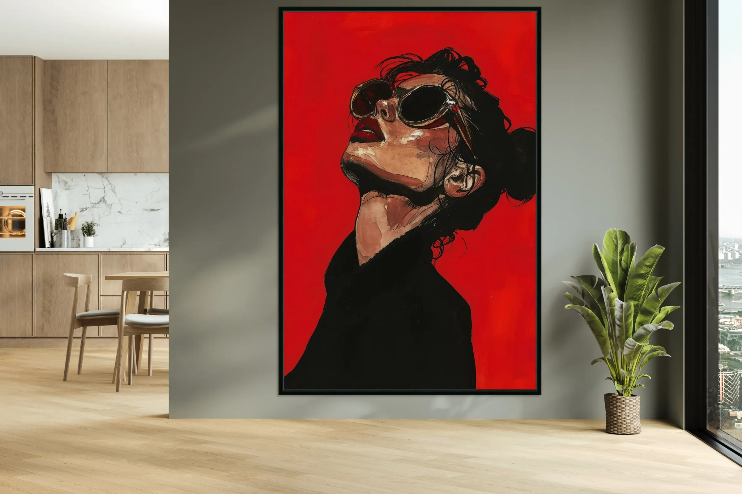 Bathed in the unapologetic power of a fire-red backdrop, she tilts her chin to the sky—her skin kissed by rich warm tones, her lips lacquered in the same crimson hue that mirrors her bold aura. Wrapped in deep obsidian black, with oversized sunglasses cloaking her gaze, she is every bit a walking declaration: fierce, untamed, and not here to be small.