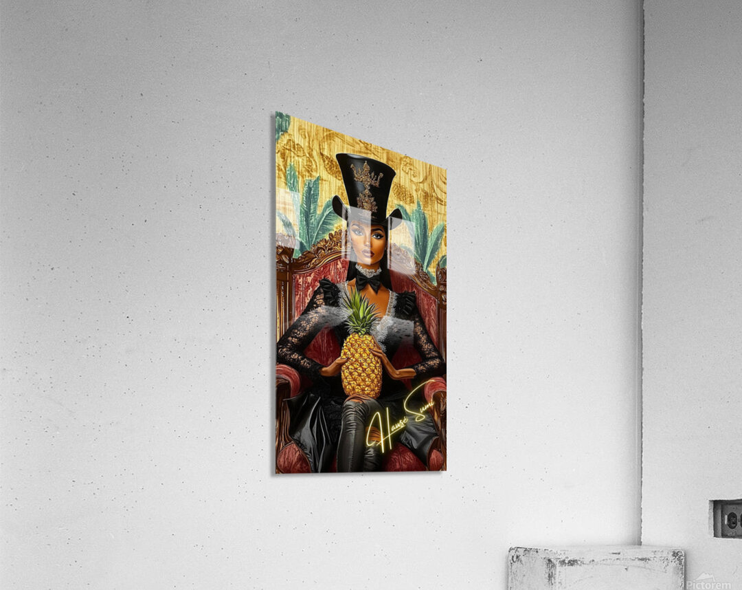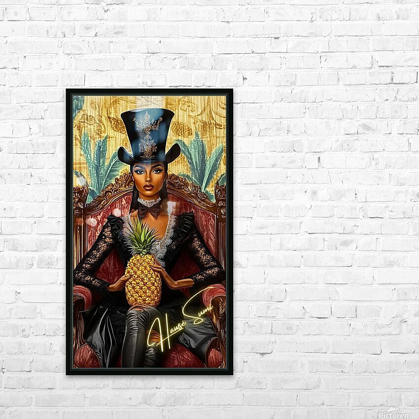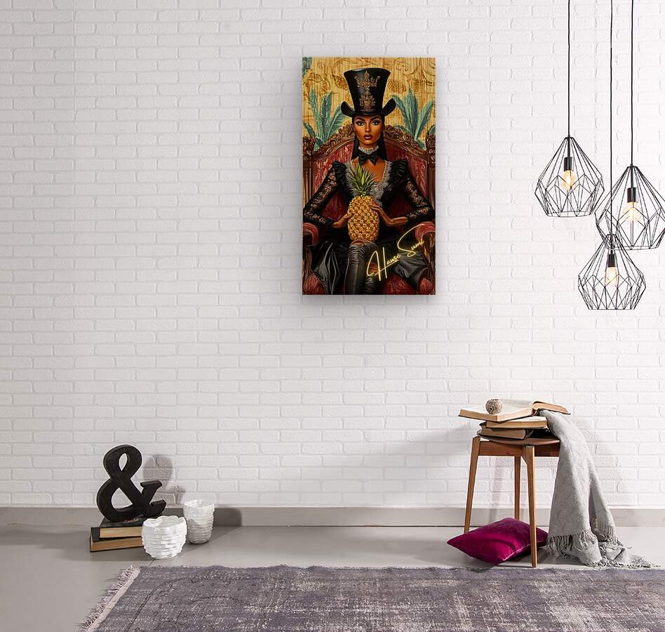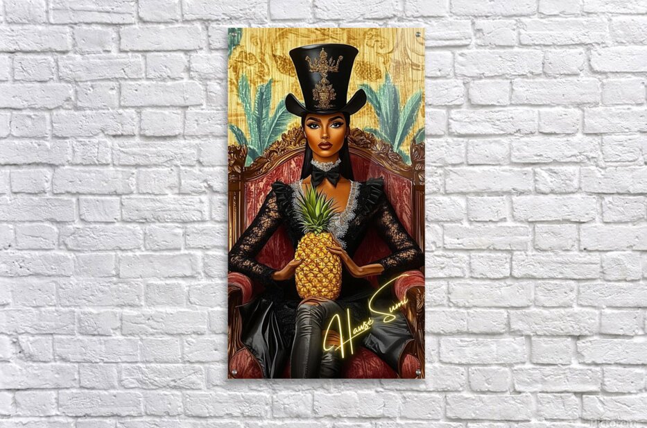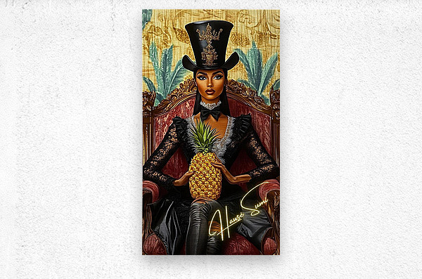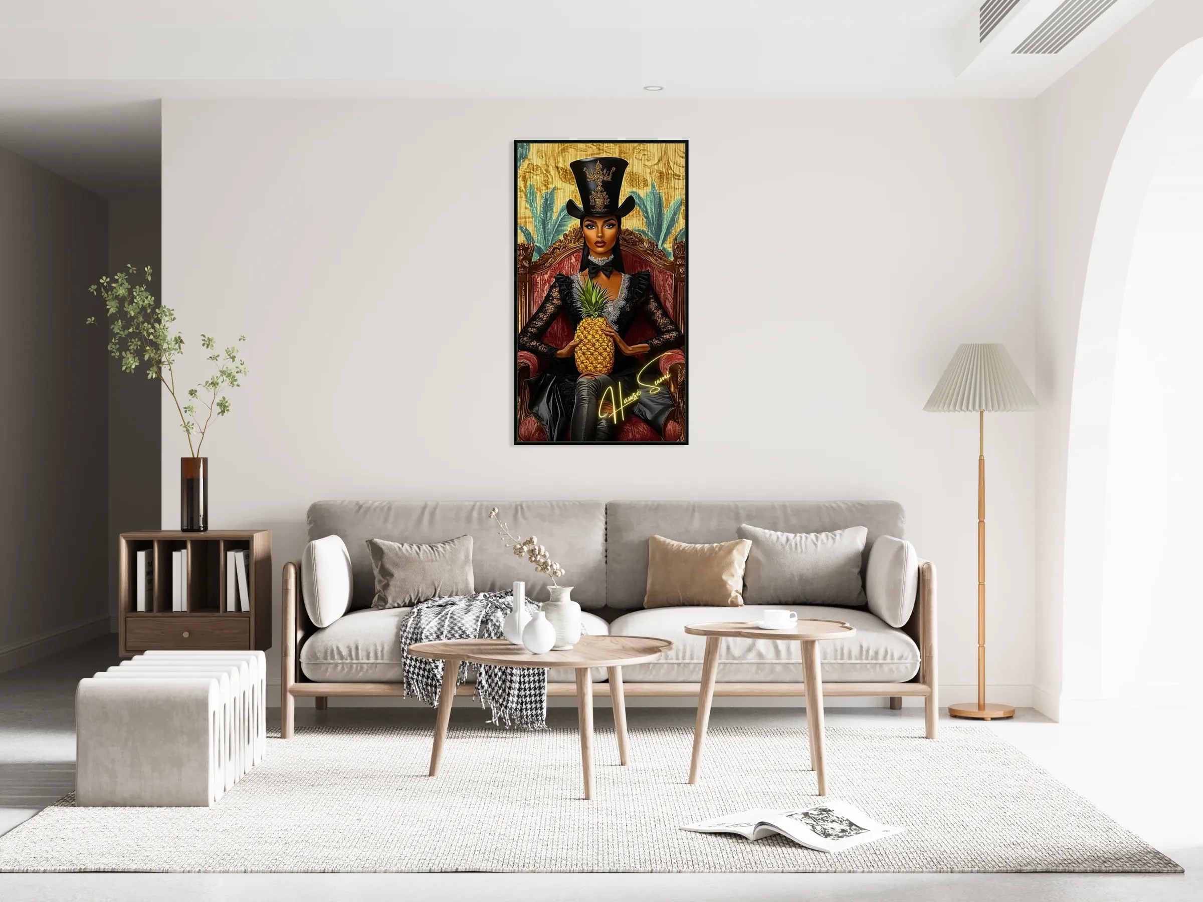 The wallpaper breathes with leafy shadows while her ebony lace sleeves and corseted bodice speak of a regal femme fatale. She holds the pineapple like a secret—a golden temptation. Her top hat boasts baroque grandeur, making her a sovereign of style where vintage opulence and tropical cheek meet.
