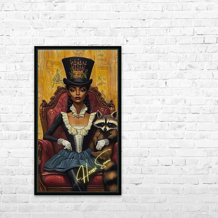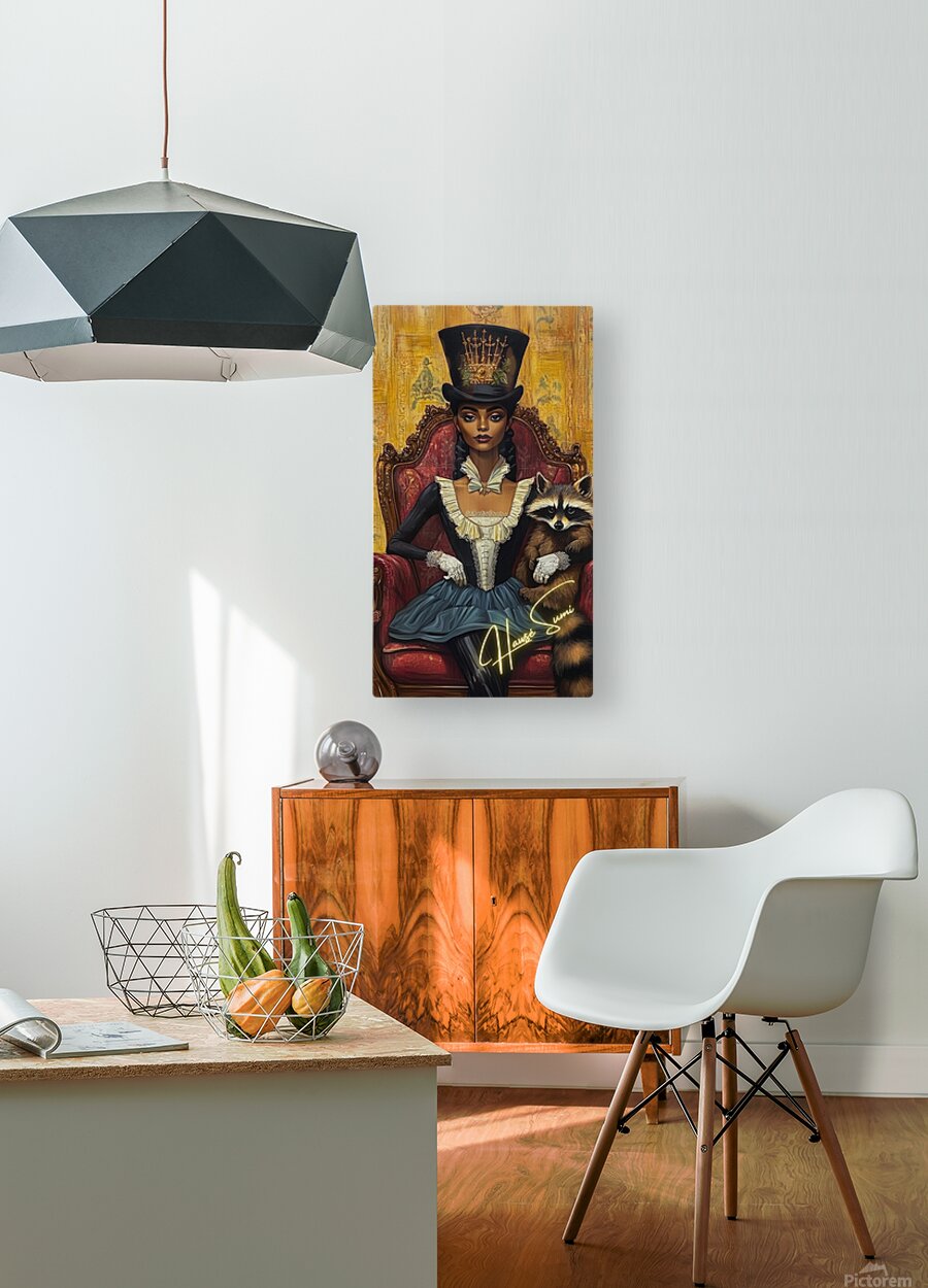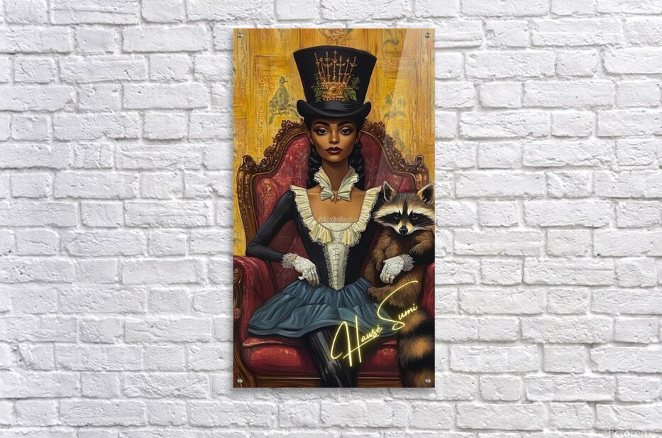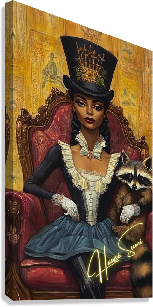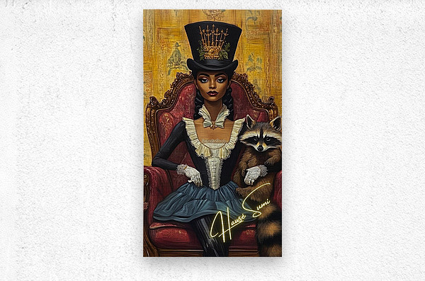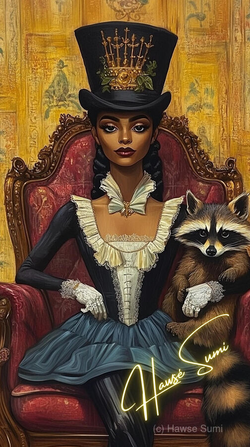 Draped in midnight blues and ivory ruffles, she sits on a crimson velvet throne, her posture straight, her stare unwavering. A crowned top hat, adorned with golden swords and greenery, sits high like a quiet rebellion. But it’s the raccoon in her gloved arm—mischievous, watchful—that hints at untold schemes behind aristocratic elegance. The ochre-gold backdrop whispers of hidden scandals and noble facades.