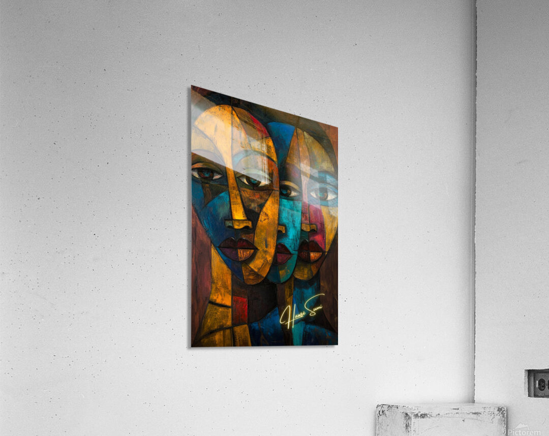 Three faces stand side by side, bound by the shared rhythm of color—earthy ochre, turquoise blue, plum, and rust. Their eyes look outward with a steady calm, almost regal in their presence. This is a painting of ancestral lineage, generational echo, and the soft strength of multiplicity. Their forms are cracked like aged frescoes but painted with purpose and soul.