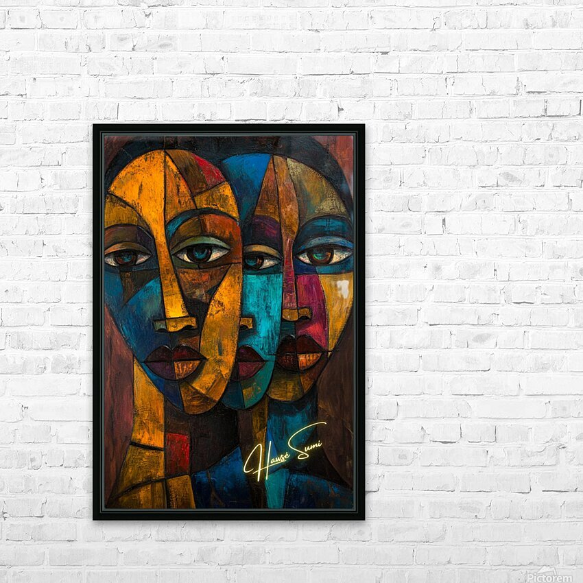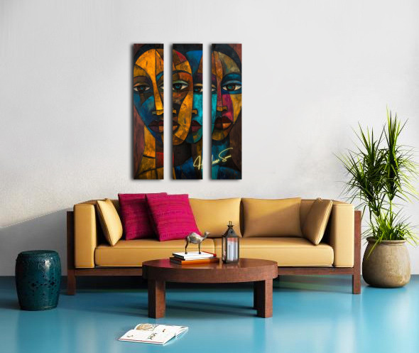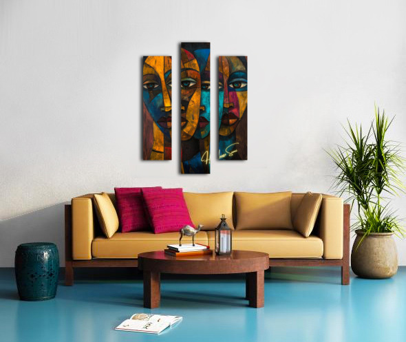 Three faces stand side by side, bound by the shared rhythm of color—earthy ochre, turquoise blue, plum, and rust. Their eyes look outward with a ste...[+]