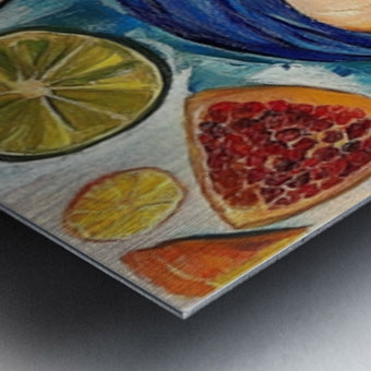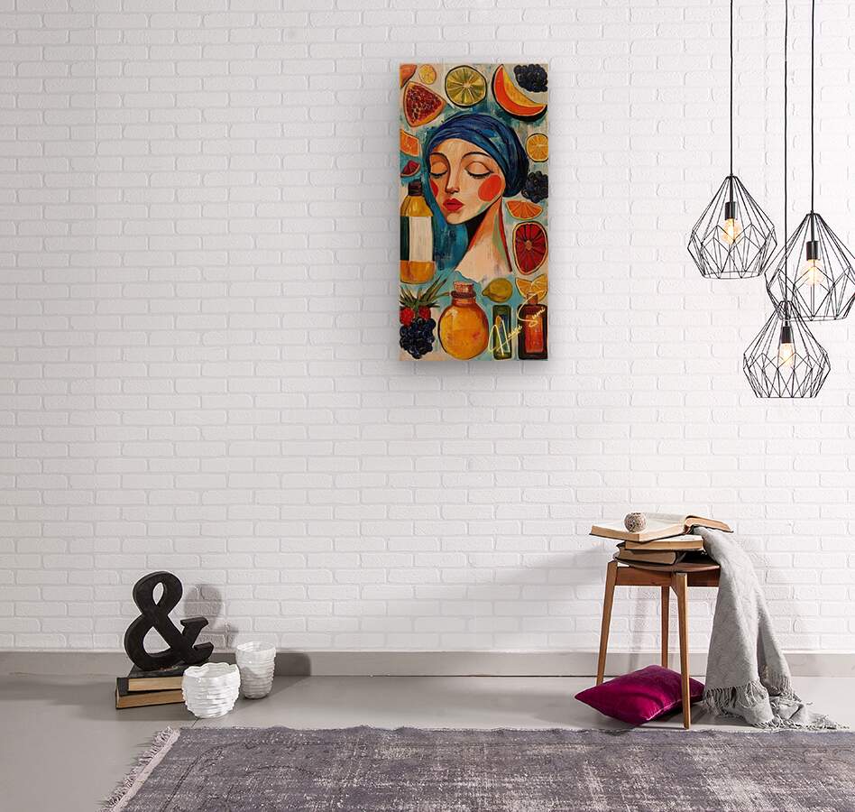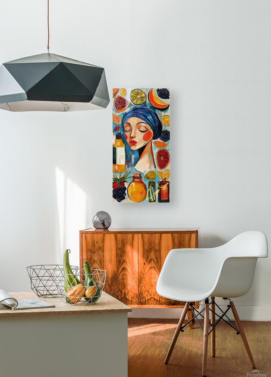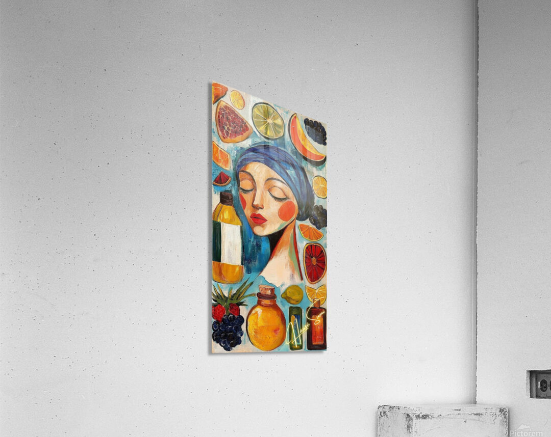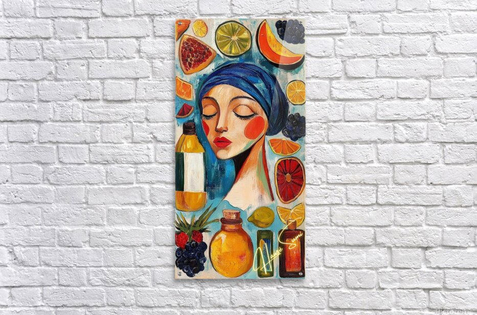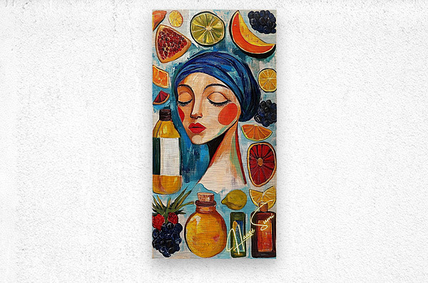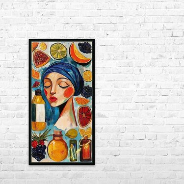 Eyes closed, cheeks flushed, lips painted like ripe strawberries—she’s draped in a blue headscarf among floating fruits and apothecary bottles. Wa...[+]