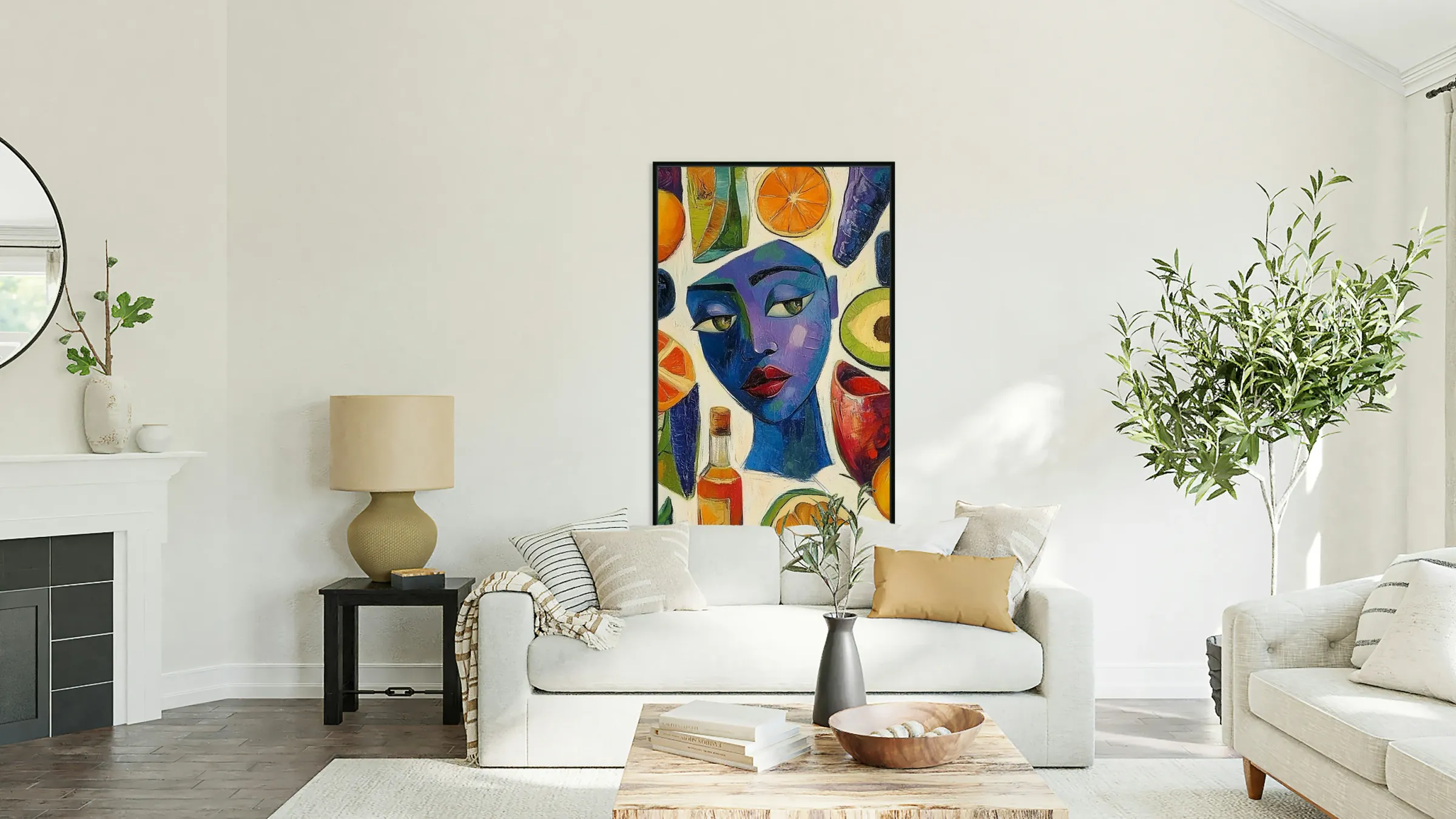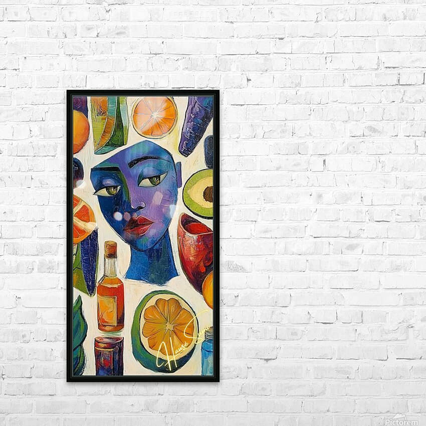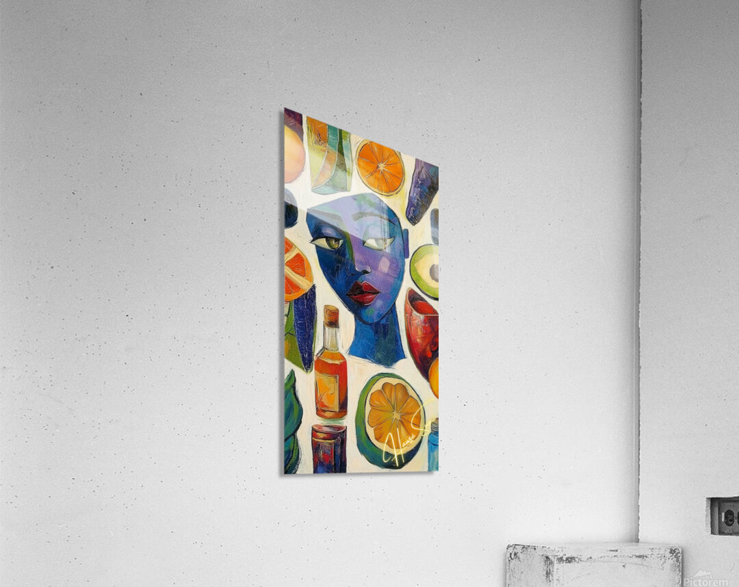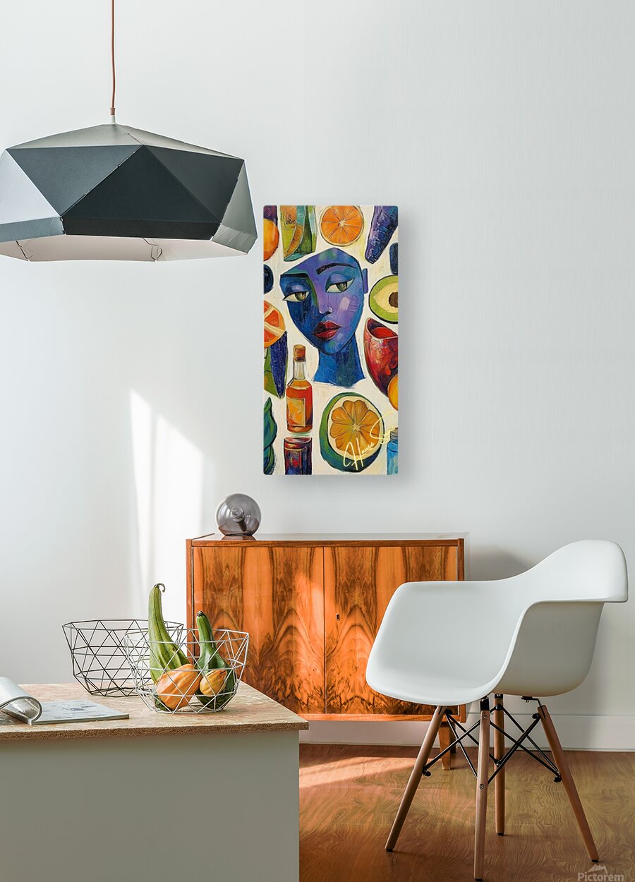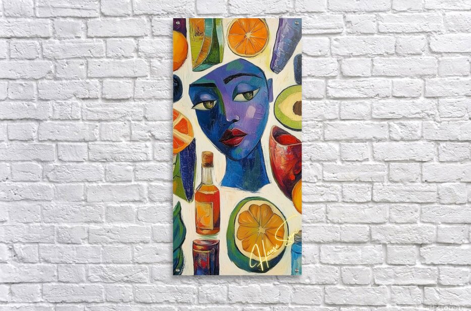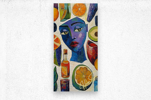 A cool-toned woman with purple and blue skin gazes sideways, her eyelids painted in soft green, her lips dipped in merlot red. Surrounding her are juicy citrus slices, avocados, root veggies, and small spice bottles—symbols of nourishment and flavor. This piece blends femininity and food in a lyrical, contemporary expression.