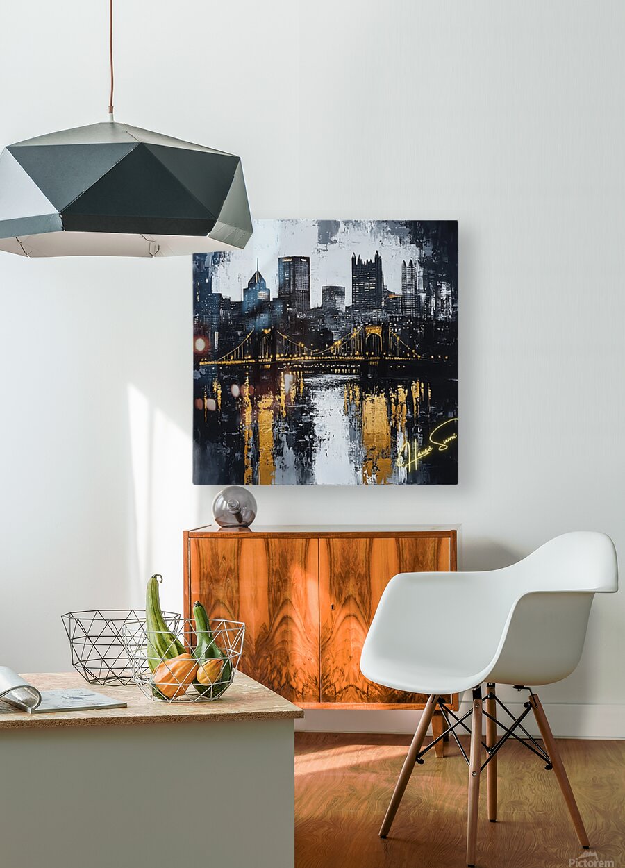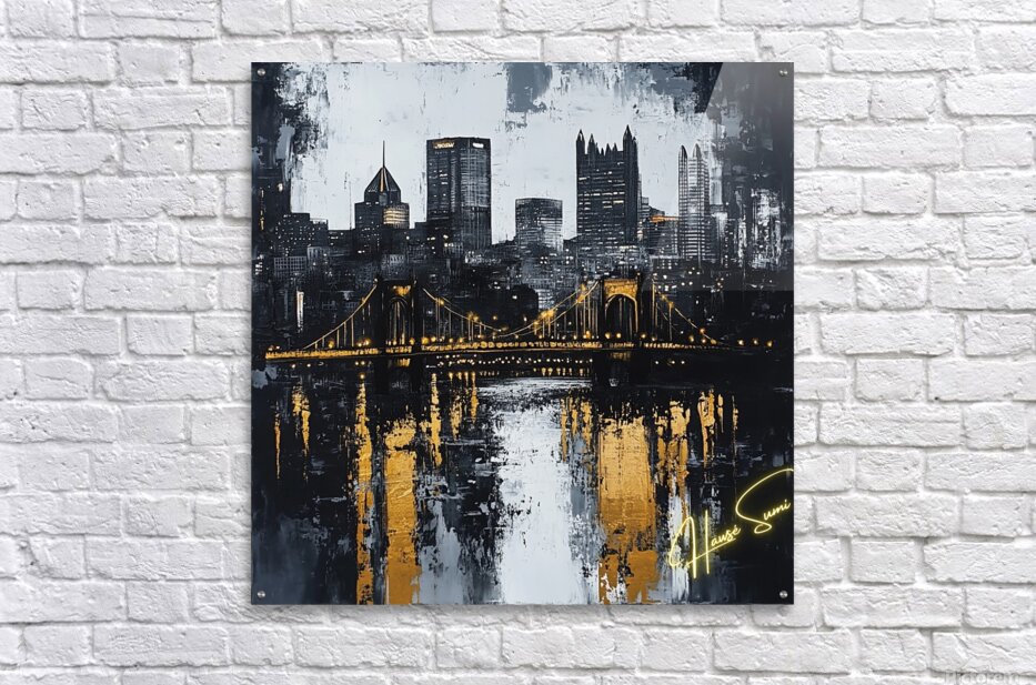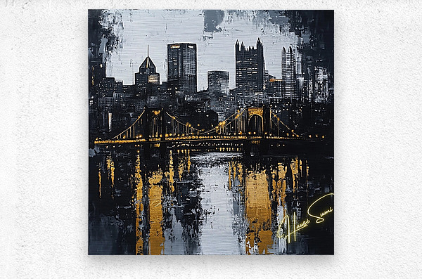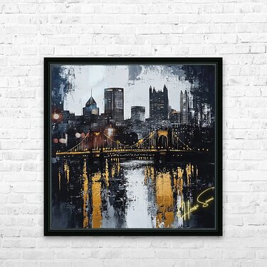 A nocturnal tribute to Pittsburgh’s heartbeat, this cityscape captures the golden suspension bridge glowing like a spinal cord of steel and pride. T...[+]