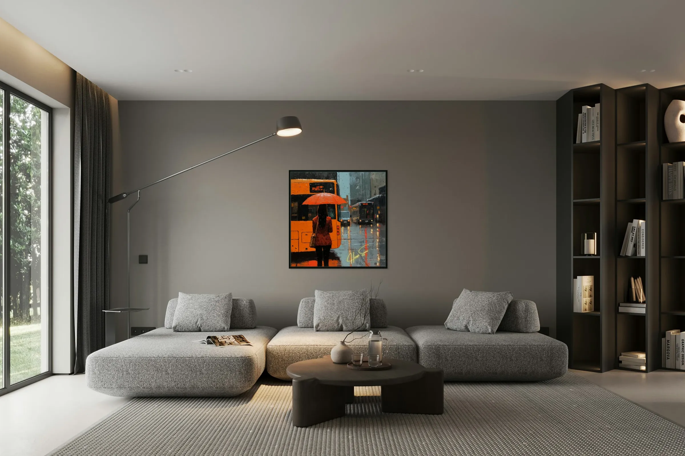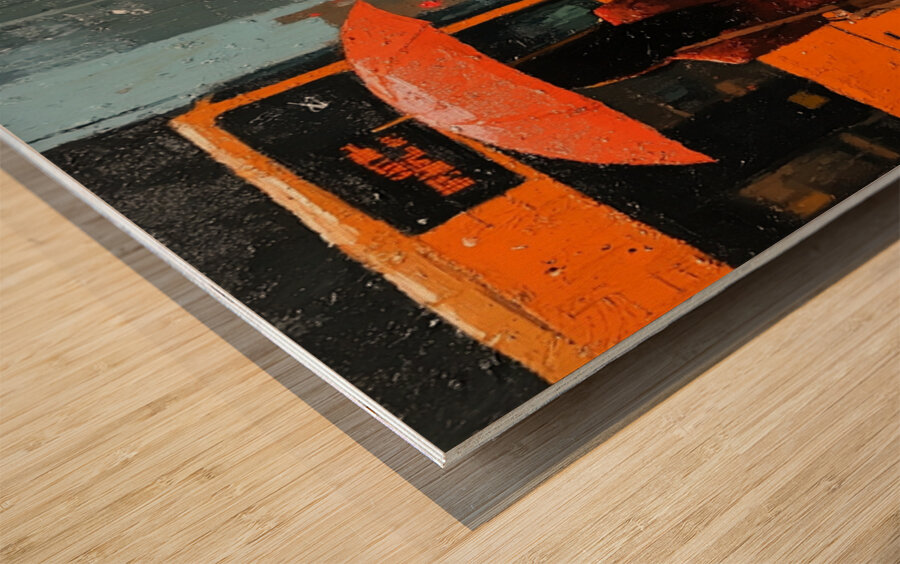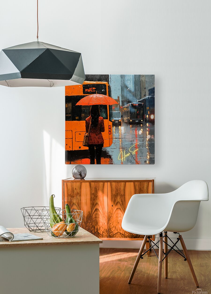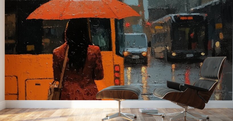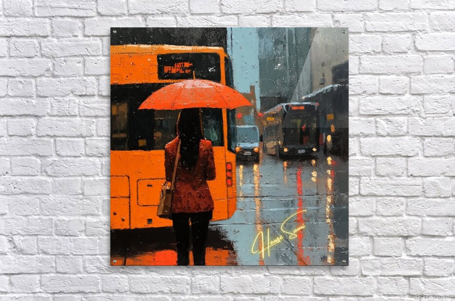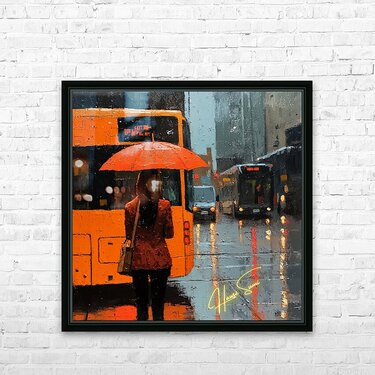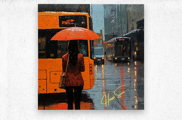 A quiet moment under the rain becomes a study in vibrant solitude. The city’s blur contrasts with her bold stance and orange umbrella, representing determination even in downpours. She is paused—but never powerless.