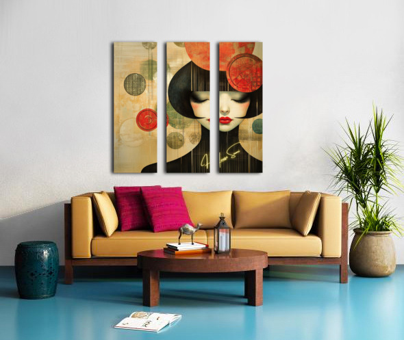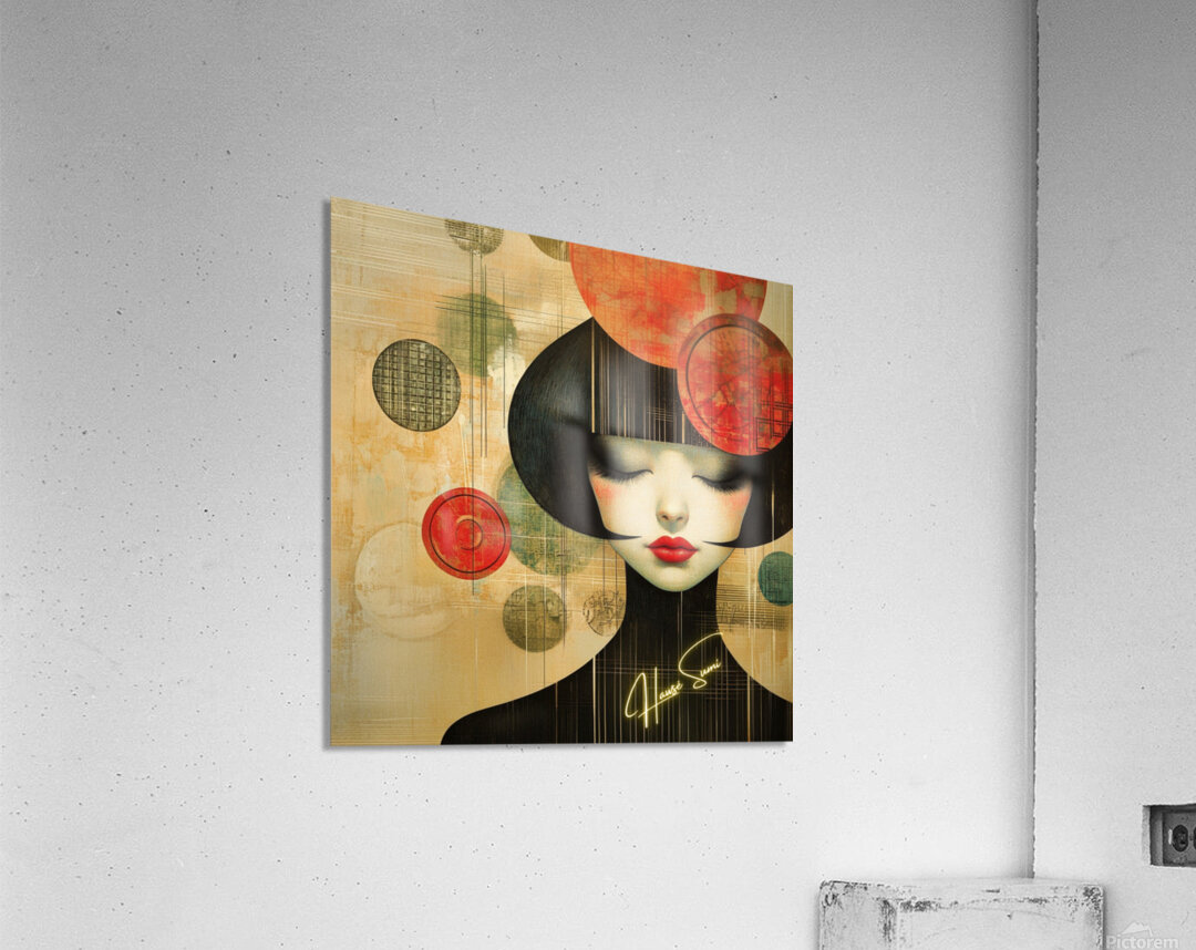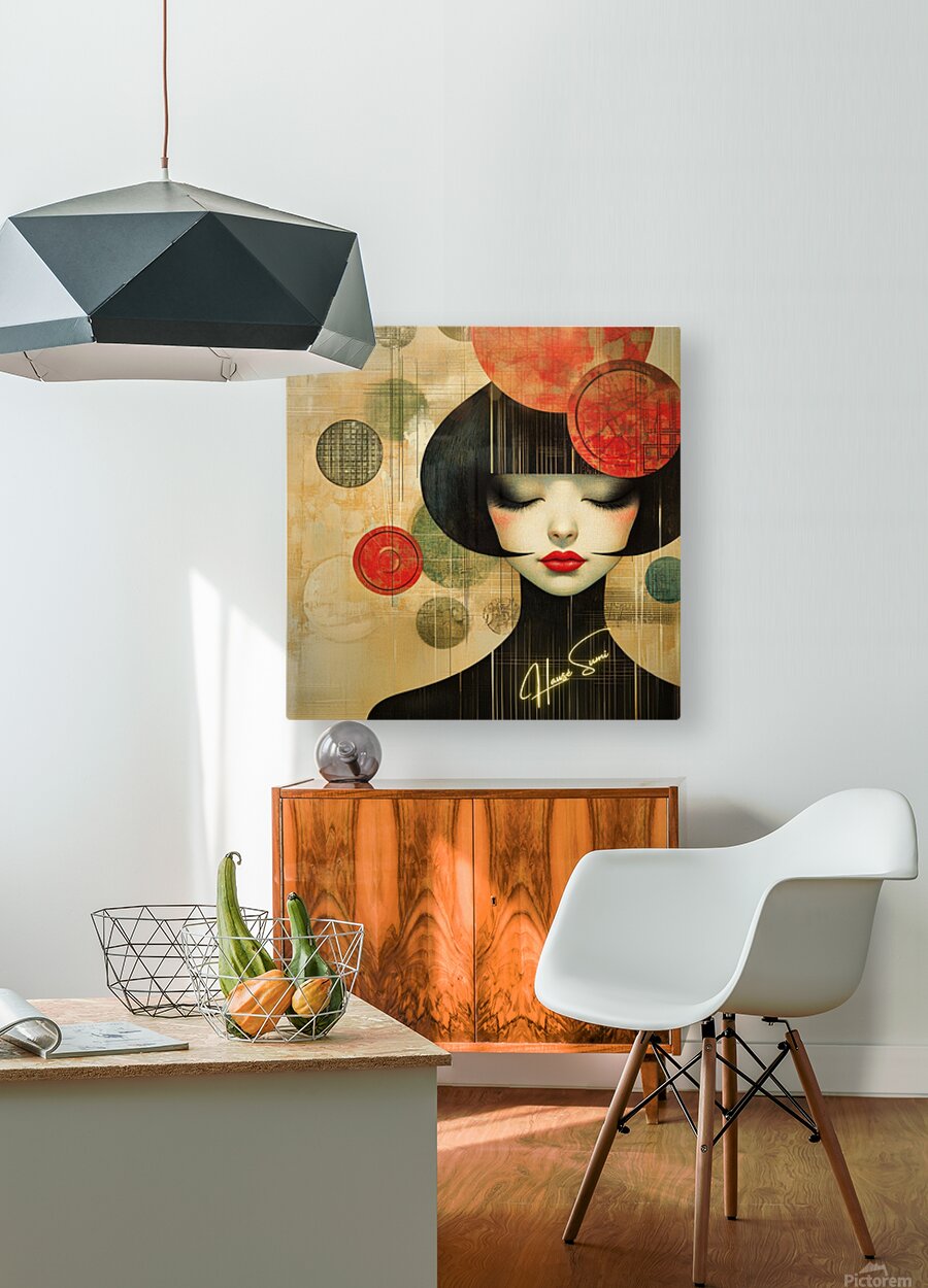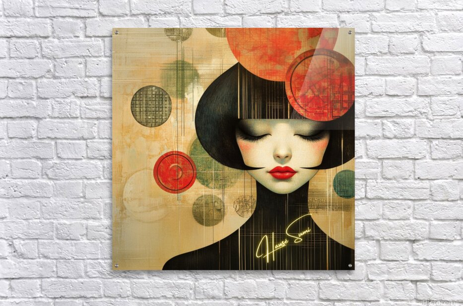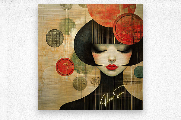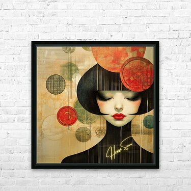 A modern tribute to stillness and structure, this piece harmonizes tradition with abstract geometry. The closed eyes and perfect symmetry invite the viewer into a meditative state, framed by circular vibrations and the bold red of intuition and poise.