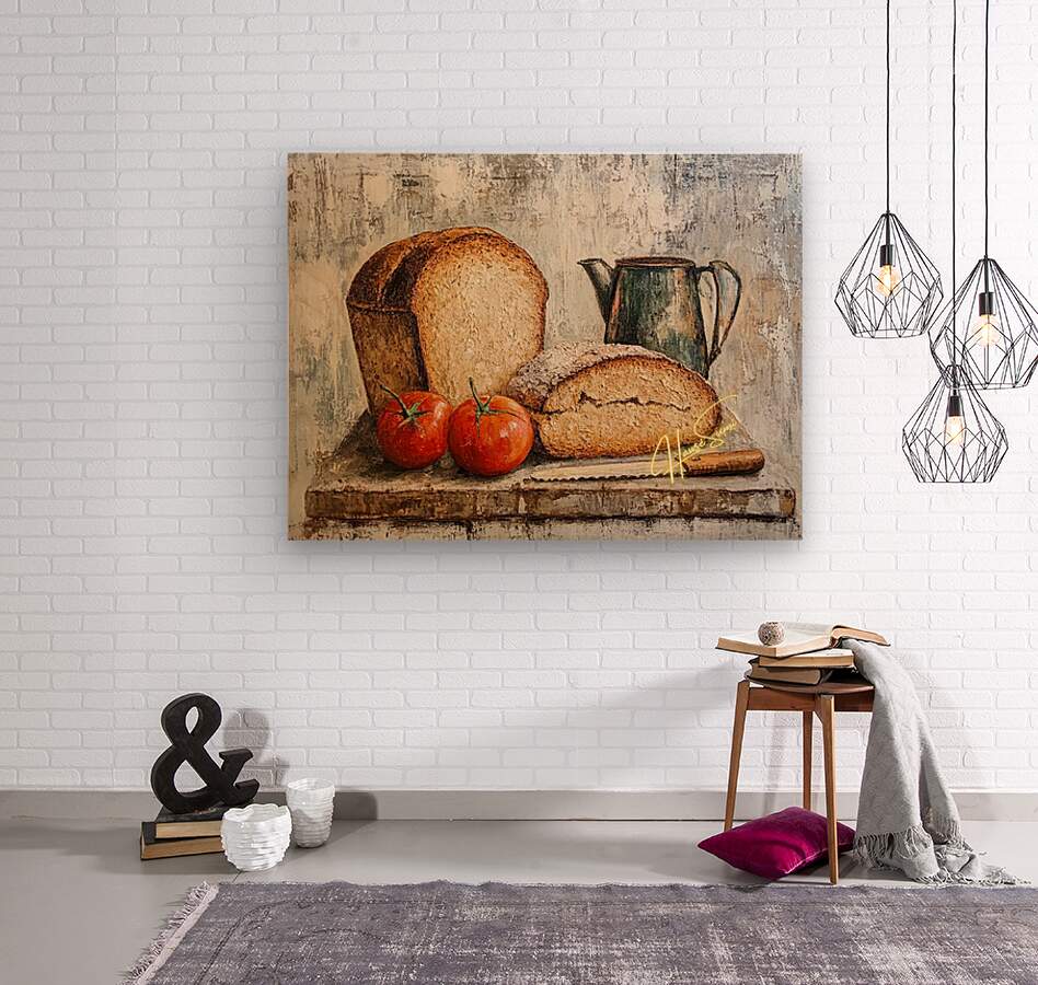 Sun-ripened tomatoes, hearty loaves, and an aged green pitcher gather like old friends at a worn-down table. The scene invites not just hunger, but memory—of kitchens filled with aroma, laughter, and the knife that always had a story behind it. The impasto-style textures make each item feel tangible, as if you could almost tear the bread or hear the scrape of the pitcher’s spout. It’s not just food—it’s heritage on a tabletop.