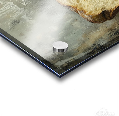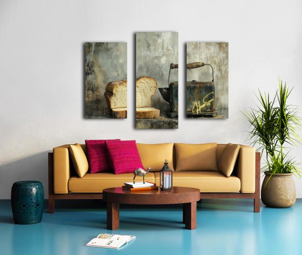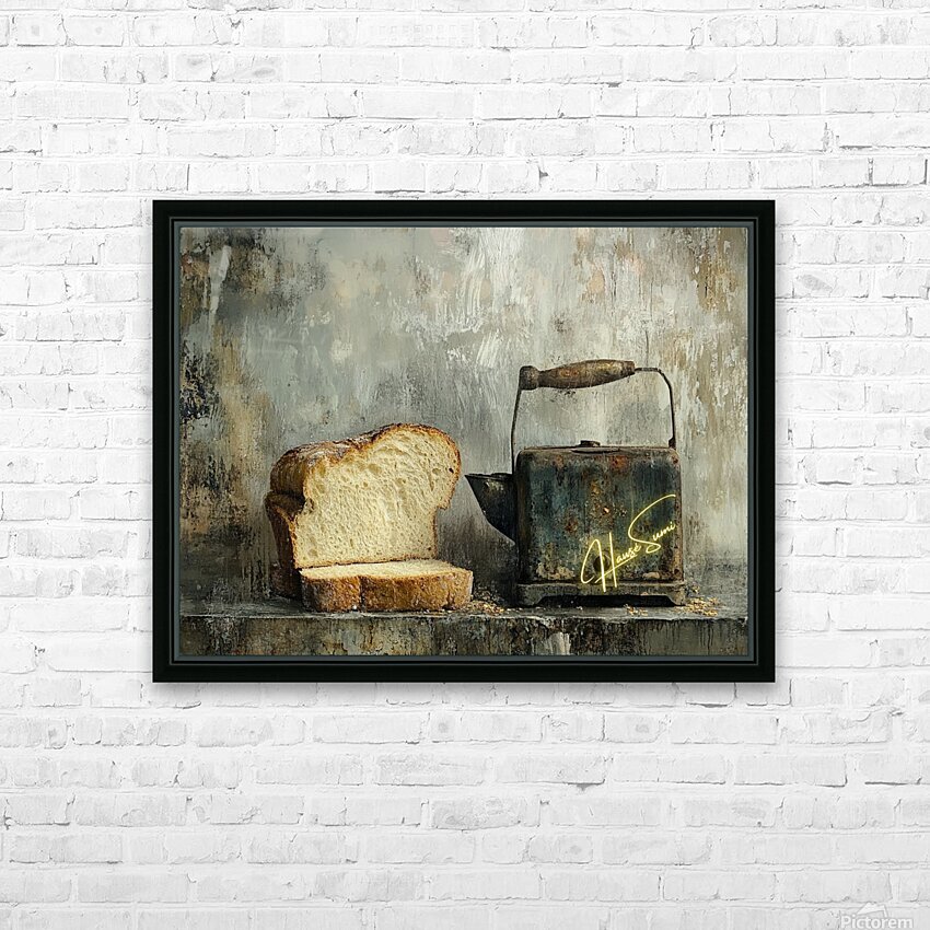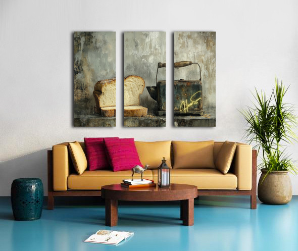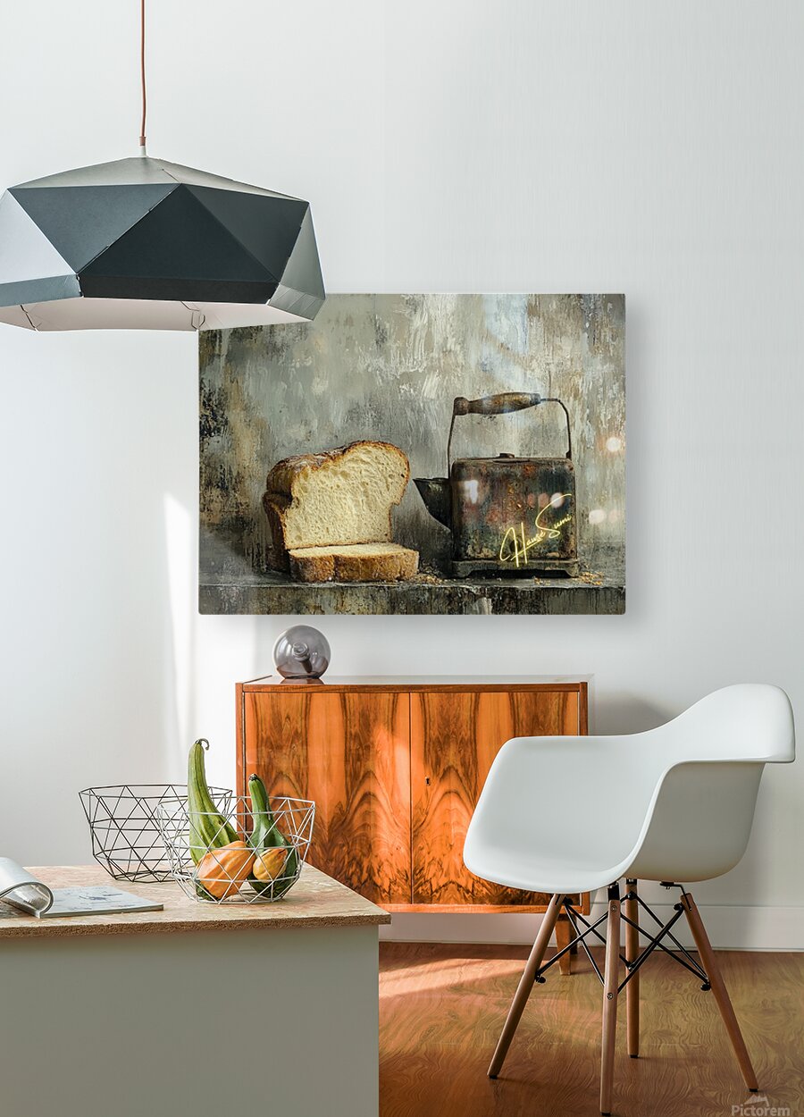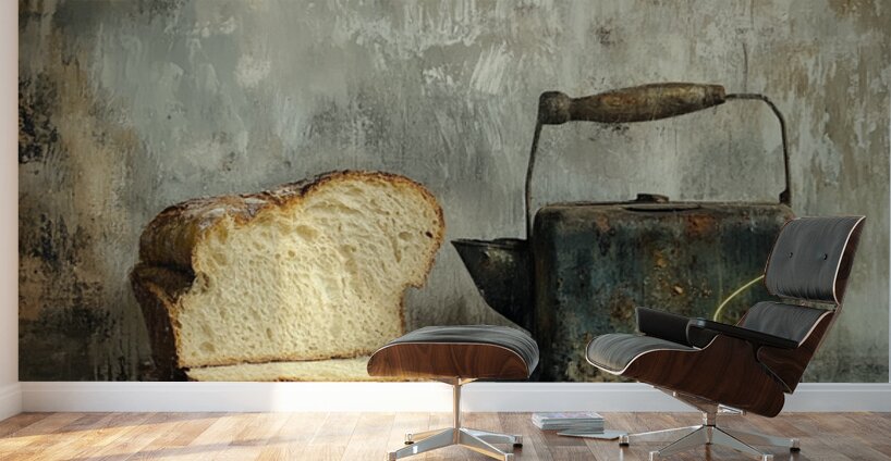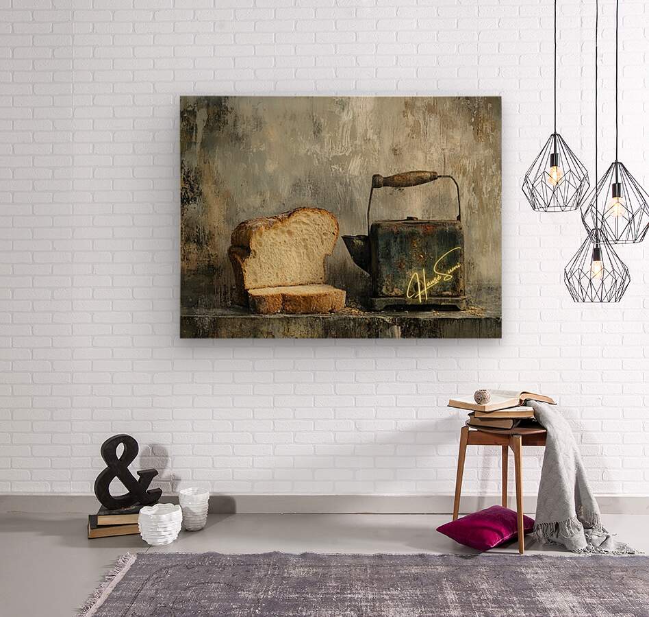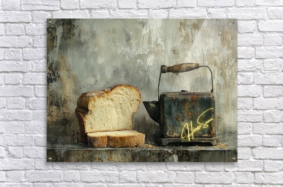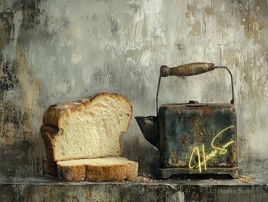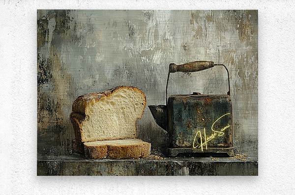 This haunting still life whispers of forgotten mornings. A thick-cut loaf, imperfect and beautiful, leans into the shadow of a rusted kettle—both symbols of survival and simplicity. The chipped handle, the weathered metal, and scattered crumbs speak not of poverty, but of persistence. It’s a quiet portrait of endurance, framed in earthy, muted tones that evoke warmth, struggle, and nostalgia.