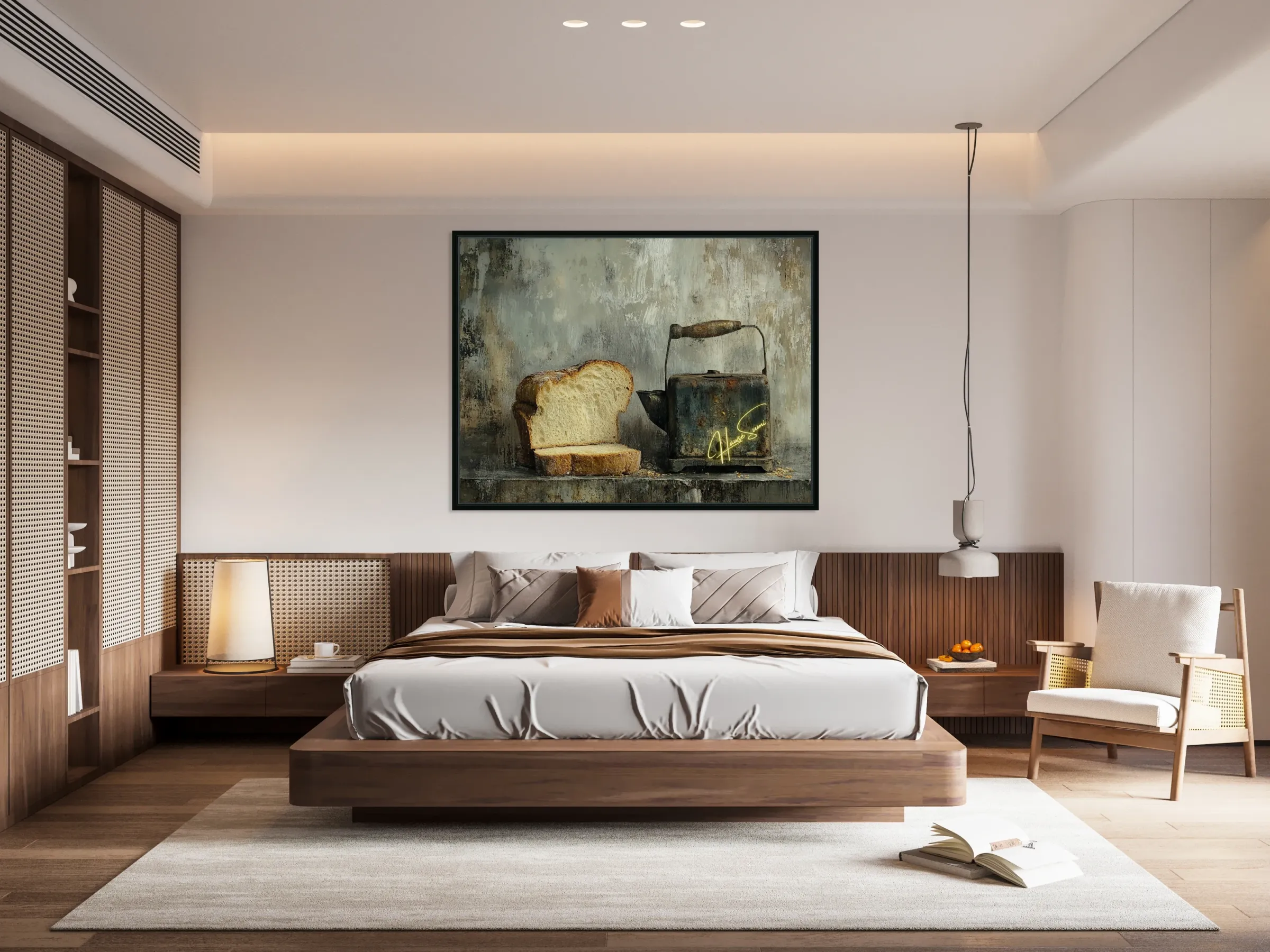 This haunting still life whispers of forgotten mornings. A thick-cut loaf, imperfect and beautiful, leans into the shadow of a rusted kettle—both sy...[+]