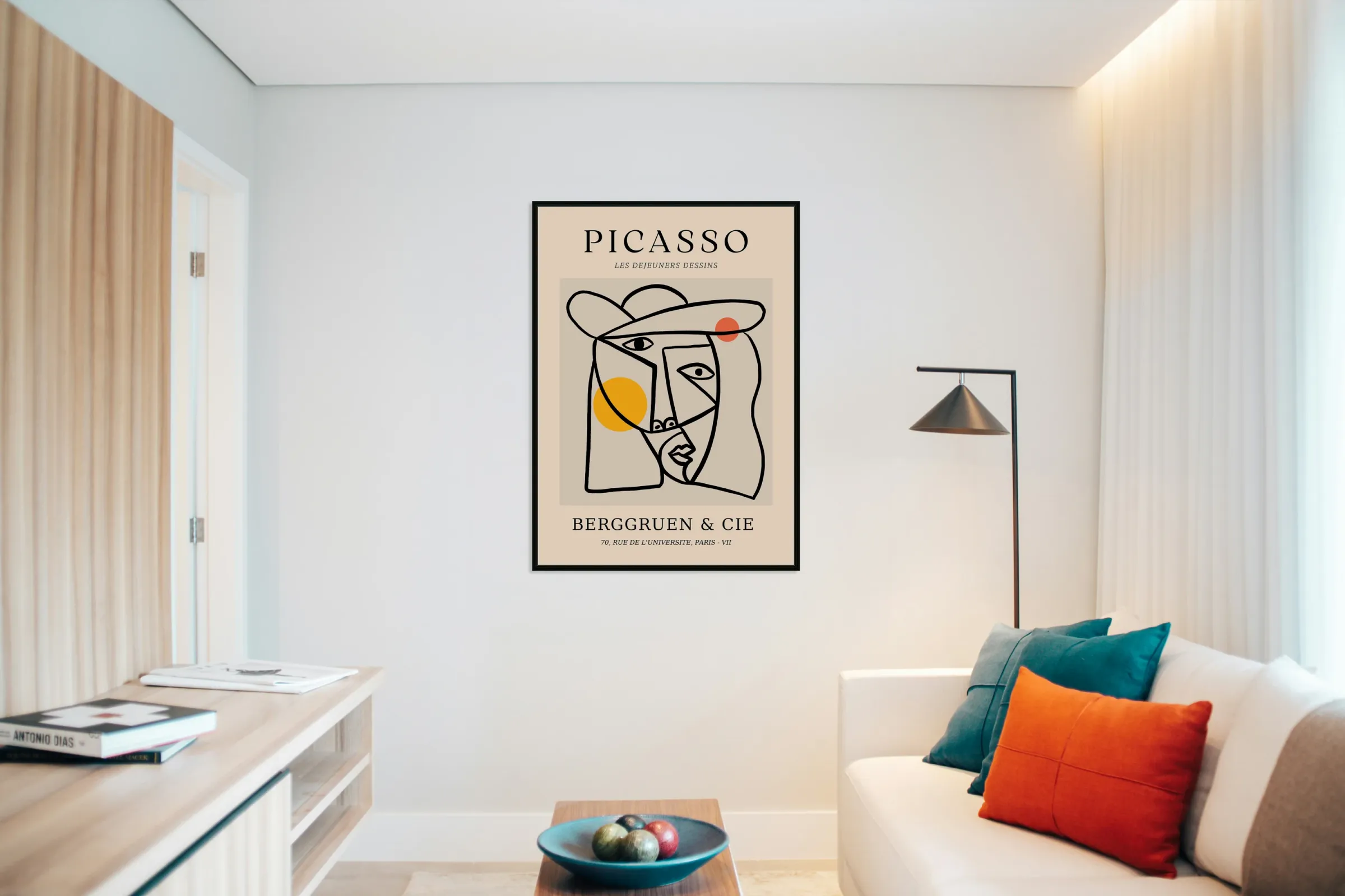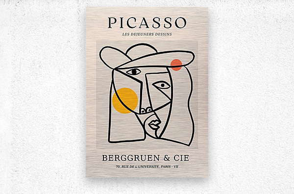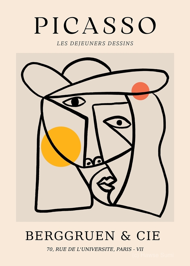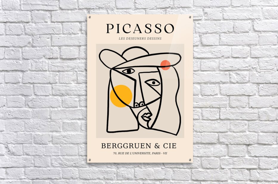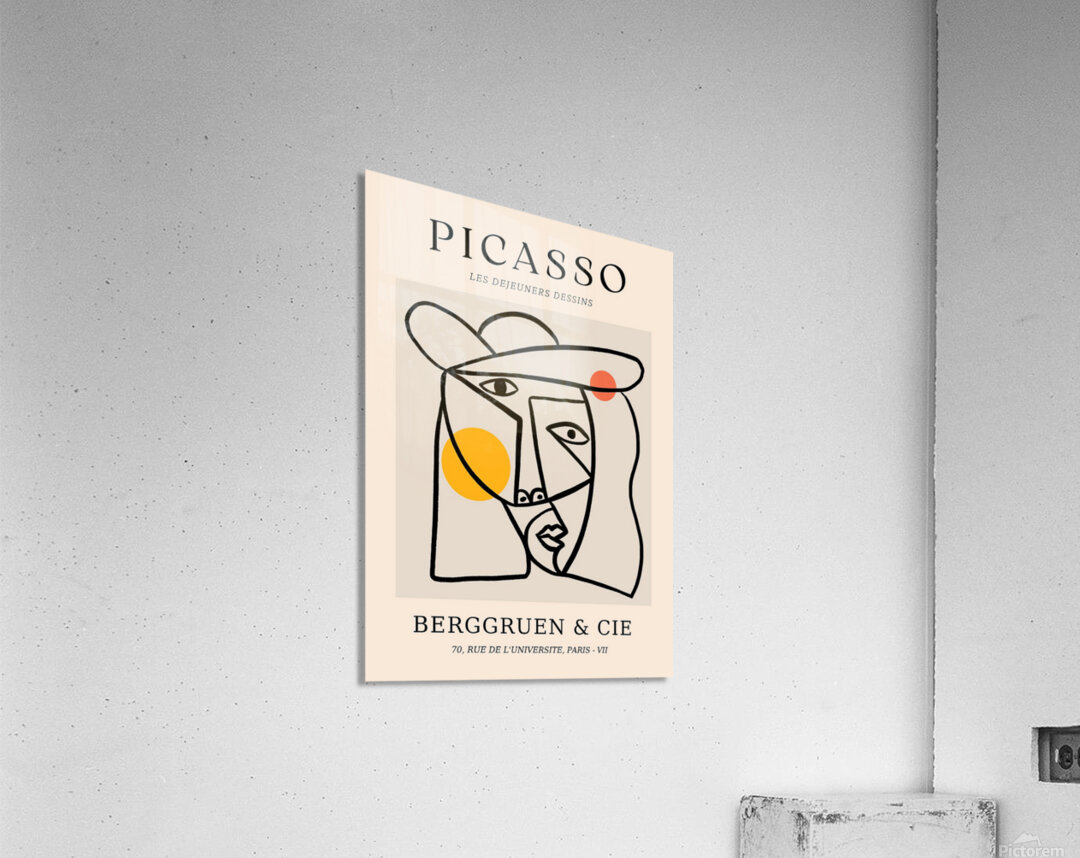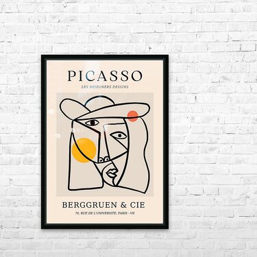Artist: Pablo Picasso Medium: Print (Reproduction) Original Style: Cubism / Line Drawing Exhibited By: Berggruen & Cie, 70, Rue de l'Université, Paris - VII This minimalist yet dynamic print reproduction is based on one of Pablo Picasso’s cubist-style line drawings, titled Les Déjeuners Dessins (“The Lunchtime Drawings”). The artwork features a stylized human face constructed from abstract, angular lines with Picasso's signature fragmented perspective. The oversized hat, simplified facial features, and bold use of color spheres—sunny yellow and deep orange—add a playful balance to the monochrome linework. Originally created during Picasso’s later period, these types of works show how he continued experimenting with simplification and symbolism. The use of flowing contours and unexpected angles is a hallmark of Picasso’s exploration of form beyond realism. This print is a modern reproduction, likely created for a gallery showing at Berggruen & Cie, a notable Parisian art gallery that frequently featured Picasso’s work. Art Historical Context: Picasso’s line drawings became increasingly celebrated in the 1950s–70s, showcasing how he could communicate complex human expression and identity with minimal strokes. Les Déjeuners Dessins belongs to a body of work where lunch, conversation, and social rituals are expressed through symbolic abstraction—an echo of his early 20th-century Les Demoiselles d'Avignon and cubist masterpieces, but in a more fluid, gestural style.
