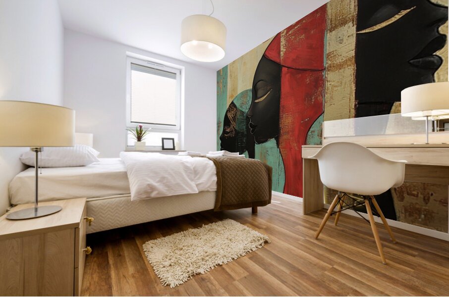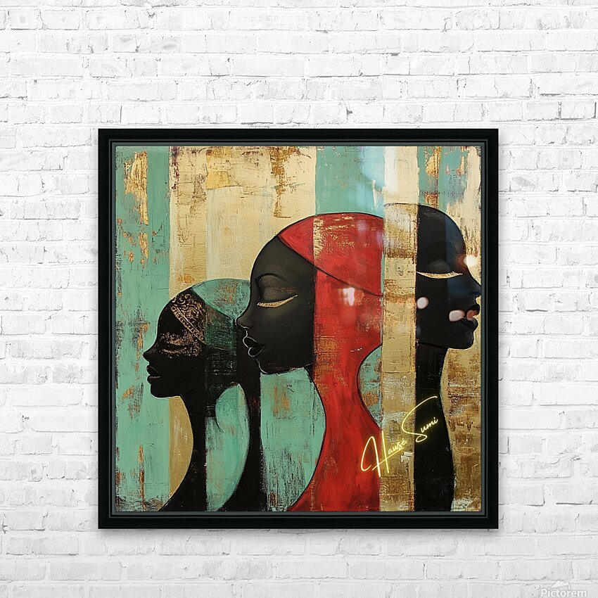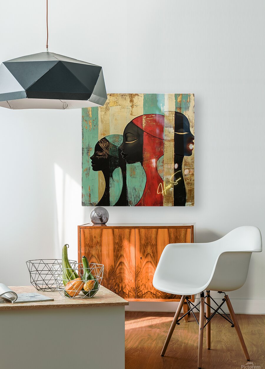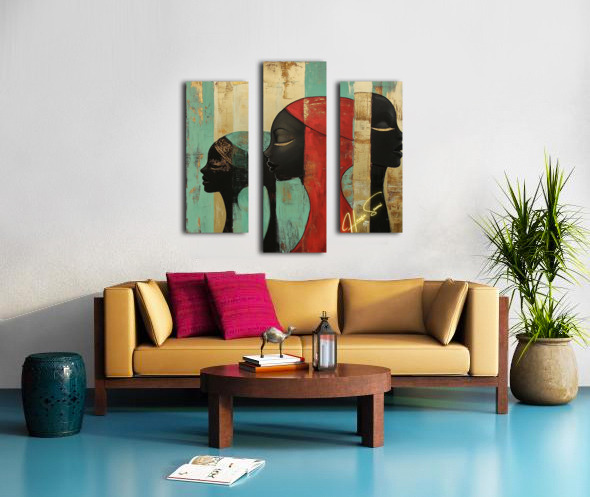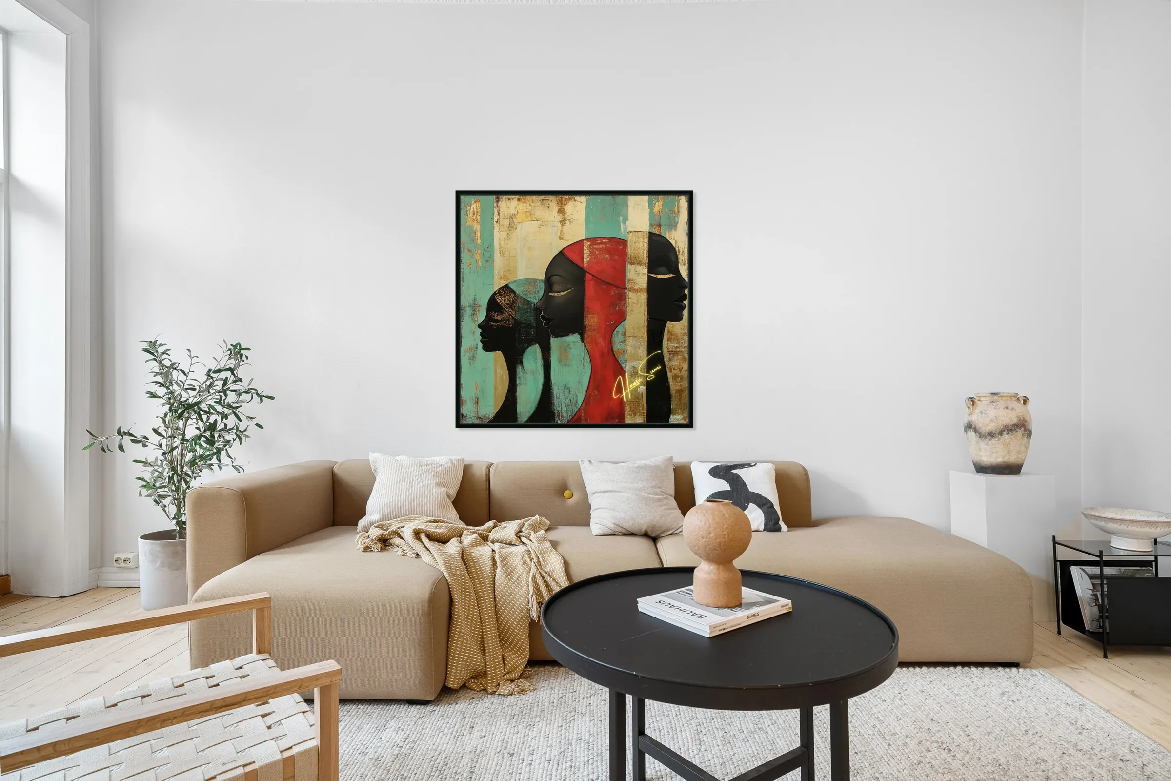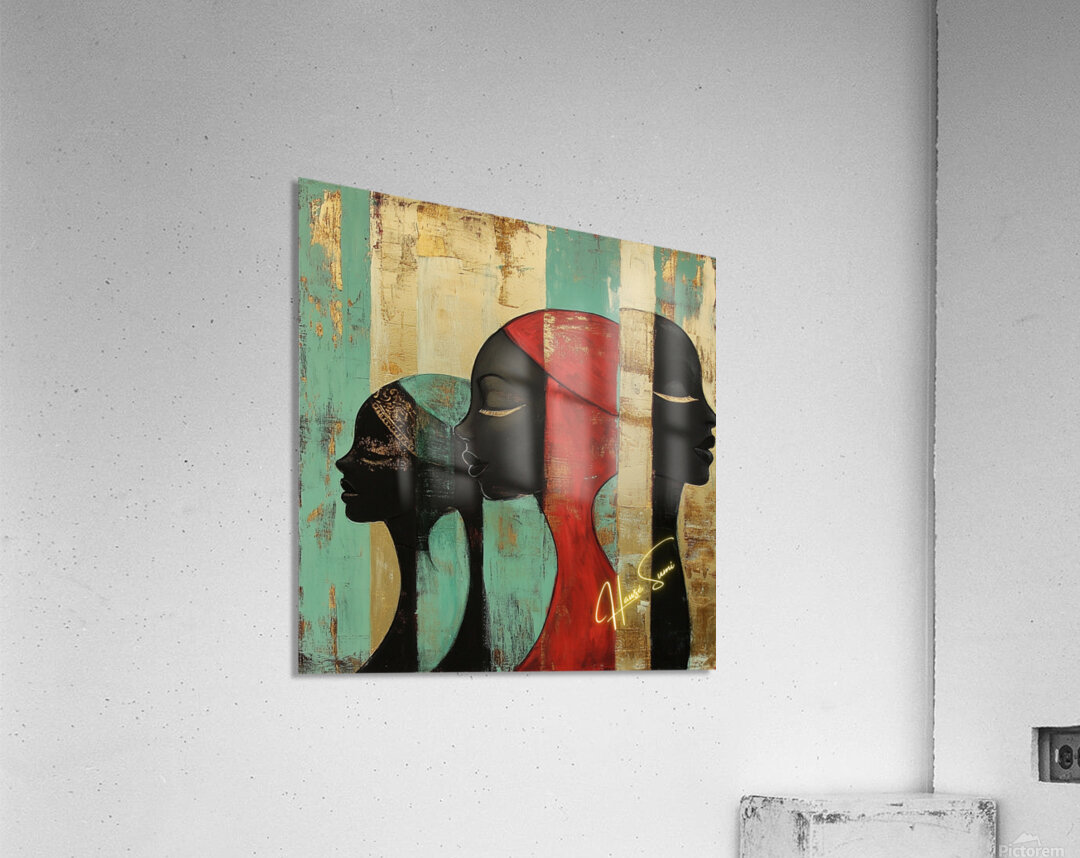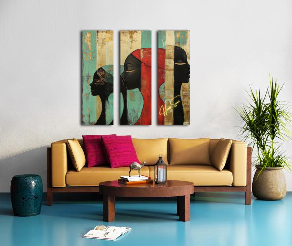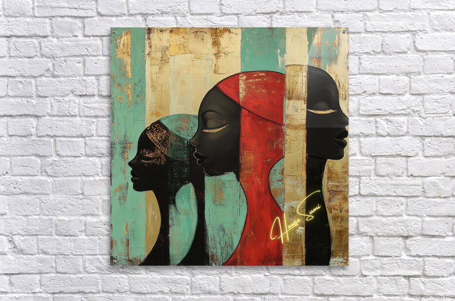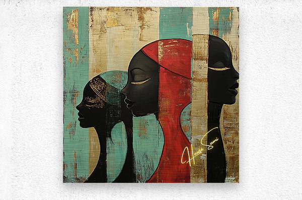 Three women, three eras, one silhouette. This piece symbolizes the generational echo of Black femininity and power. With each profile adorned in hues of gold, red, and teal, their presence moves silently but boldly through time.