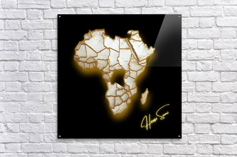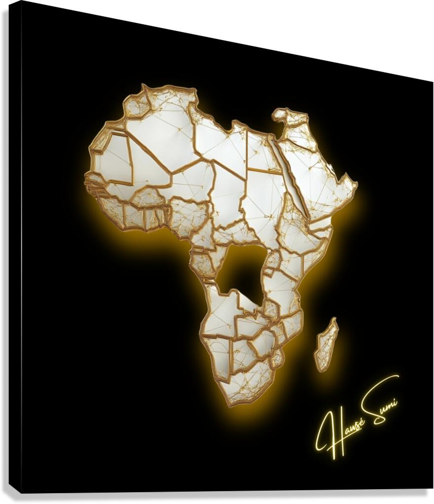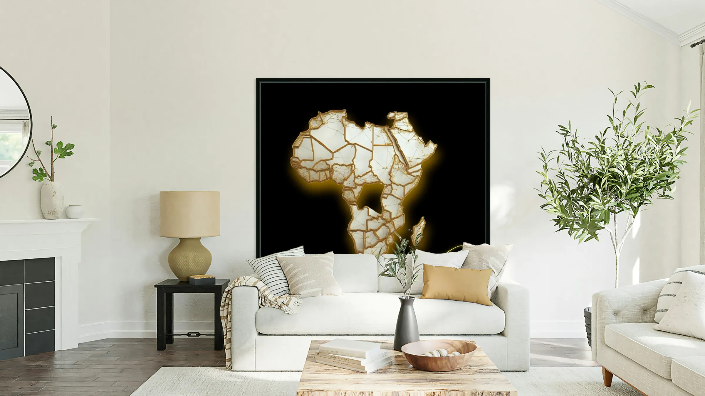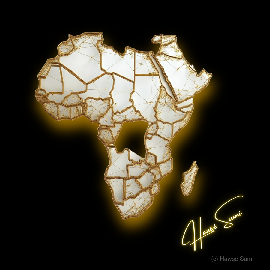 This radiant interpretation of the African continent glows from within—each country a pane of frosted glass held together by golden seams and radiant nodes. It suggests a future where borders are no longer barriers, but circuits of collaboration, culture, and digital rebirth. The map glows with connection, innovation, and clarity—an ode to Africa’s rising brilliance in global consciousness and tech evolution. This is not just a map—it’s a motherboard of heritage, vibrating with memory, hope, and interdependence.