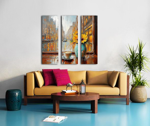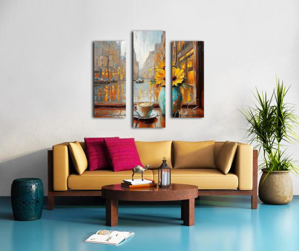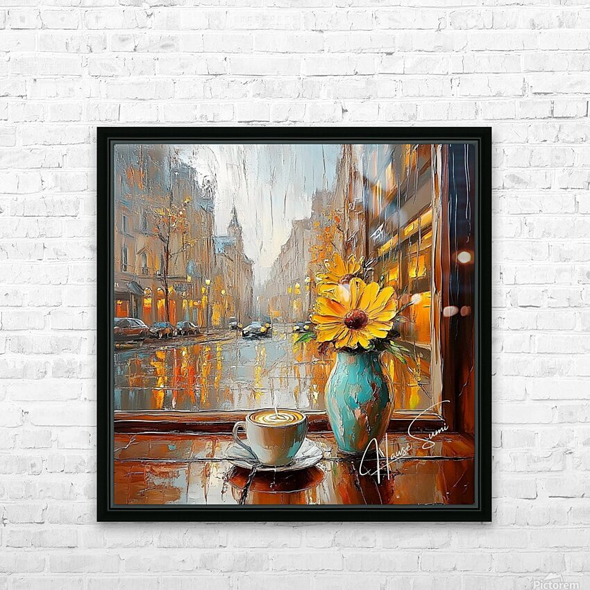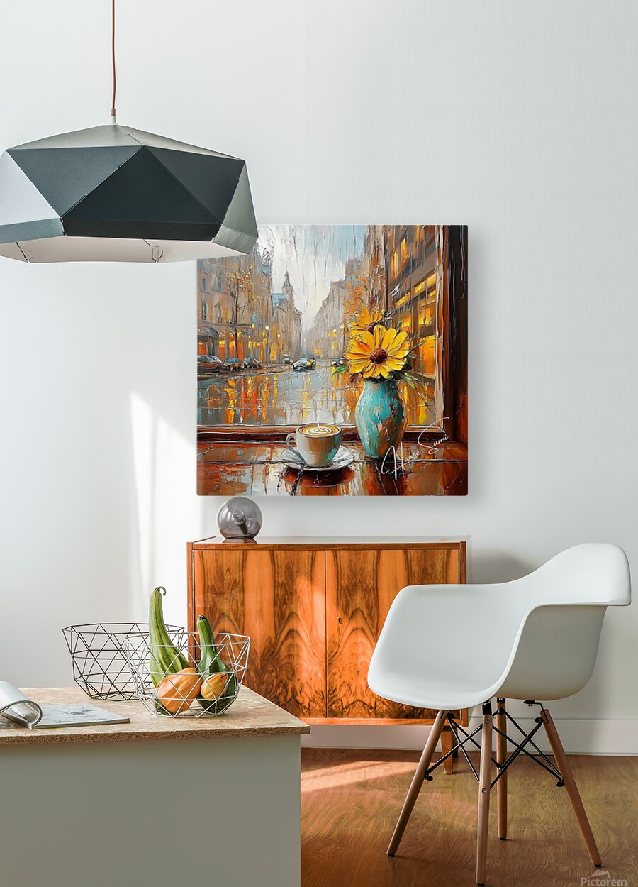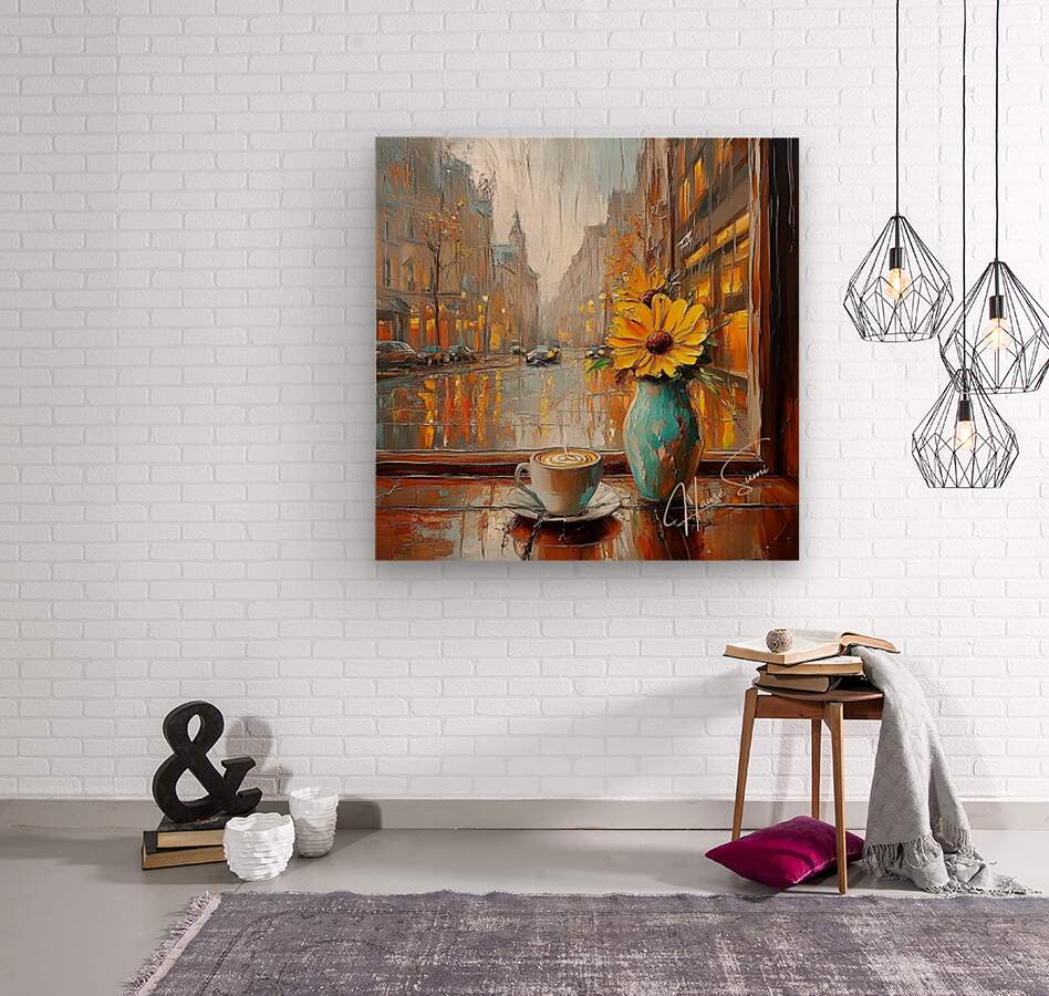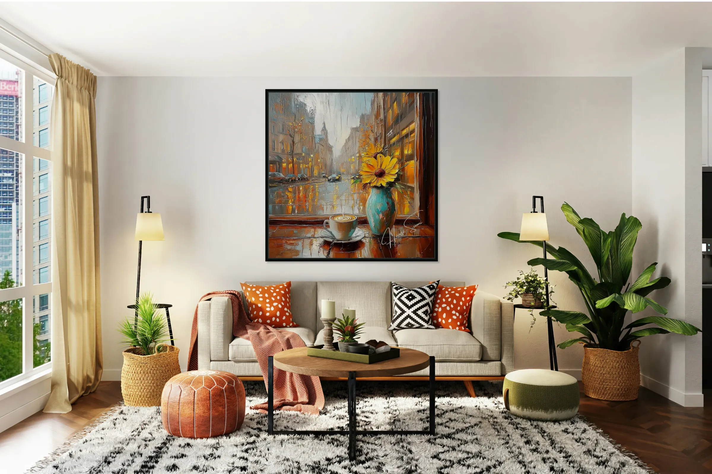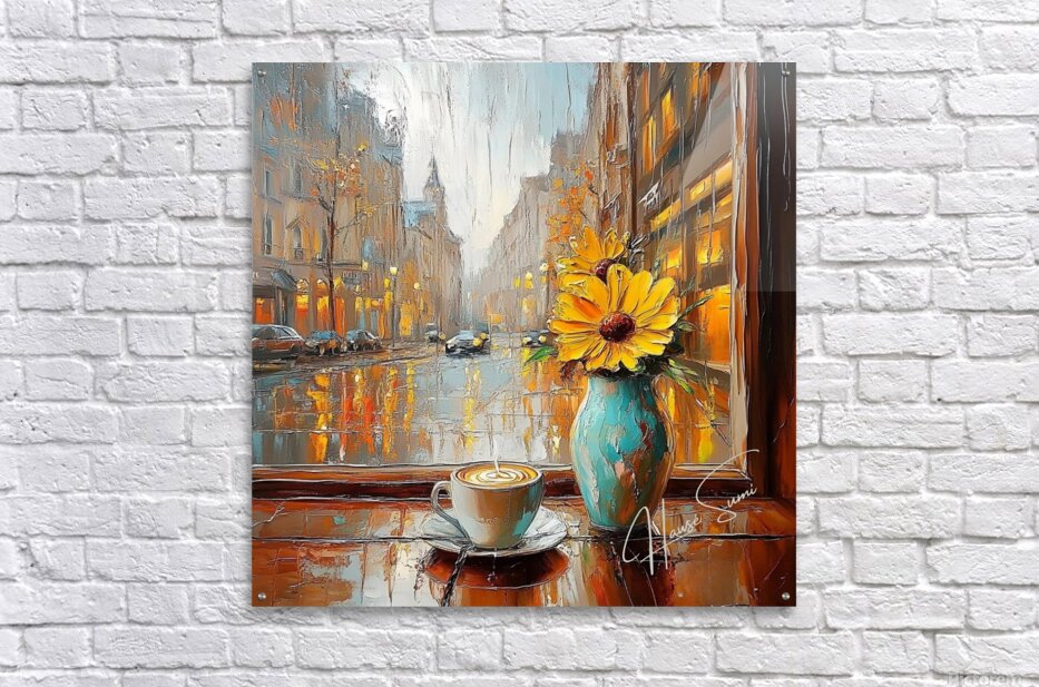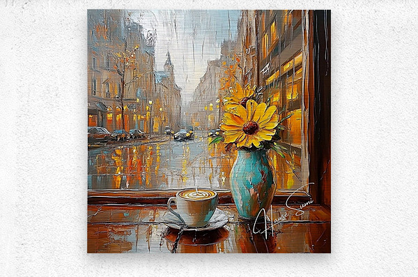 This glowing morning-after scene captures the precise moment when rain ends and life resumes. Sunflowers in a teal vase soak in the light while a freshly poured latte cools in anticipation of thought, reflection, or maybe love.