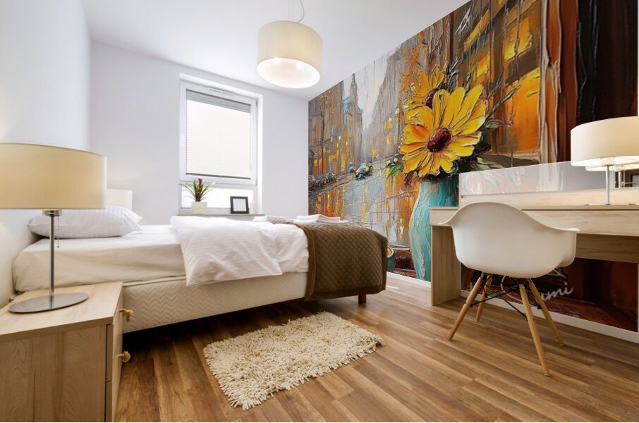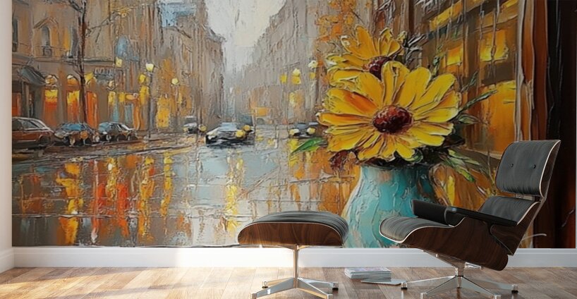 This glowing morning-after scene captures the precise moment when rain ends and life resumes. Sunflowers in a teal vase soak in the light while a fres...[+]