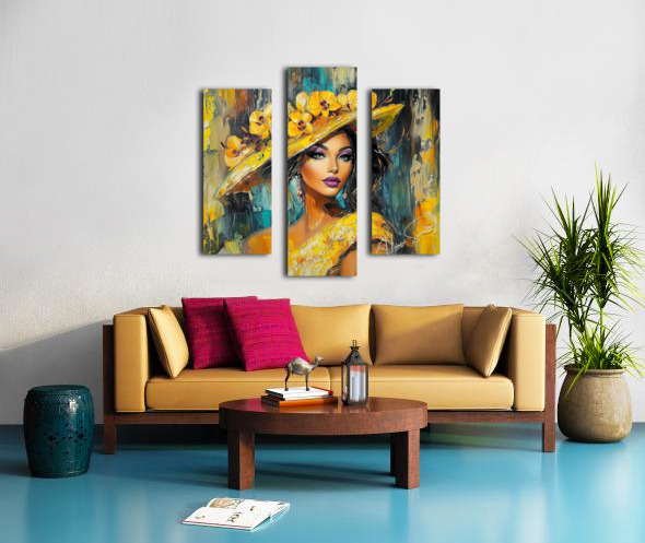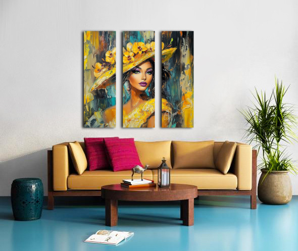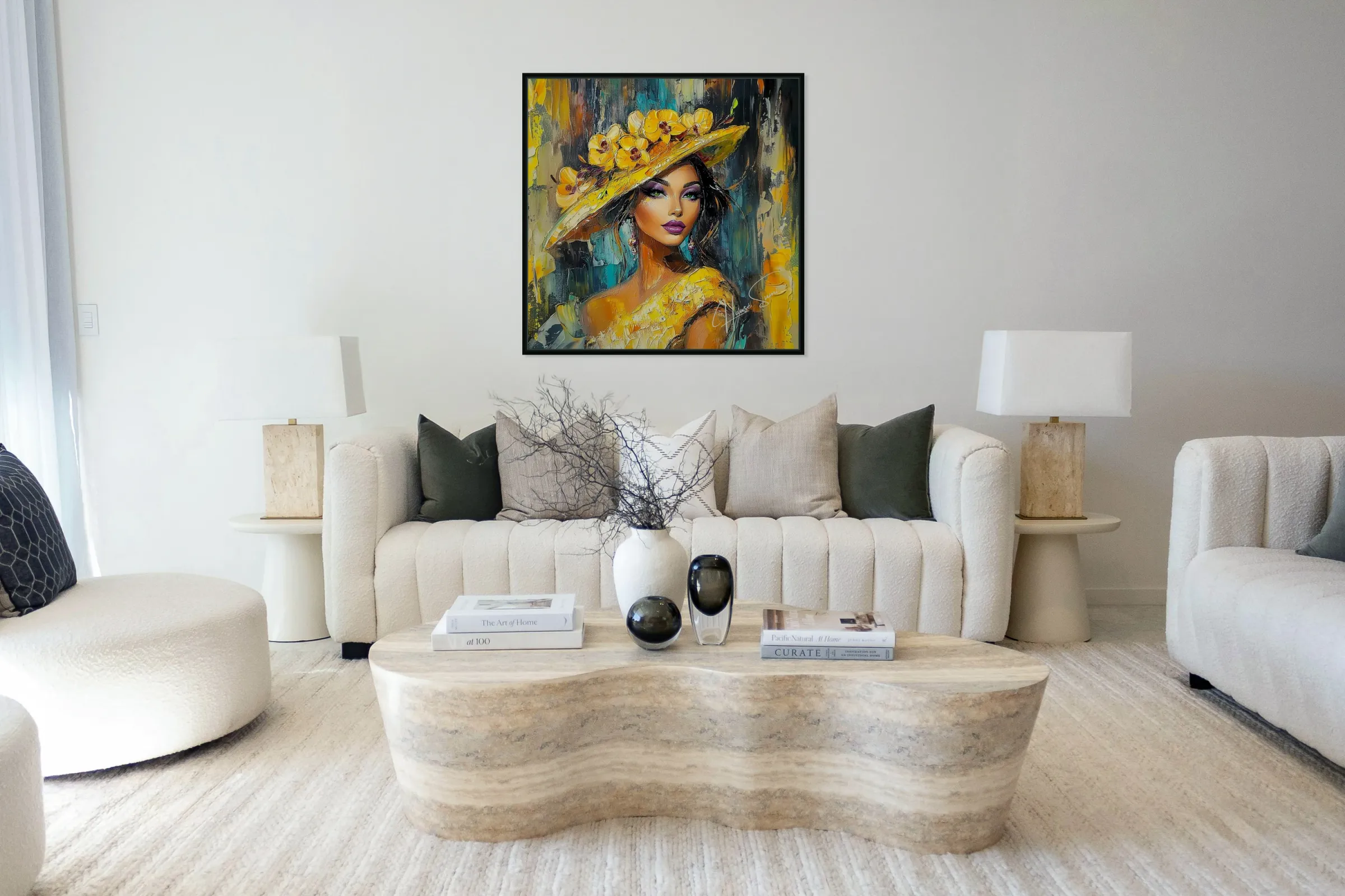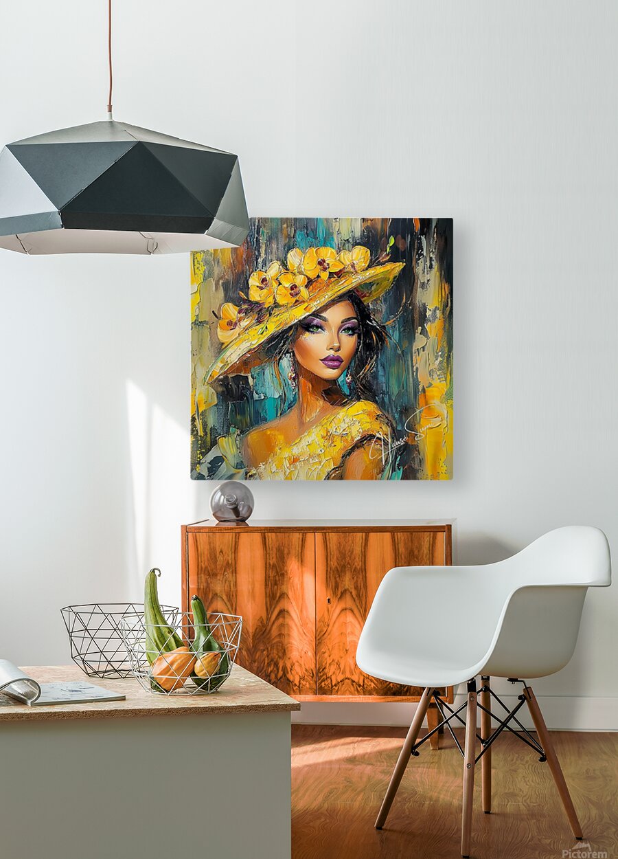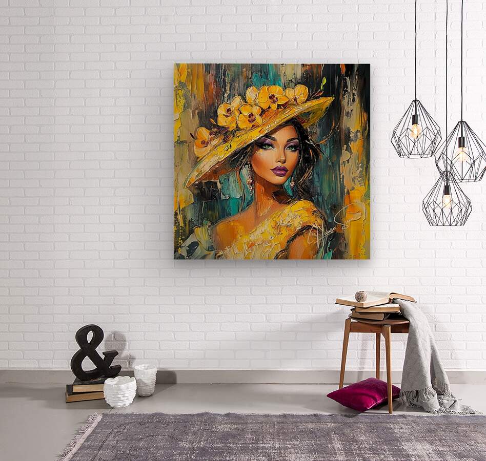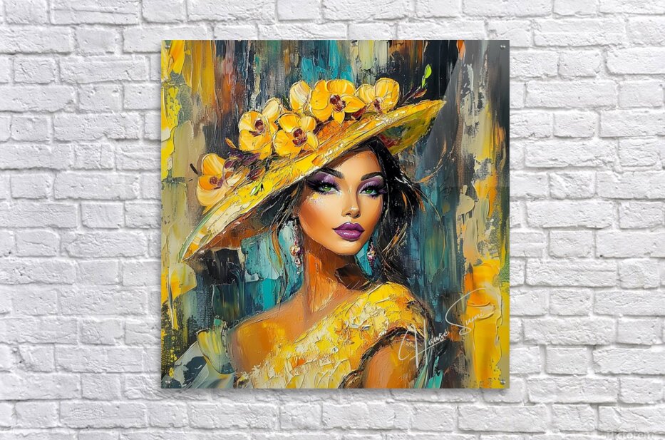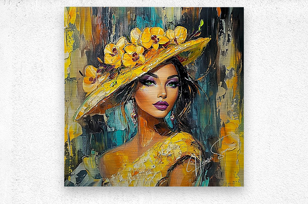 A woman of regal presence dons a crown of golden orchids on a sunlit yellow hat, her violet lips and electric green eyes mirroring both power and poetry. She stands against a backdrop of painterly chaos—where teal, gold, and sienna collide—yet remains composed, untouched, unforgettable.