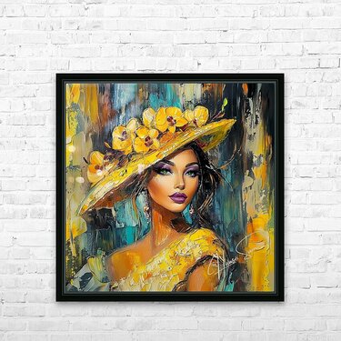 A woman of regal presence dons a crown of golden orchids on a sunlit yellow hat, her violet lips and electric green eyes mirroring both power and poet...[+]