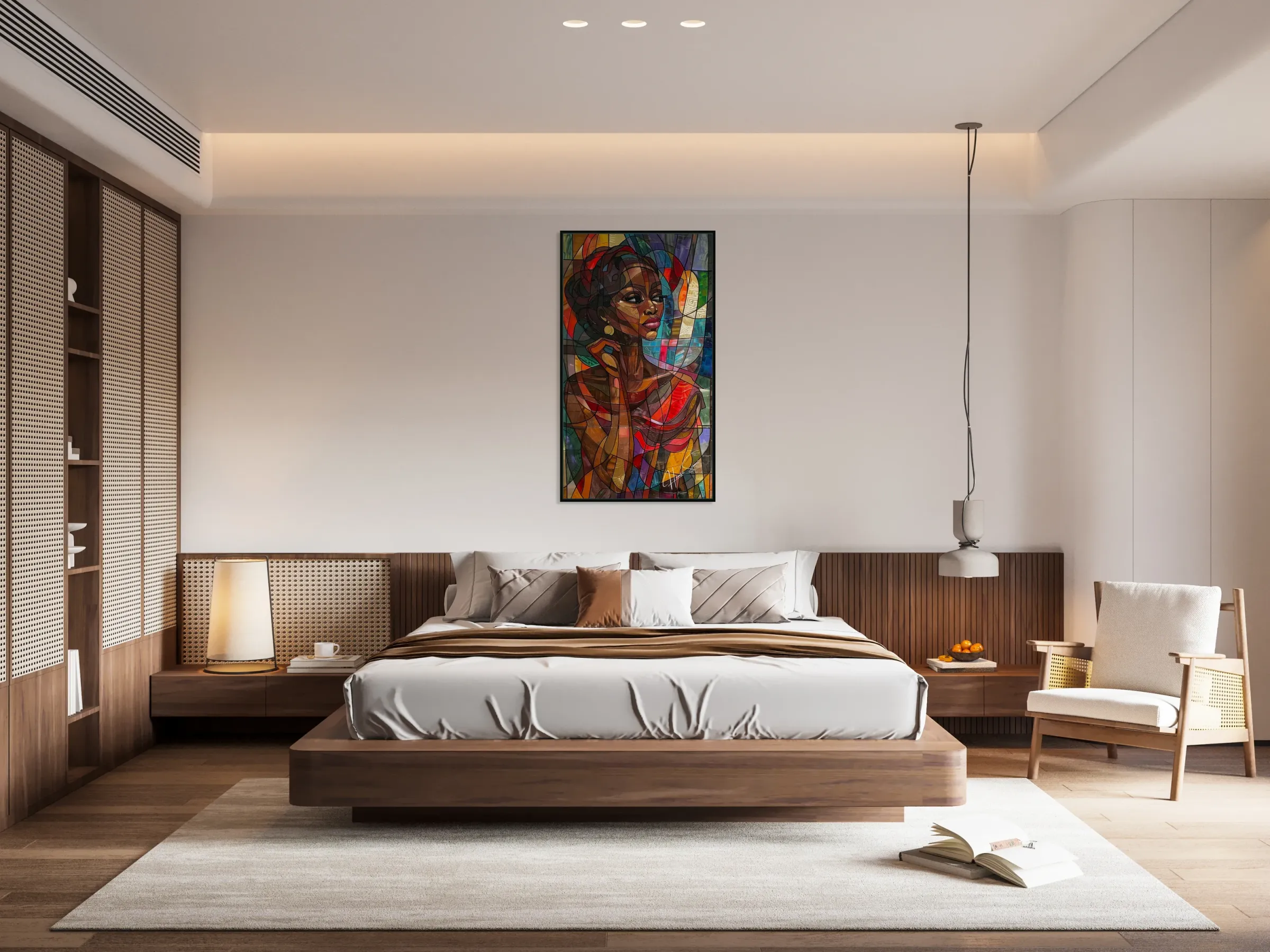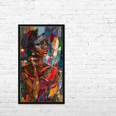 003 – "Echoes in Amber" Nia’s gaze is distant—piercing the unseen, wrapped in a cascade of warm amber, ruby, and violet tones. Her expression c...[+]