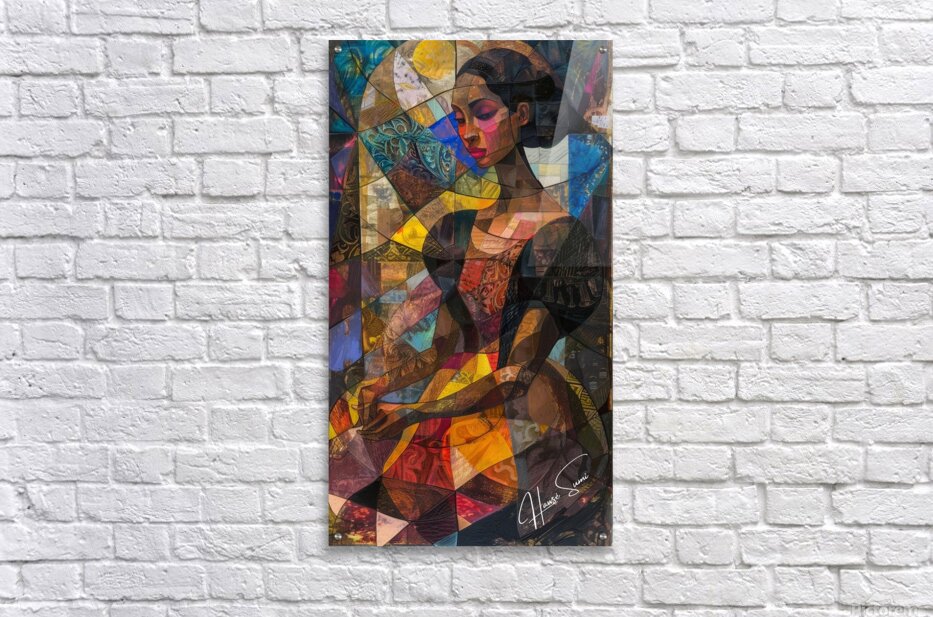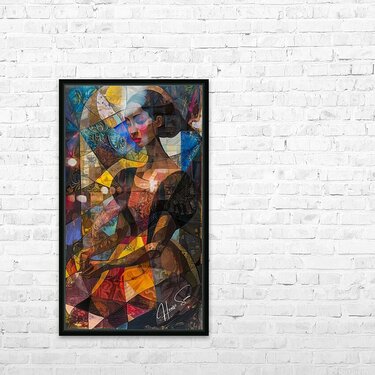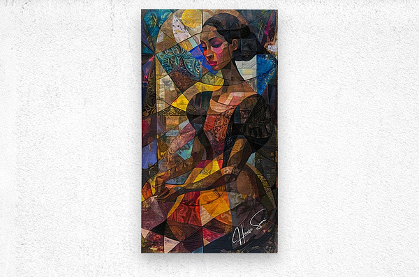 001 – "Whispers of Dawn" Amani sits in quiet reflection, her hands gently clasped as if holding the morning light. Bathed in warm reds, golds, and blues, her essence is both serene and knowing. The layered mosaic hints at a journey inward—where color meets memory and silence speaks.