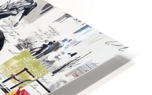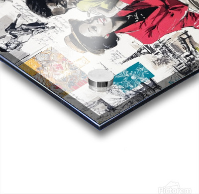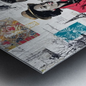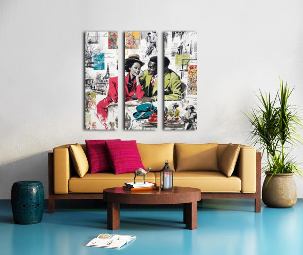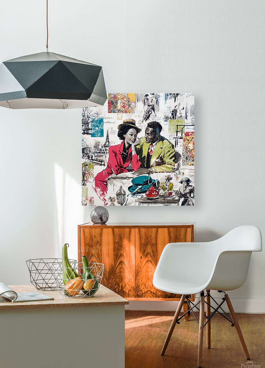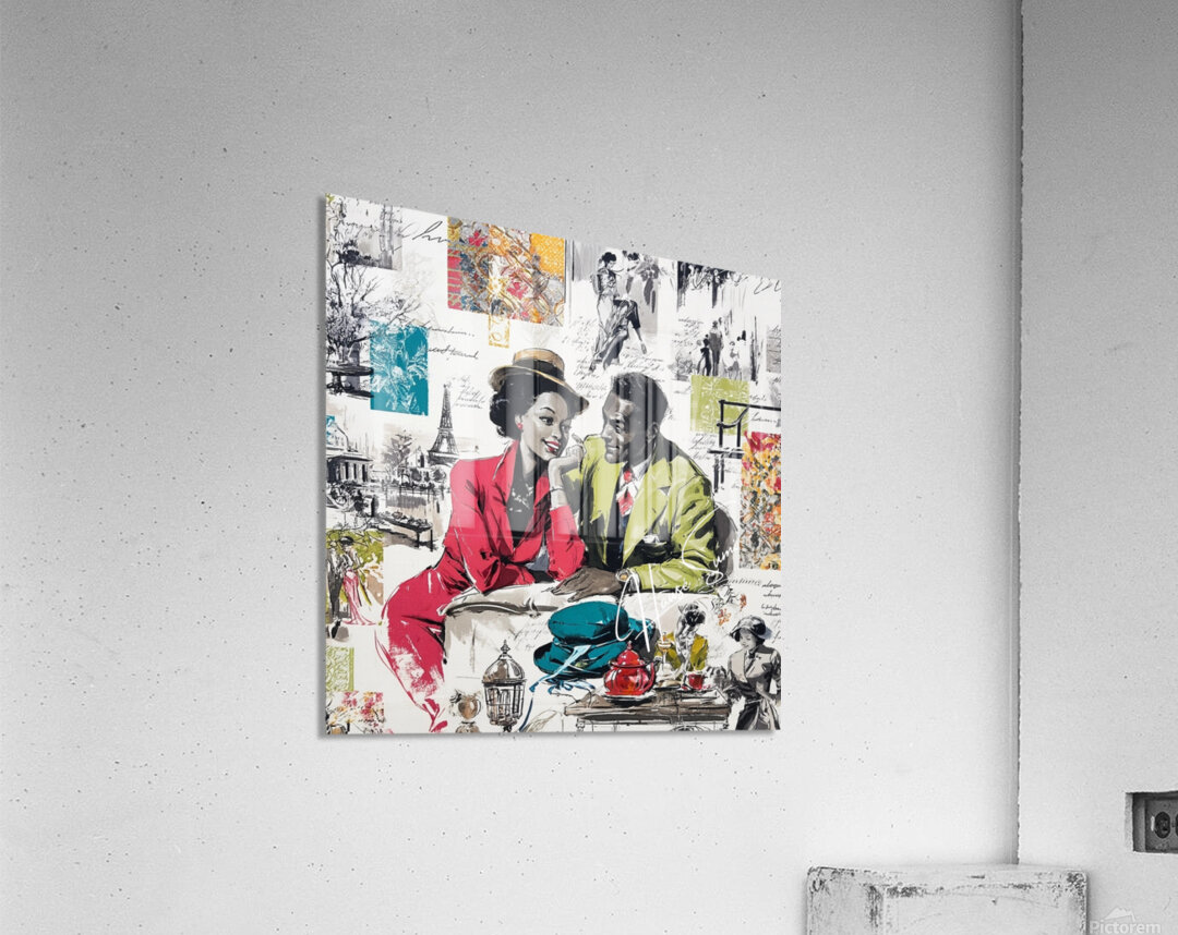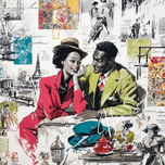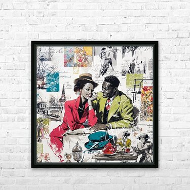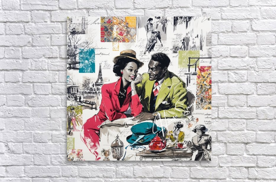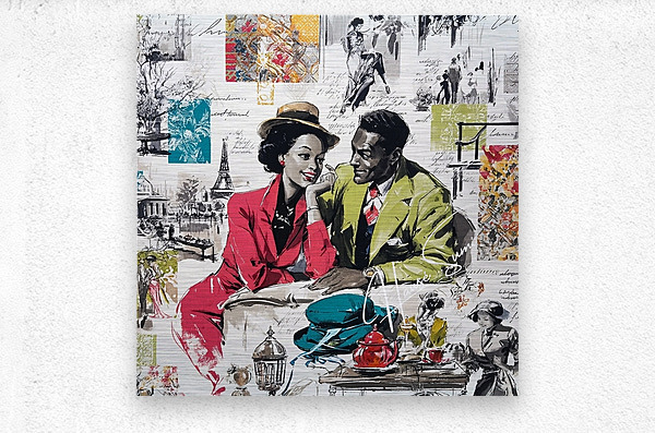 This vibrant and nostalgic artwork captures a romantic moment between a stylish couple seated at a Parisian café, evoking the charm and elegance of mid-20th-century fashion and urban life. The woman, dressed in a striking red suit and wide-brimmed hat, leans in affectionately toward her companion, who wears a green blazer and patterned tie. Surrounding them is a collage of scenes and motifs—dancing figures, handwritten script, the Eiffel Tower, colorful fabric swatches, and other vignettes—that celebrate love, leisure, and the cultural allure of Paris. The mix of grayscale sketches and bold, saturated color highlights the central figures and evokes both memory and imagination.