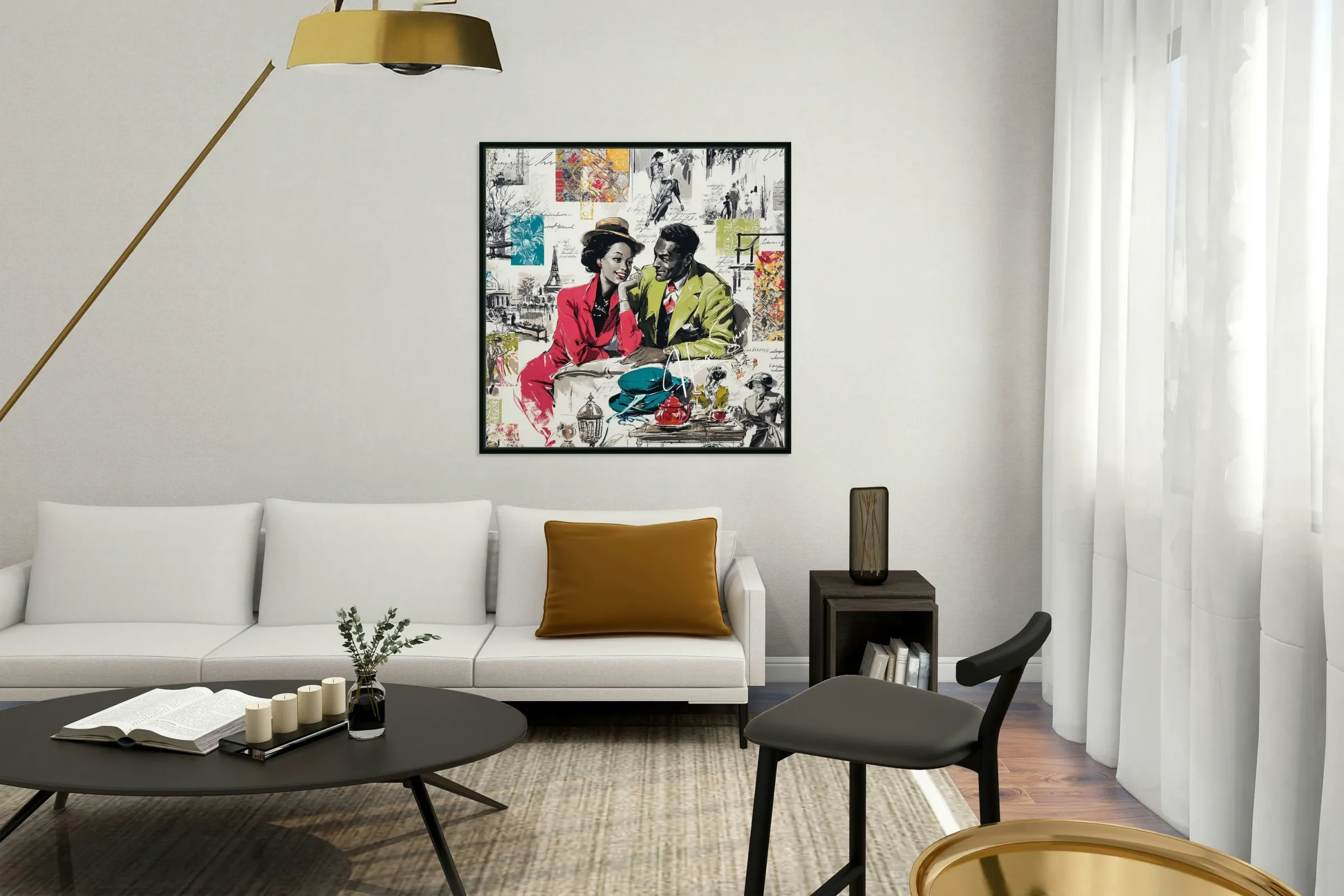 This vibrant and nostalgic artwork captures a romantic moment between a stylish couple seated at a Parisian café, evoking the charm and elegance of m...[+]