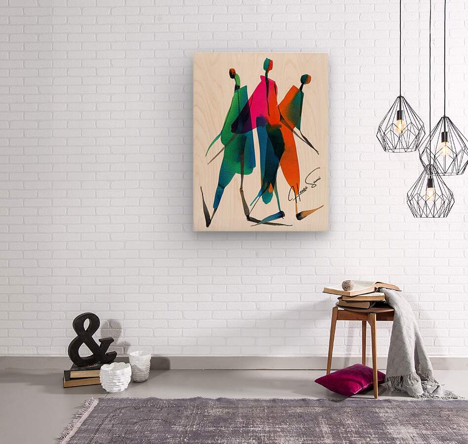 Three figures move forward in fluid unison, their translucent forms merging and separating like shifting thoughts. Each hue marks a different emotional current—green for balance, pink for vitality, orange for impulse. Together they represent motion as identity, individuality within flow.