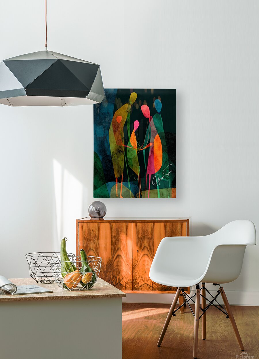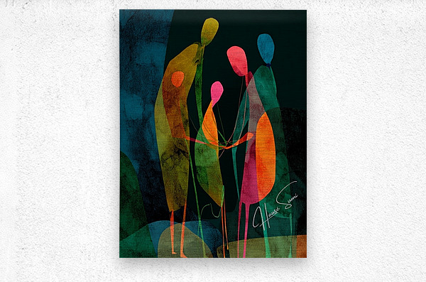 A quiet circle of elongated forms stands in communion, colors overlapping like shared memories. The dark backdrop intensifies their inner glow, sugges...[+]