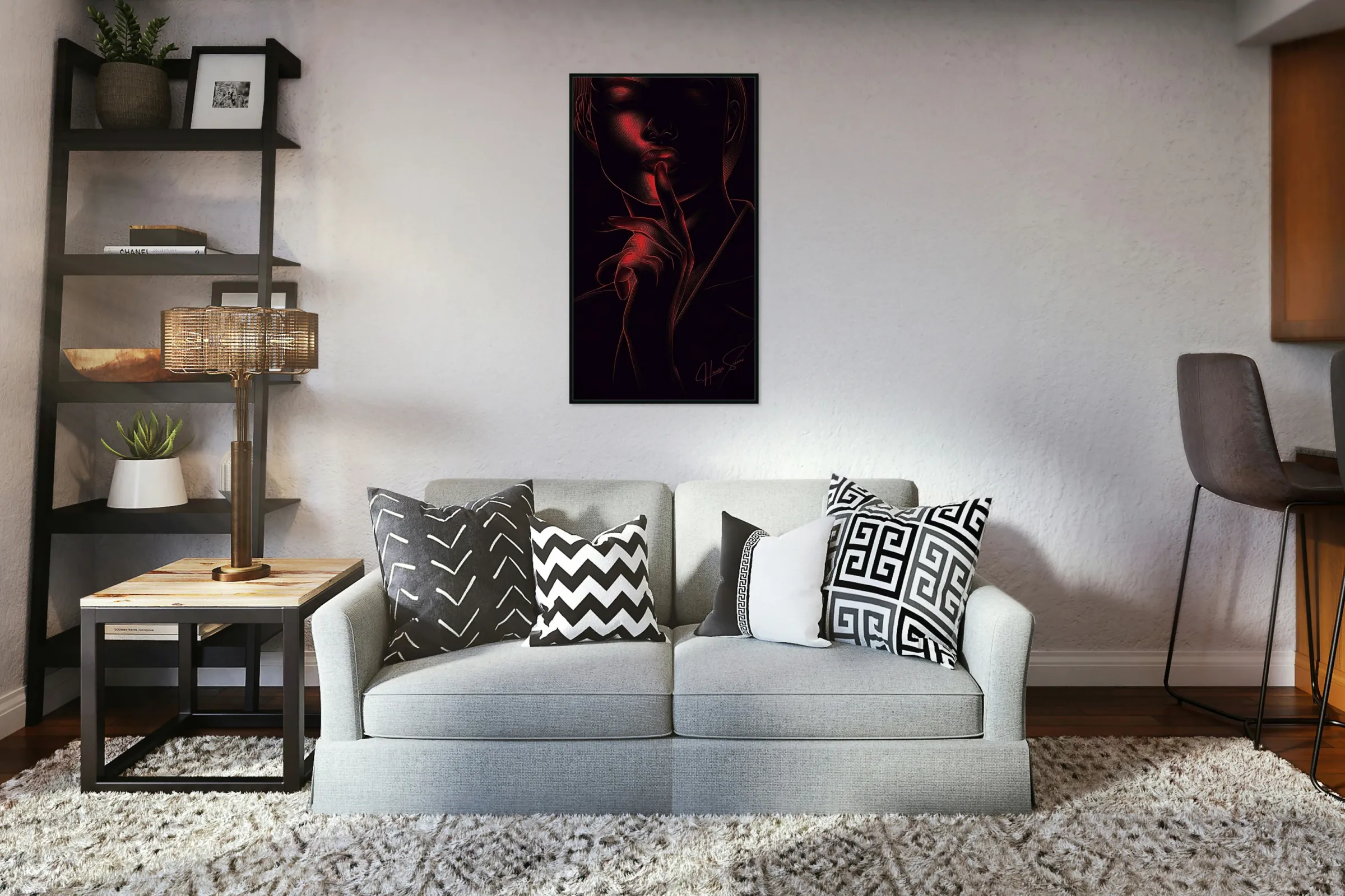 A whisper turned weapon. This piece embodies restraint—how silence can slice sharper than speech. The curve of the lips and the poised finger represent control, self-awareness, and the art of letting noise reveal its own ignorance. Red light hints at tension, passion restrained, the quiet before eruption.
